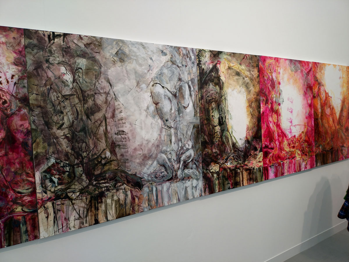 An offering presented by 56 Henry – that’s the gallery name, it makes you think of Hoxton’s No Parking don’t it, or that place way out in that vast building in Leytonstone where that lens based artist had that show, Photos of Other People’s Photos, you know the place, that one time car repair shop still covered in oil stains, that place where Bethany the Gallerina worked (that William Boyd was on about). Anyway, 56 Henry are presenting Jo Messer and all those layers of narratives, her blurring, is that the Last Supper in there in the layers of beautiful colour that I can’t photograph, the line between, hang on – “The artist will present three new works; two triptychs and a polyptych. Panels in disparate colours will be strung together, each one echoing the last as the figures blur into a frenzied abstraction” – I added the u to colors there just so it reads properly, don’t come over here dropping your letters from the King’s English. I love these pieces, I love that I can’t quite see where one ends and the next one starts, that the layers needs to be searched through, that the lines are delicious, that bodies are implied, many things are implied, so much in there, nothing obvious… This is the thing about Frieze, whatever you or indeed I might be thinking about the whole thing, whatever we might be thinking, there’s always something, there’s always several things, there almost always enough art to make it worth the time and effort and yes there’s whole debates to have, I’ll do that tomorrow, right now I still have Jo Messers big pieces in my head, I have those layers, I still have Peter Uka’s brilliant people paintings of Lady May and the others, I have that blackness of Lee Bae, that Lee Bae sculpture is so powerful, his charcoal… love these Jo Messer pieces, love the layers, my photos are rubbish, they’re far more alive than any photos will have you believe they are. Those Jo Messer pieces really stood out, had to go back for more on the Friday, had to spend more time just looking at them, there’s real guts here…”