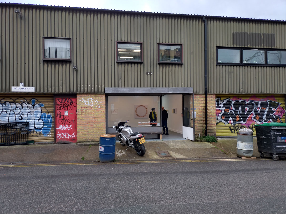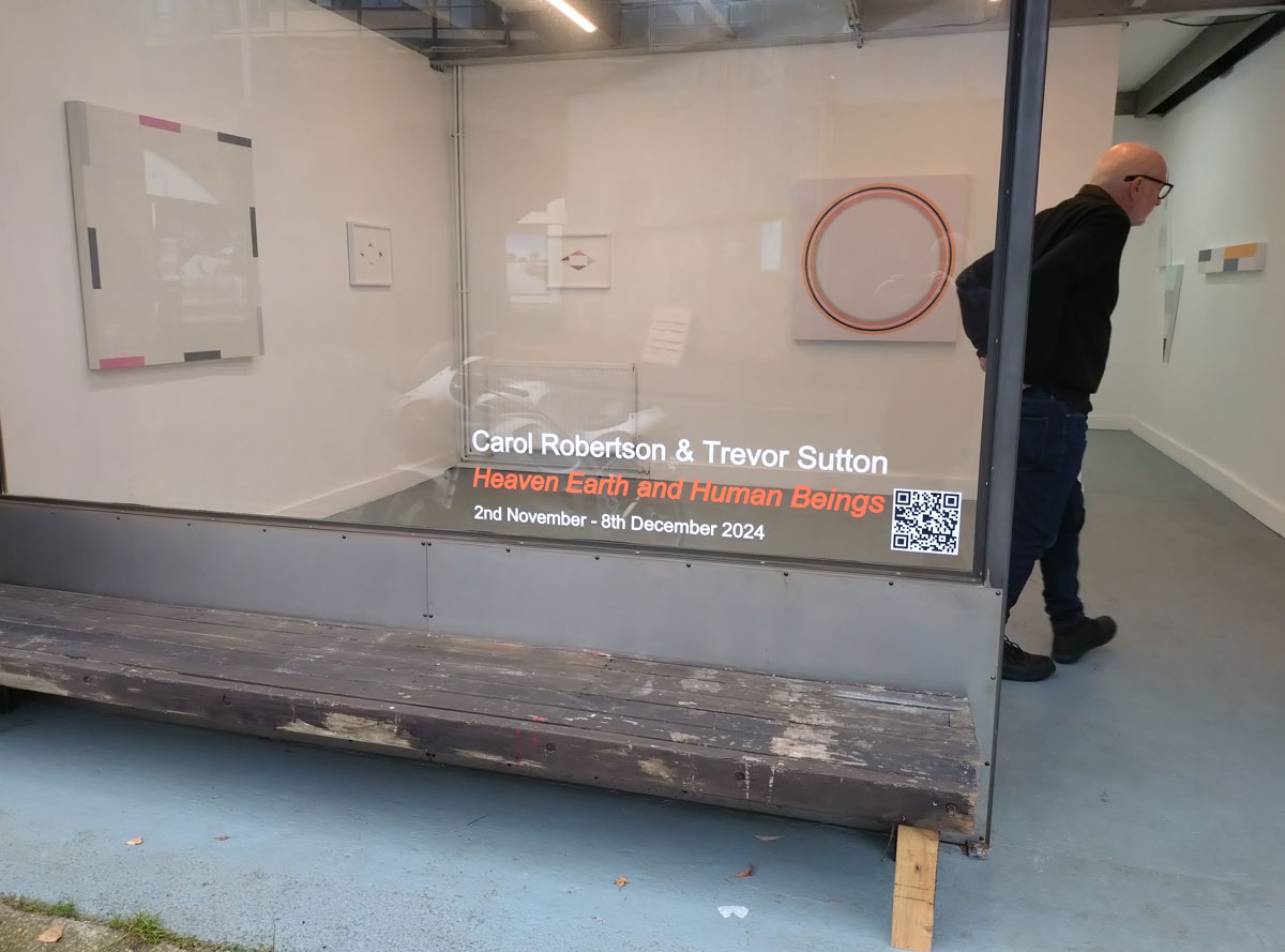 Carol Robertson and Trevor Sutton, Heaven Earth and Human Beings at The Grey Gallery, November 2024 – We asked in the preview if reductive geometric abstract paintings do it for you? I guess it does all depend on moods but then doesn’t everything? My mood is mostly messy, clean lines are for others to paint, do like a clean line though, “The title of this exhibition takes its meaning from ancient wisdom, believing Heaven = the Circle, Earth = the Square and Human Beings = the Triangle. ( Korean Cheonbu concept of the Dangun era)”. We’re over in that no man’s land between Hackney’s very busy Mare Street and the relative tranquillity of London Fields, in a rarely used space (Hey, I’m at galleries more than most people, we’ve been here in Hackney longer than most now, I wasn’t really aware of this space), a small 80s flavoured industrial unit that’s usually hidden by a badly grafittied shutter.