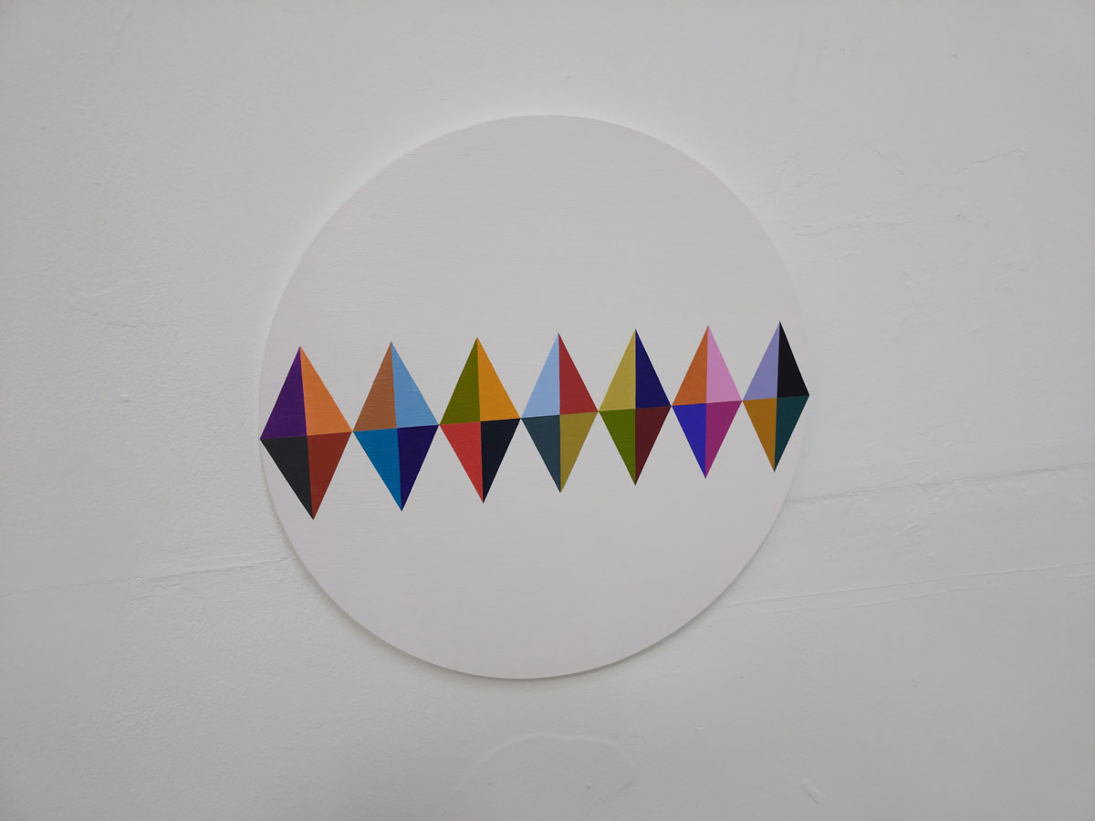 “London artists Carol Robertson and Trevor Sutton have lived and worked side by side in Hackney for 40 years, producing reductive geometric abstract paintings, prints and works on paper. Both use the circle square and triangle and both artists absorb a take on life re-ordered by careful geometry and associative colour: their work is never entirely disconnected from the real world. Robertson works with a variety of geometric formations but particularly circles, for their ideal power, their aesthetic beauty. Sutton has also worked with many different shapes and forms but is currently using triangles or working within the architecture of the grid. At Grey Gallery they bring together a mix of paintings and works on paper that explore the beautiful geometry of circle, square and triangle”.