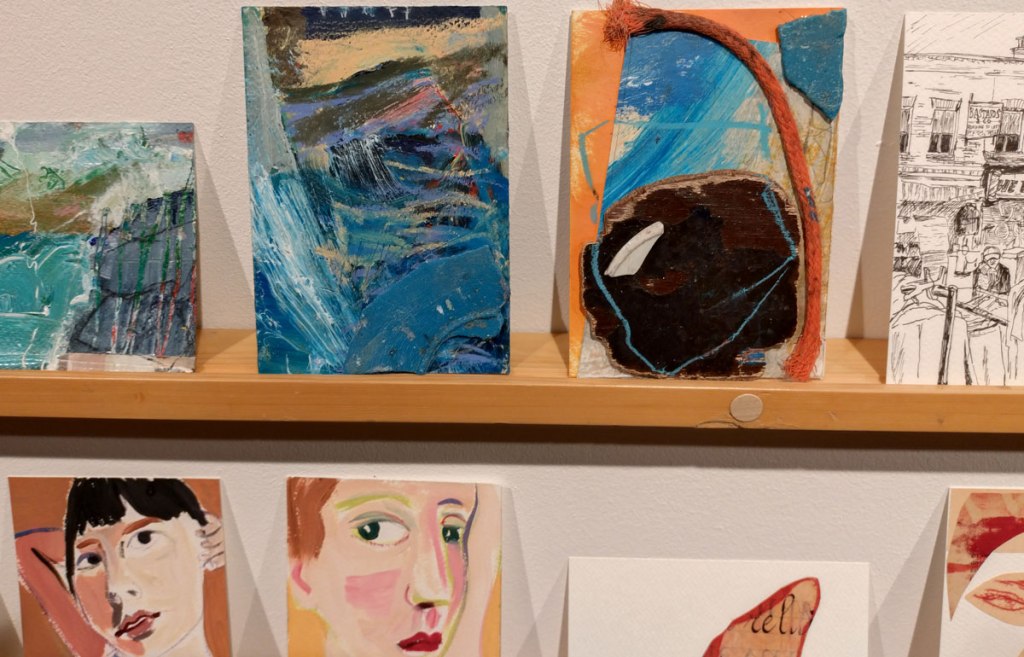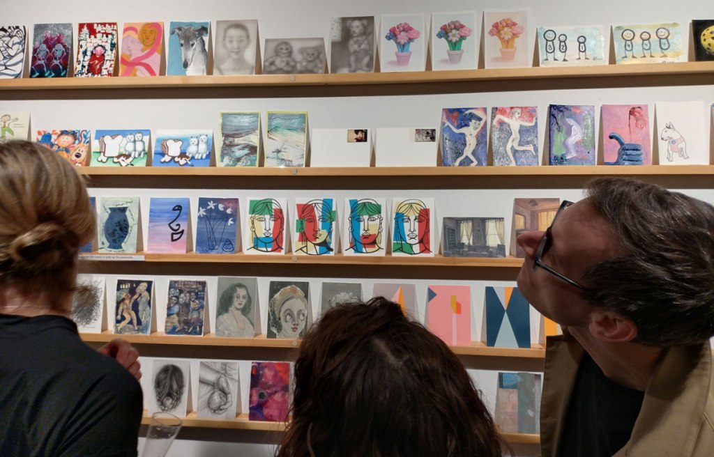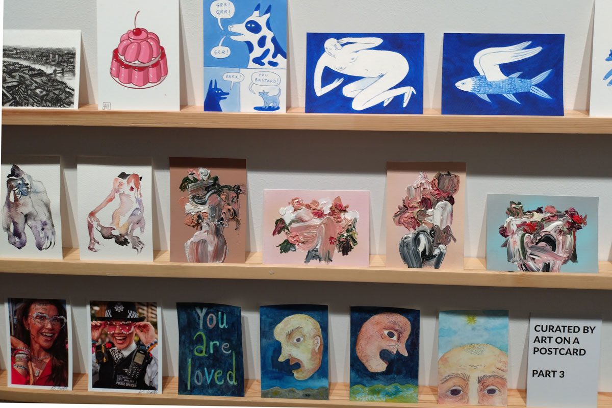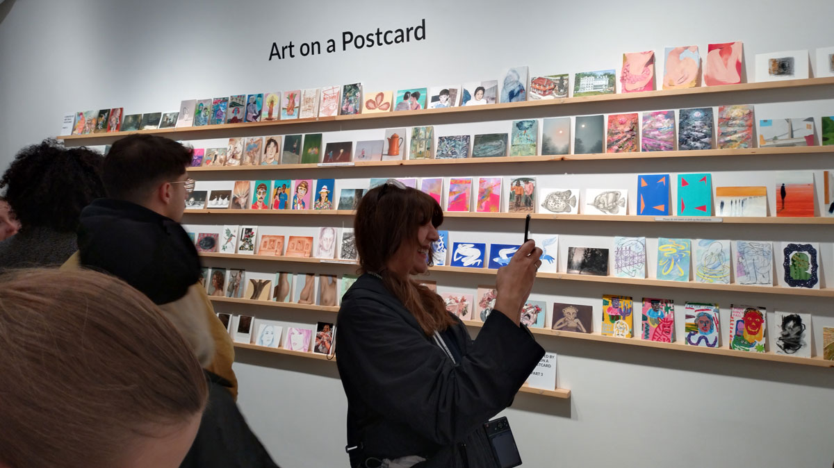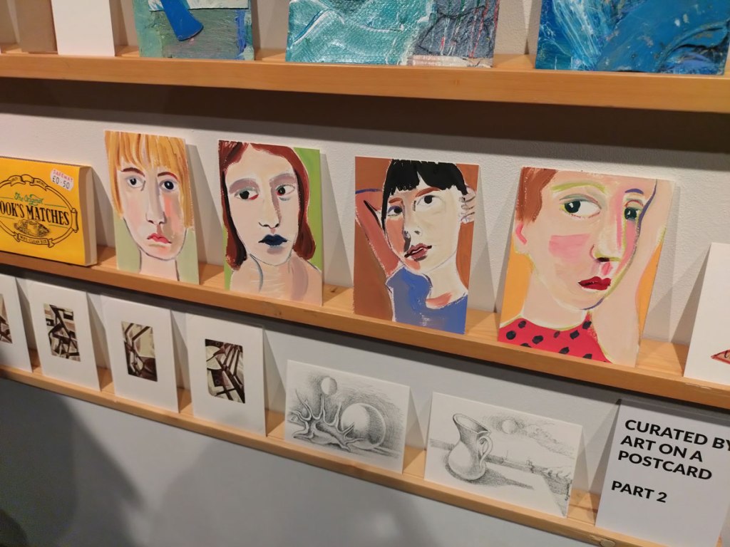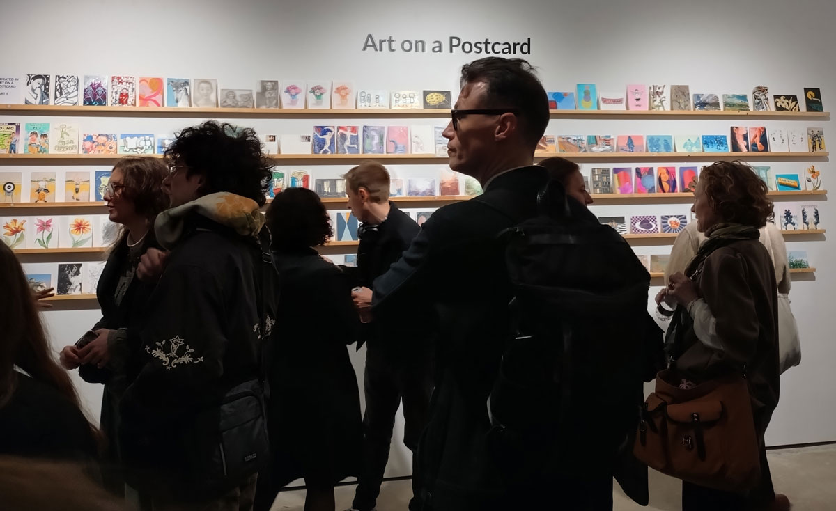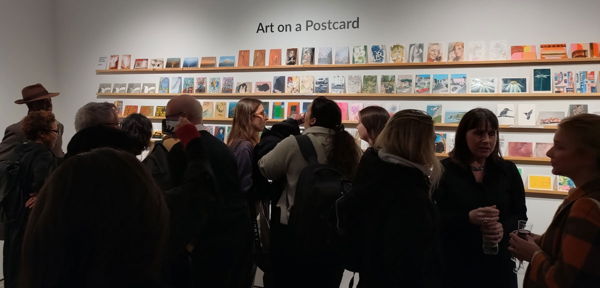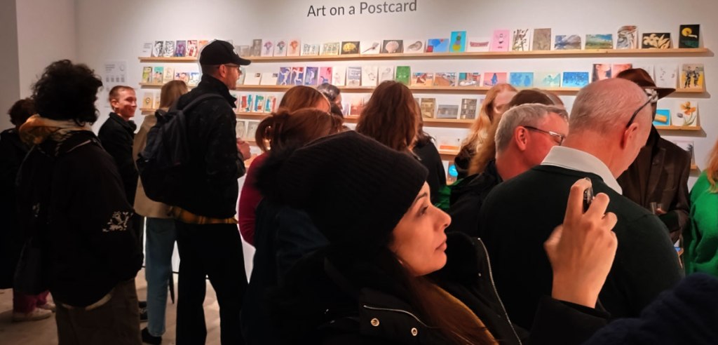 This is the biggest Art on a Postcard auction yet, I do hope they haven’t overstretched themselves, money is tight right now. You’ve got over six hundred pieces of art to explore, bidding is all via the Art on a Postcard website and well do go explore, some of the pieces will sell for silly prices, others will be waiting for just that one bid, there really is something for everyone there. One thing though, looking at art on a website is a little flat, these pieces are all at least ten times better when viewed in the flesh, they need to be seen in real life where the colour pops and the piece talk and the texture lives rather than in the dull of a lifeless website, mat I politely suggest some of the event photos here at the foot of this page might tell you a little more than just looking at the images on the actual auction site?