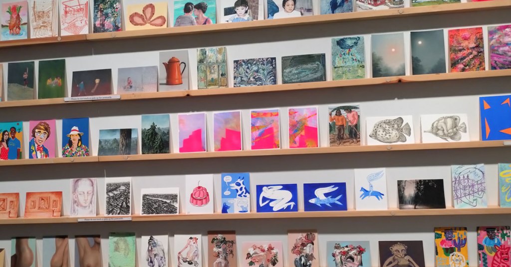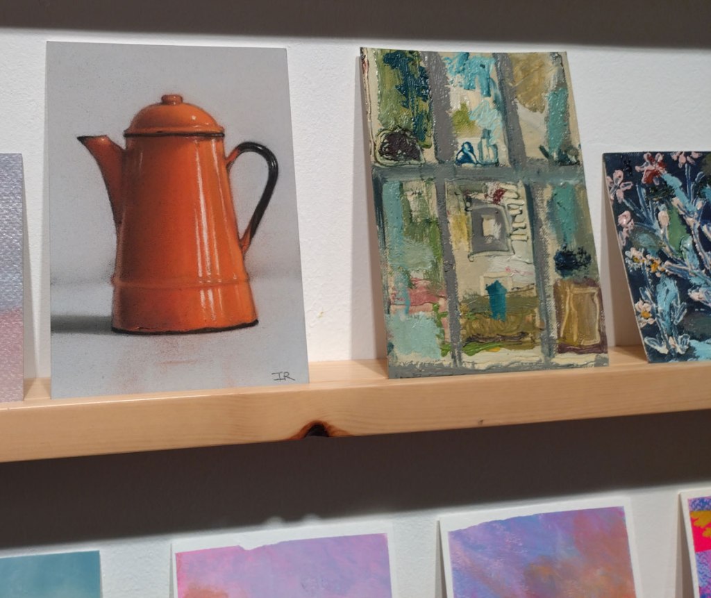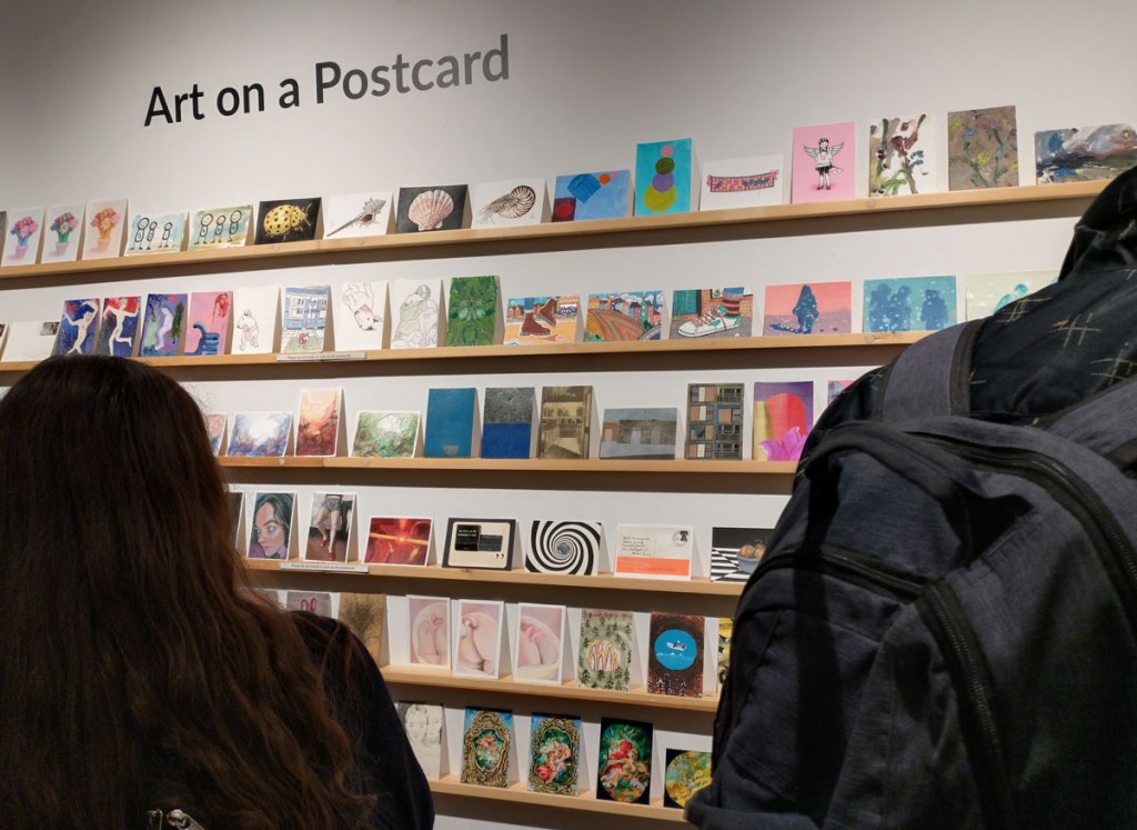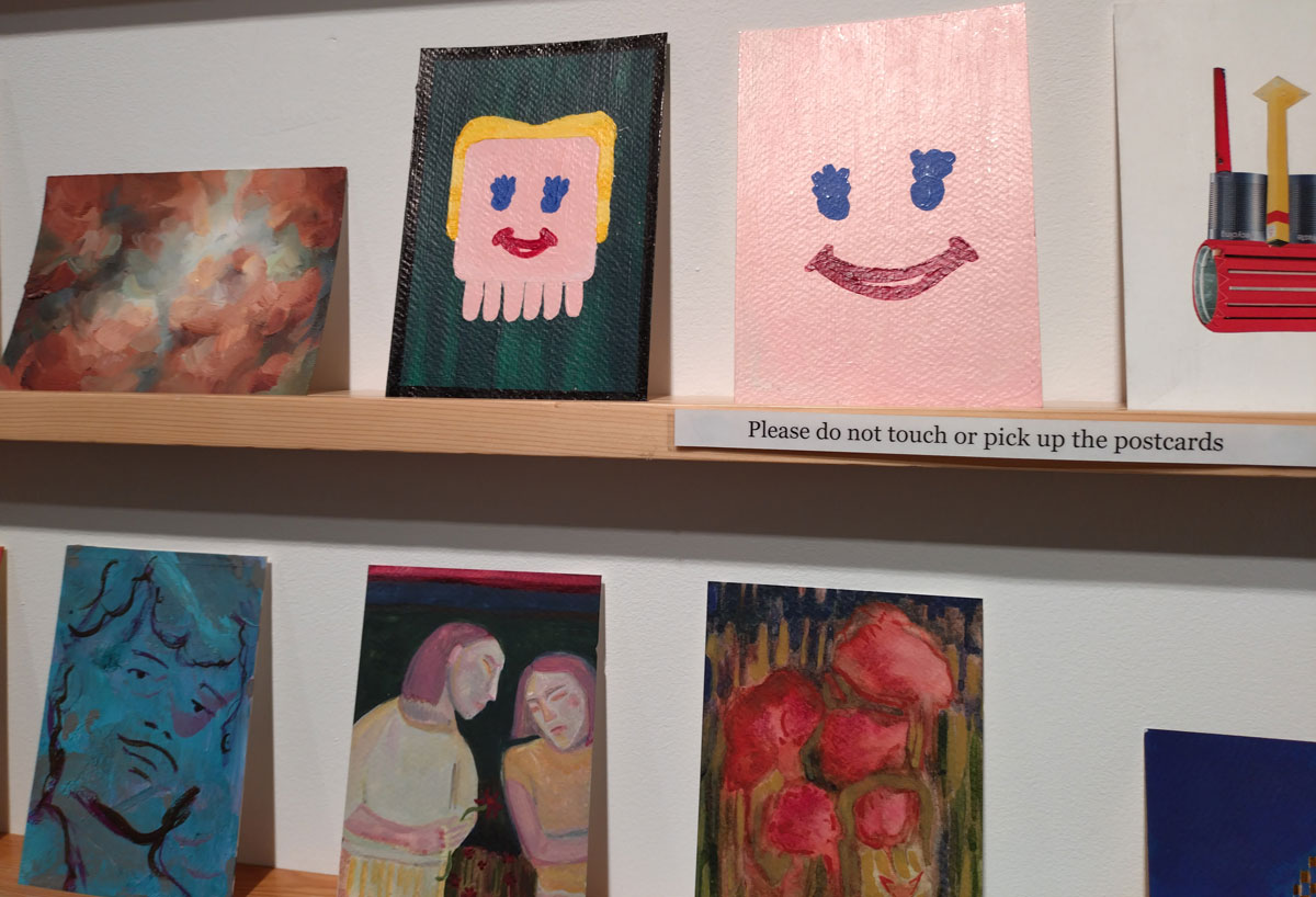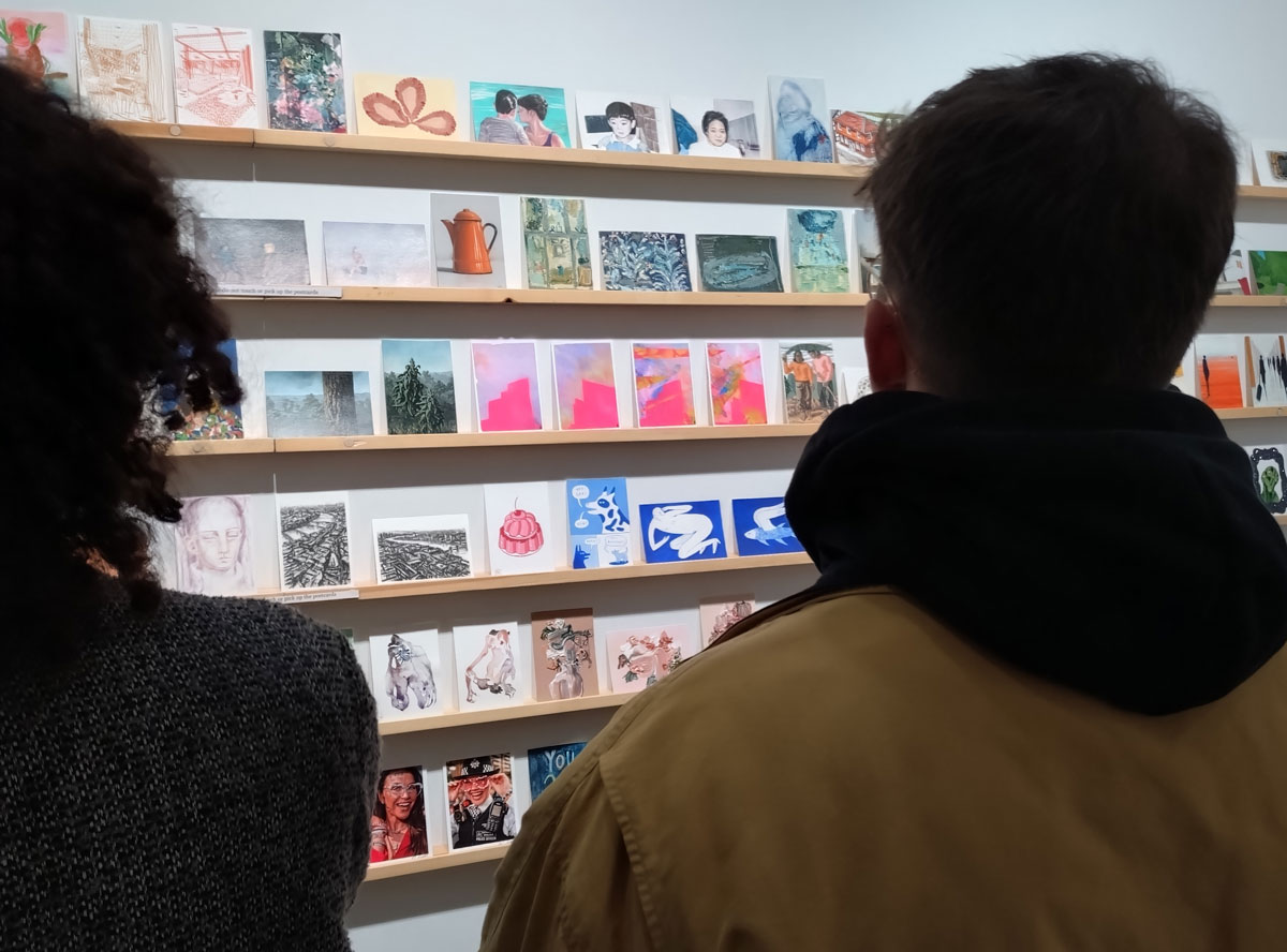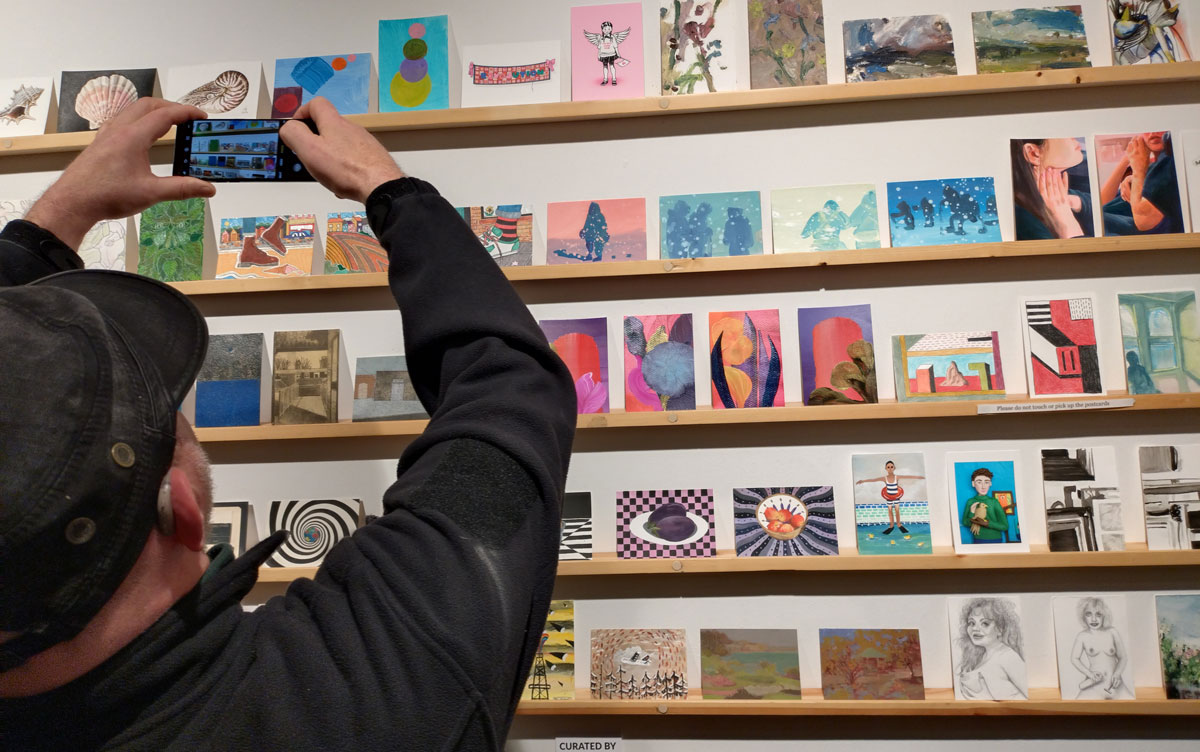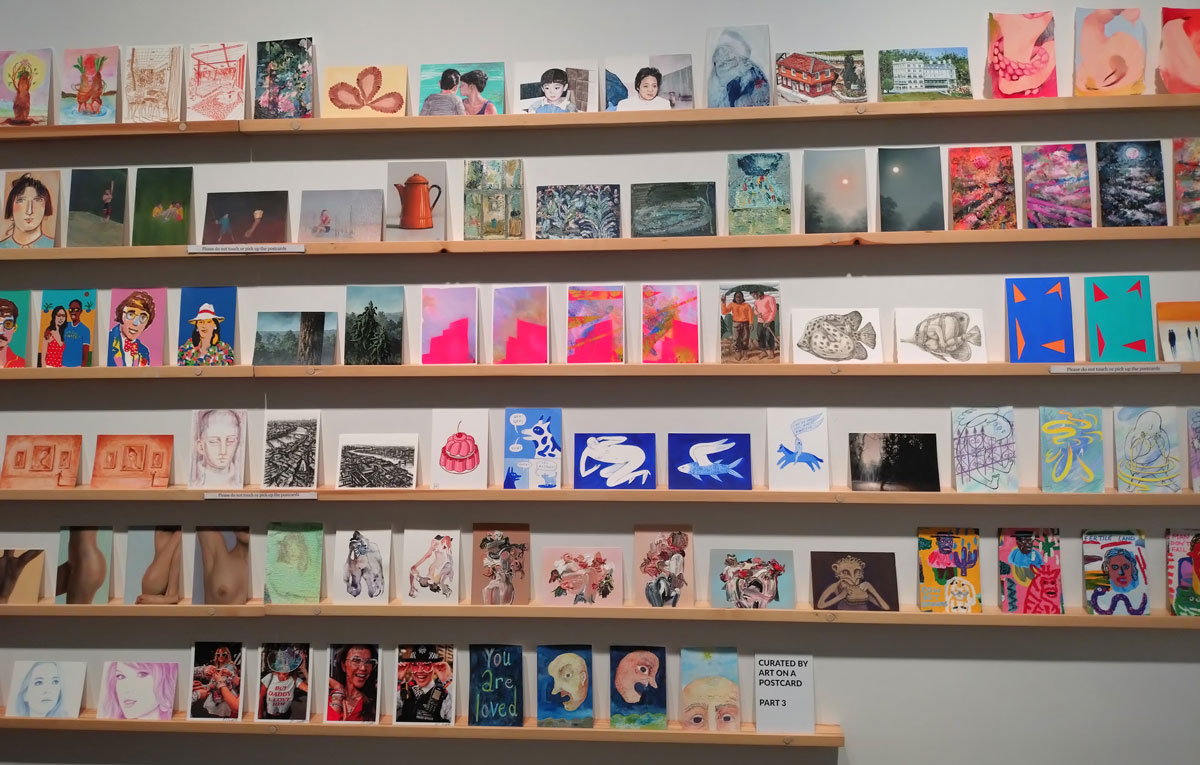 This is the biggest Art on a Postcard auction yet, I do hope they haven’t overstretched themselves, money is tight right now. You’ve got over six hundred pieces of art to explore, bidding is all via the Art on a Postcard website and well do go explore, some of the pieces will sell for silly prices, others will be waiting for just that one bid, there really is something for everyone there. One thing though, looking at art on a website is a little flat, these pieces are all at least ten times better when viewed in the flesh, they need to be seen in real life where the colour pops and the piece talk and the texture lives rather than in the dull of a lifeless website, mat I politely suggest some of the event photos here at the foot of this page might tell you a little more than just looking at the images on the actual auction site?