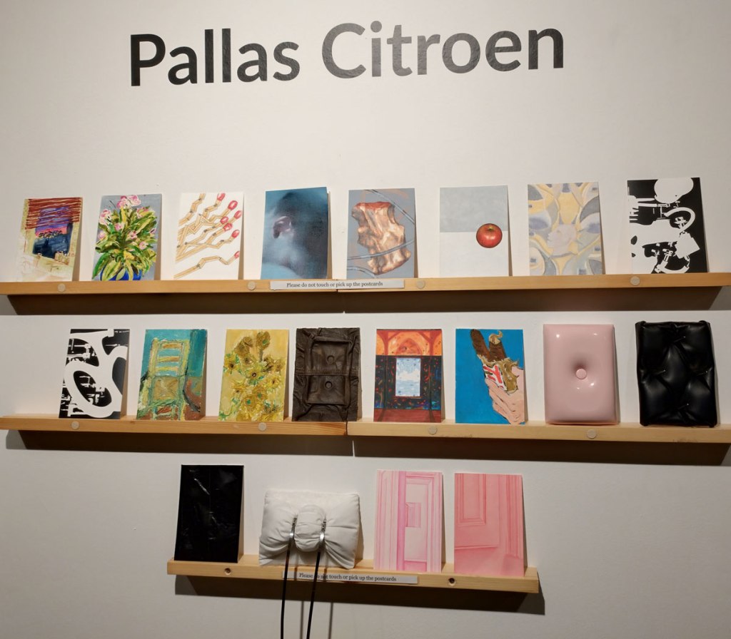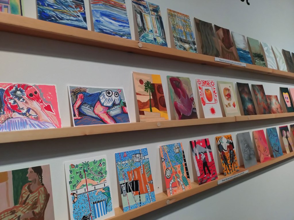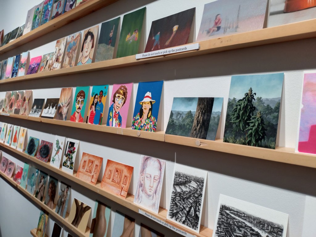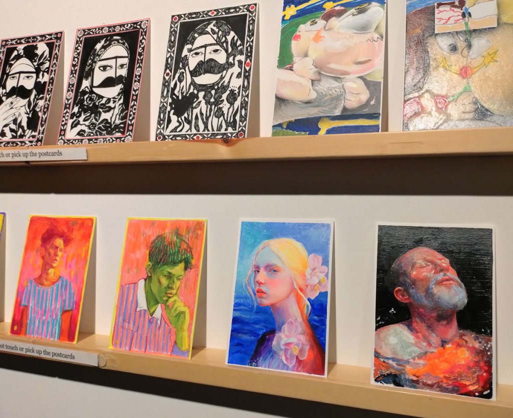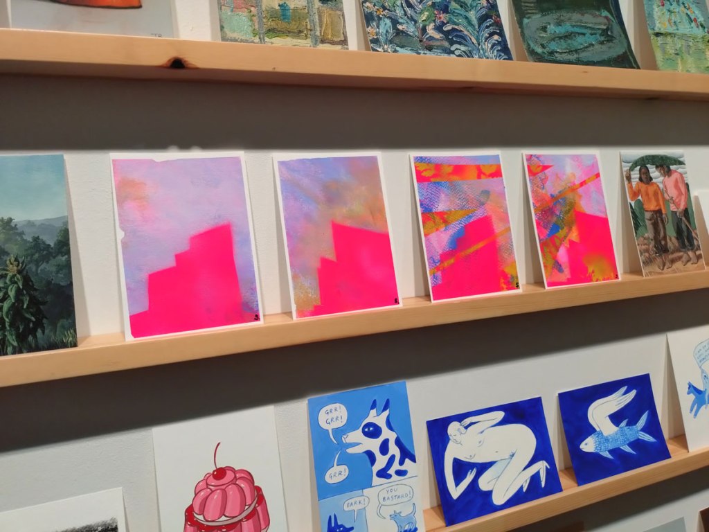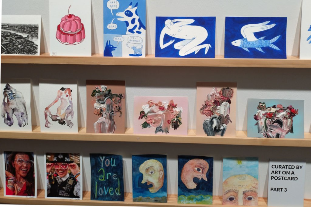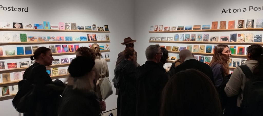 Art on a Postcard at Gathering, Soho, London, november 2024 – Tuesday night, take the Lizzy Line again, off up West, another night, another so called Private View, no I don’t know why they’re called Private Views either, most unwelcoming, tonight the reason for riding the Lizzy again is the one night only viewing of the art to be found in this year’s always rewarding Art On A Postcard Winter Auction. This year we’re at Gathering, a gallery just about on the Soho side of Regent Street so we’re battling the way-too-early Christmas lights and those damn trike things that want to blind you with neon while they blast endless Abba crimes at you, the West End at this time of year is some kind of hell, yet we seem to have to travel in more and more as London’s art scene falters and the establishment takes an upper hand while the new gatekeepers strangle the life out of almost everything else.