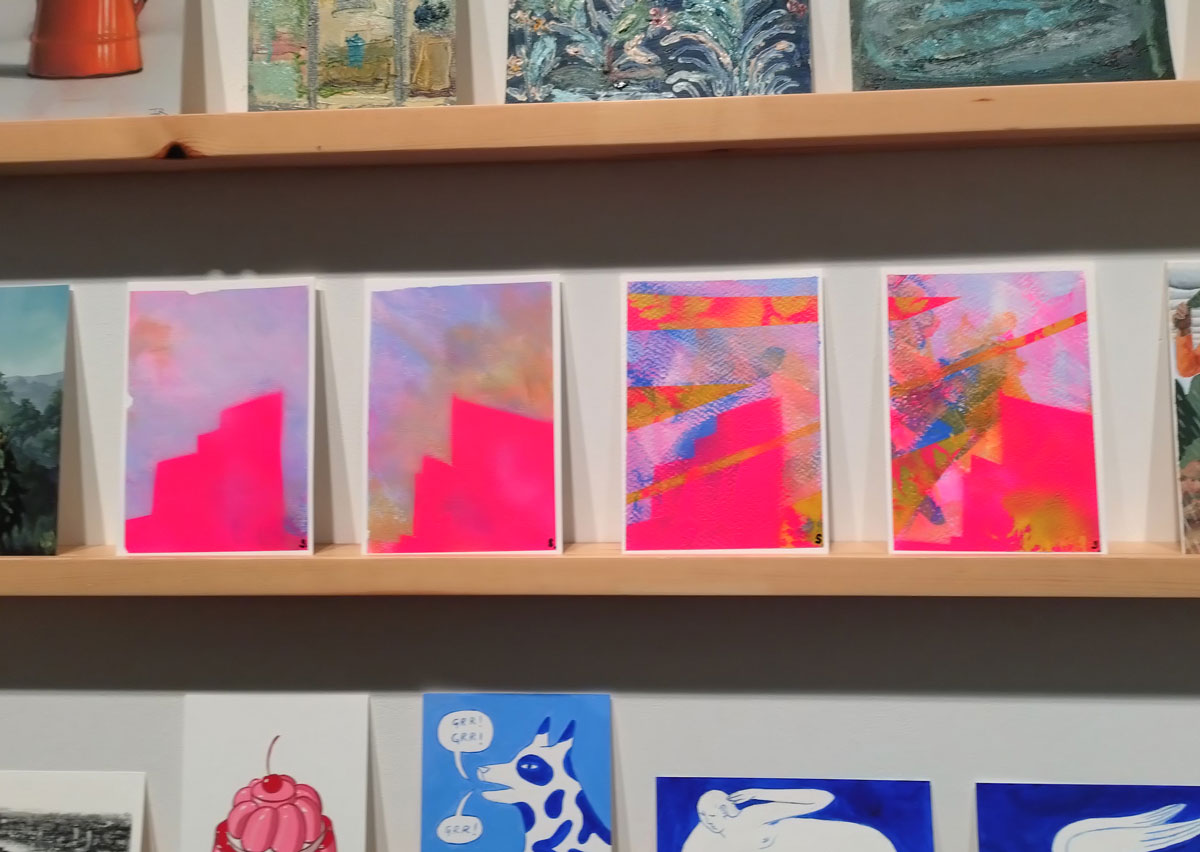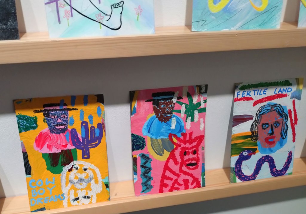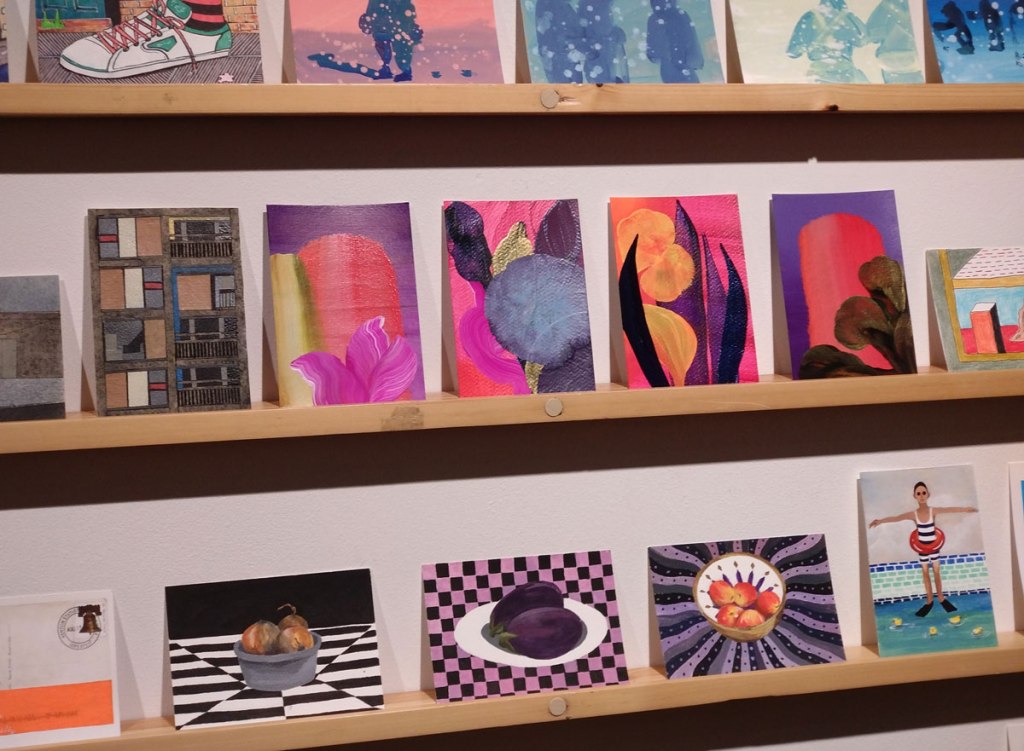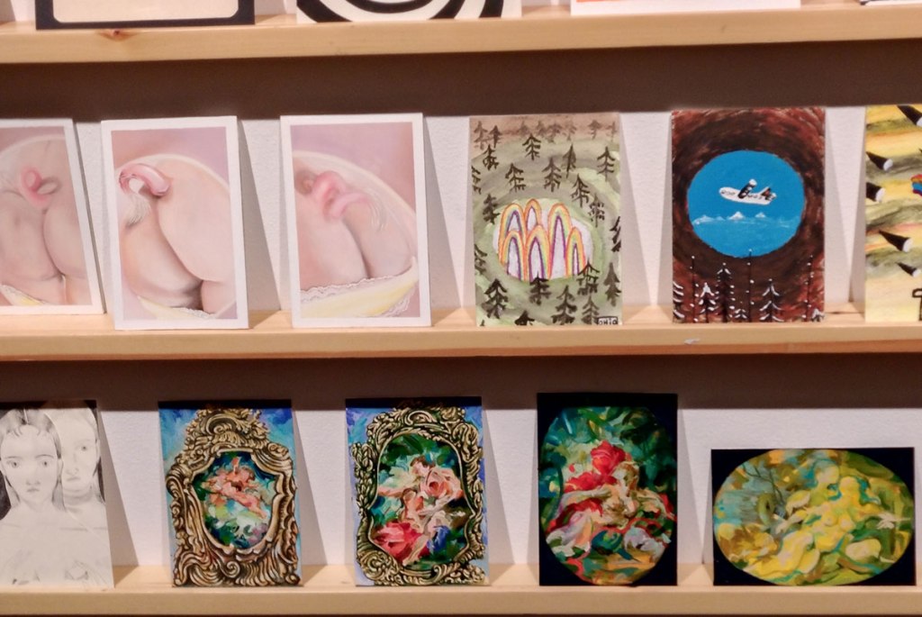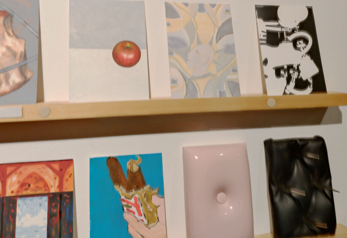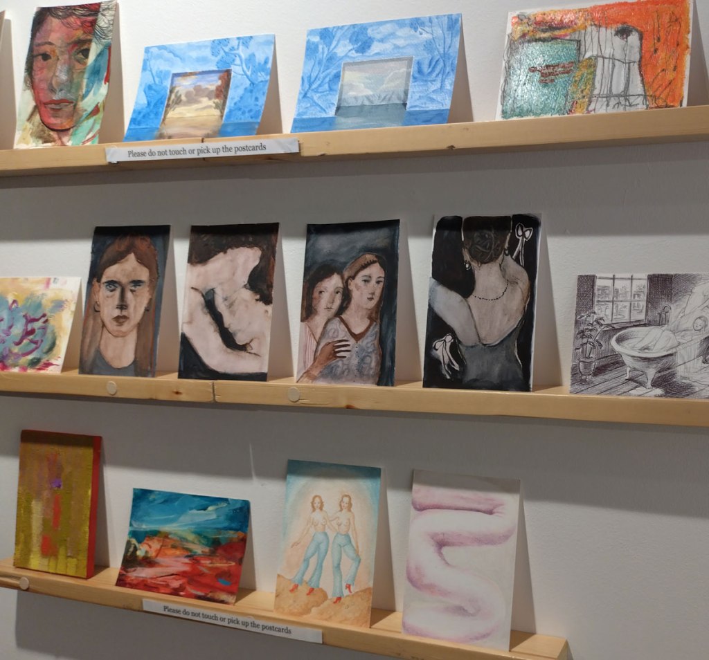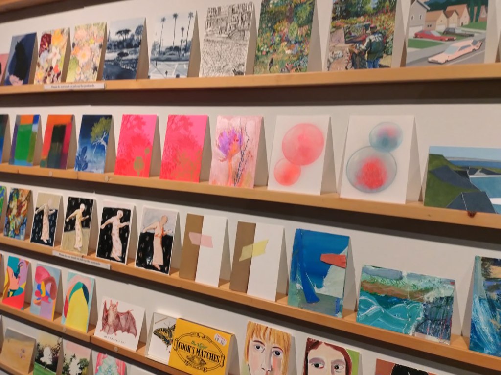 Art on a Postcard at Gathering, Soho, London, november 2024 – Tuesday night, take the Lizzy Line again, off up West, another night, another so called Private View, no I don’t know why they’re called Private Views either, most unwelcoming, tonight the reason for riding the Lizzy again is the one night only viewing of the art to be found in this year’s always rewarding Art On A Postcard Winter Auction. This year we’re at Gathering, a gallery just about on the Soho side of Regent Street so we’re battling the way-too-early Christmas lights and those damn trike things that want to blind you with neon while they blast endless Abba crimes at you, the West End at this time of year is some kind of hell, yet we seem to have to travel in more and more as London’s art scene falters and the establishment takes an upper hand while the new gatekeepers strangle the life out of almost everything else.