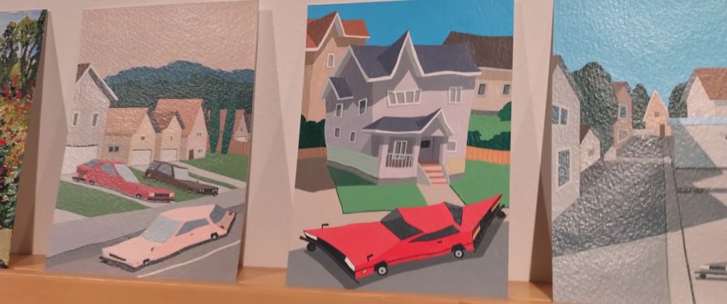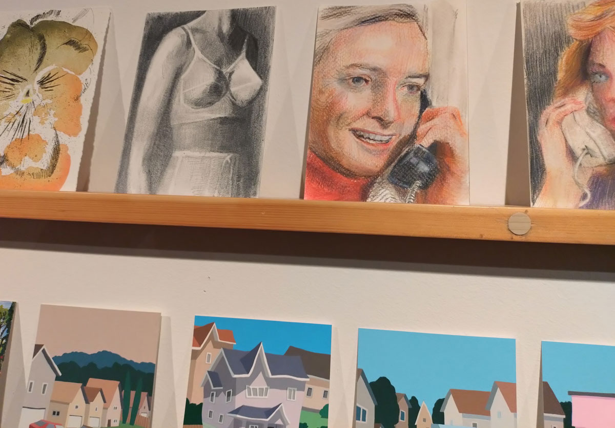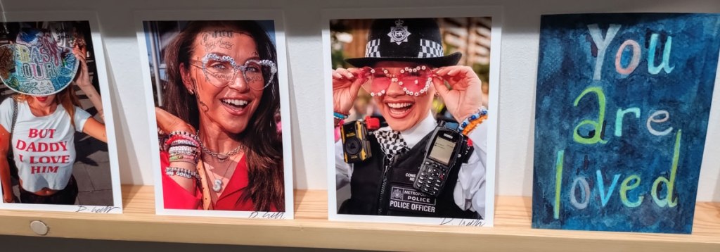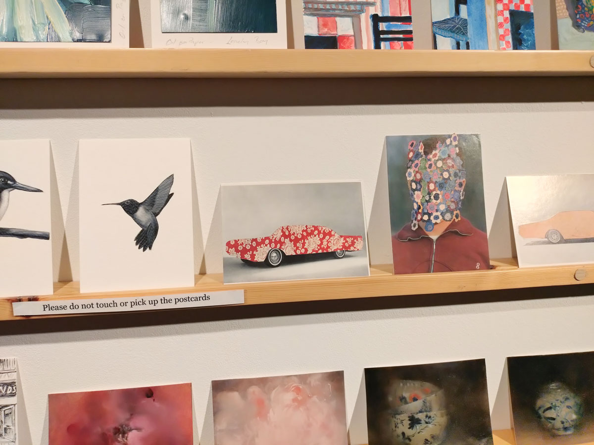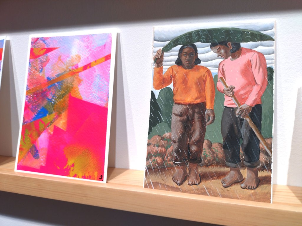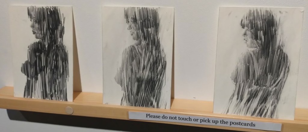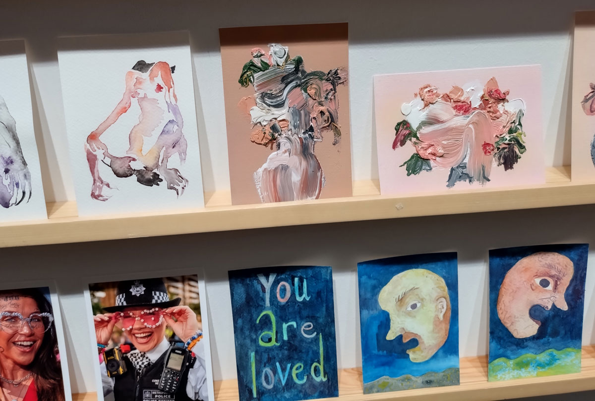 Art on a Postcard at Gathering, Soho, London, november 2024 – Tuesday night, take the Lizzy Line again, off up West, another night, another so called Private View, no I don’t know why they’re called Private Views either, most unwelcoming, tonight the reason for riding the Lizzy again is the one night only viewing of the art to be found in this year’s always rewarding Art On A Postcard Winter Auction. This year we’re at Gathering, a gallery just about on the Soho side of Regent Street so we’re battling the way-too-early Christmas lights and those damn trike things that want to blind you with neon while they blast endless Abba crimes at you, the West End at this time of year is some kind of hell, yet we seem to have to travel in more and more as London’s art scene falters and the establishment takes an upper hand while the new gatekeepers strangle the life out of almost everything else.