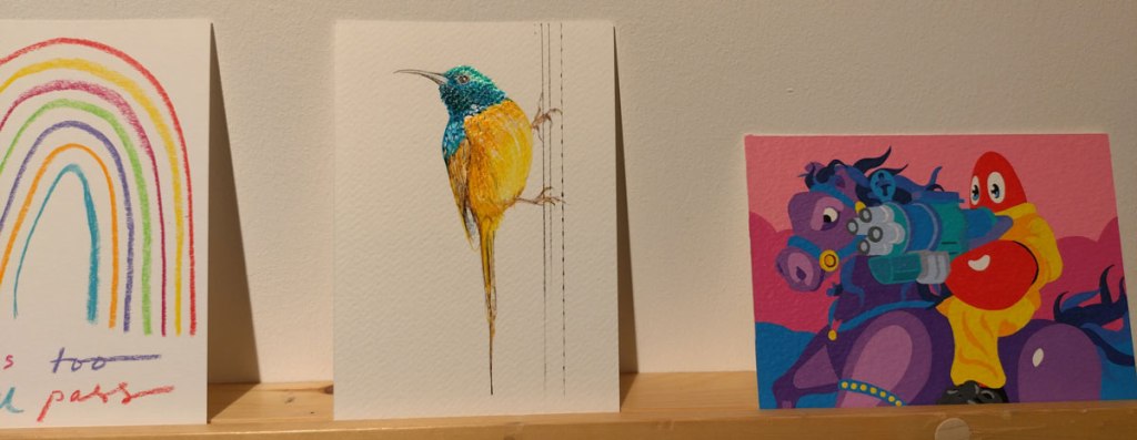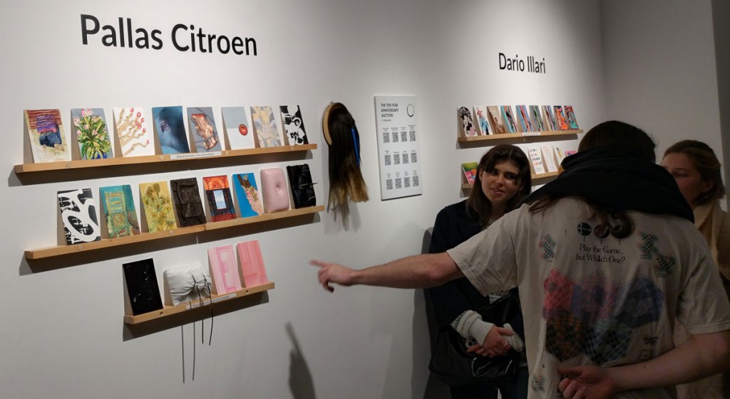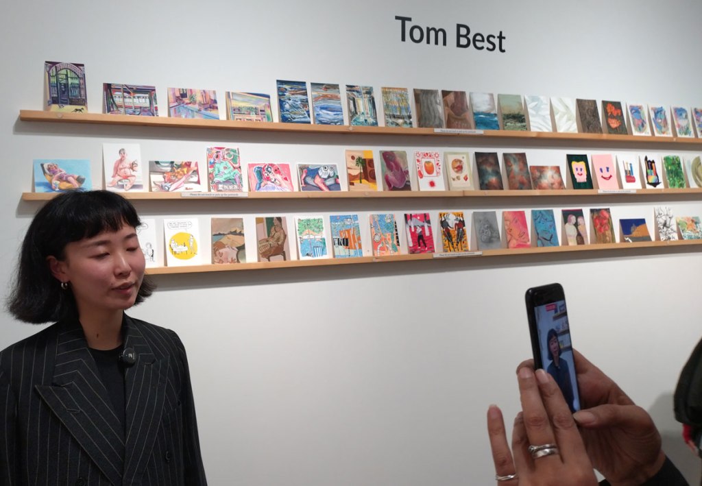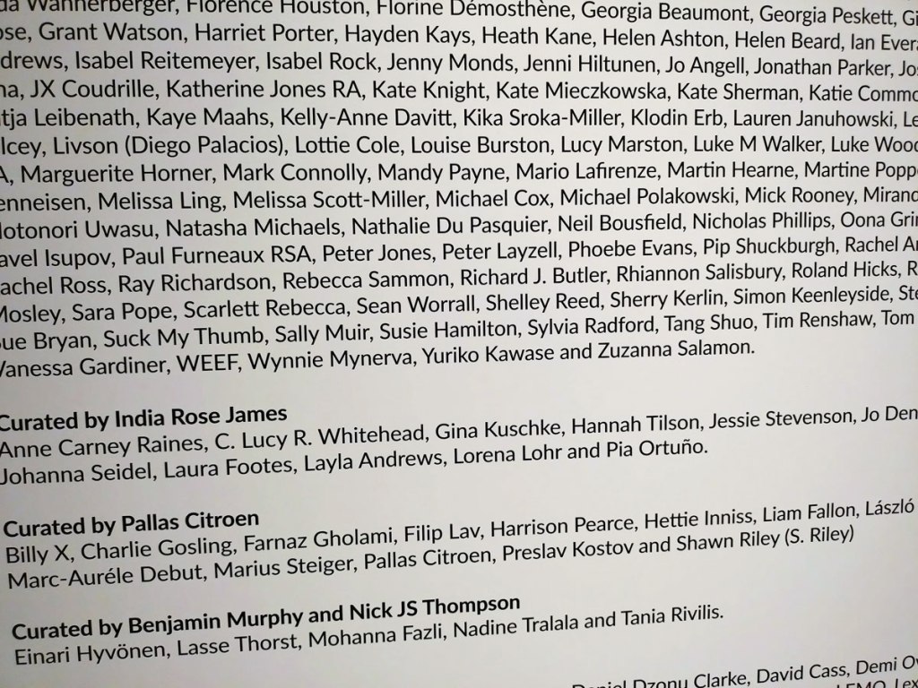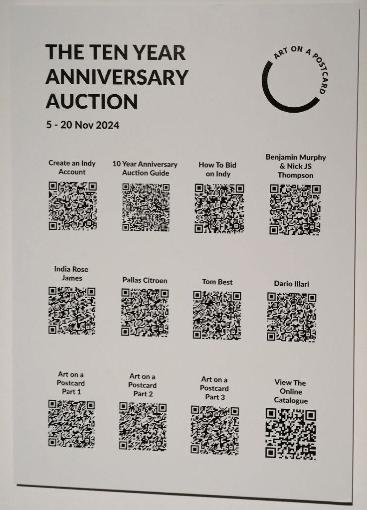 “Bidding in our Ten Year Anniversary Auction is now live! We would like to thank you for ten years of support whether you have been with us from the start or you’ve joined us along the way. There are 613 artworks for you to explore across our guest curator’s auctions as well as our own Art on a Postcard auction curated by Gemma Peppé, split into three parts. A huge thank you also goes to our guest curators who have helped to make this such as a special auction – Benjamin Murphy & Nick JS Thompson (Delphian Gallery), India Rose James (Soho Revue), Pallas Citroen (The Bomb Factory Art Foundation), Tom Best (The Auction Collective) and Dario Illari (Jealous Gallery)” – so yes, lots and lots to see, to explore, maybe too much, maybe it is all a little overwhelming, and I’m walking back up Regent Street thinking damn, I didn’t even see what’s her name’s paintings, did I? And now I’m looking at the bag of photos and thinking I don’t remember seeing that one on the night, who’s is that one? I really hope Art On A Postcard haven’t over-stretched themselves here, I really hope there isn’t too much, there was so much, there were so many good pieces…
