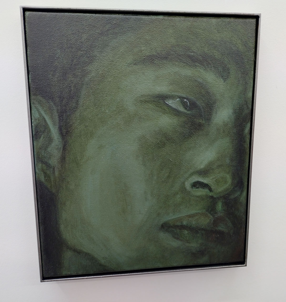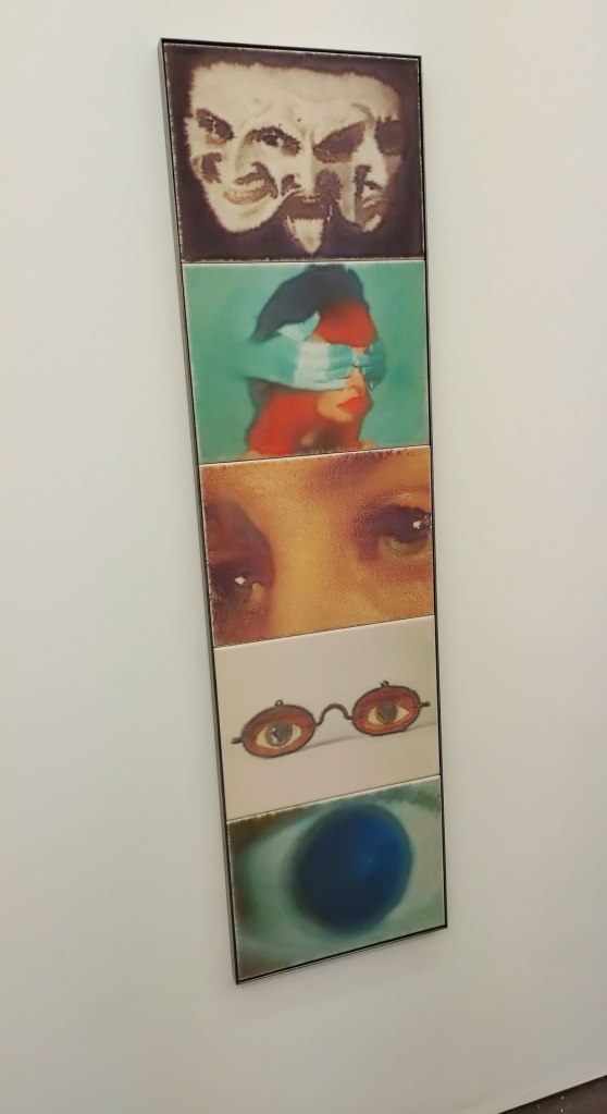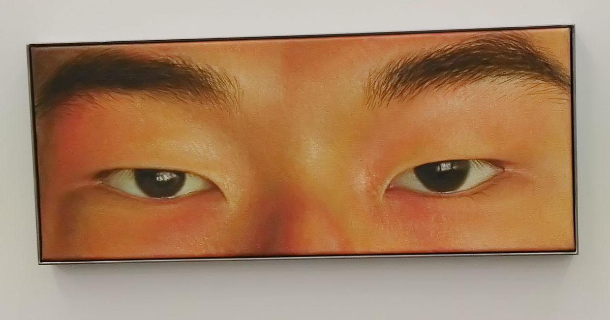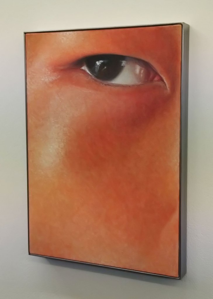 Sang Woo Kim’s room full of self-portraits, well mostly a room full of eye portraits, pieces painted in several ways, sometimes textured with broken brushstrokes, sometimes smooth and almost dangerously close to being photorealistic, at other times kind of gestural, a whole bag full of paintings all focused on his eyes, one painting looking right at you, another maybe looking beyond you or avoiding you the viewer. Eyes that reflect, so he says, a desire to “reclaim agency” over his racialisation as a Korean man in British society. It is all about Kim’s eyes, his eyes are everywhere, closed cropped eyes, eyes as a repeated motif, repeated in the variety of styles found in his different paintings, eyes that question, eyes that maybe accuse? I guess his epicanthic folds, something once widely ridiculed by the West, are now seen by many through the lens of an almost orientalist fetish. Indeed we’re told “Kim’s emphasis on his eyes are an attempt to encode a different set of significations beyond their Otherness: of a more complicated meeting between racism, objectification and the struggle against these forces. Here, in Kim’s debut solo exhibition in London, the contrast between his eyes and those of others—held open by a speculum, gazing away from the viewer, staring in amazement at something beyond the frame—suggests a multidirectional spectatorship between the artist and his milieu in the imperial metropole” – I mean it is a show that questions, a show that questions many things, a show that addresses more that questions maybe? I mean paintings of your own eyes, I wouldn’t want to do it – actually there was a moment during the packed opening and all the congratulation being offered when our eyes met, just for a brief second, the artist himself, not his paintings, just a brief second, a deliciously awkward moment before heads turned away and normal service was resumed like it needs to be here. Sang Woo Kim’s eyes were the nearest thing to a challenge, to a bite, to a kick, to something more than a half hearted so what.