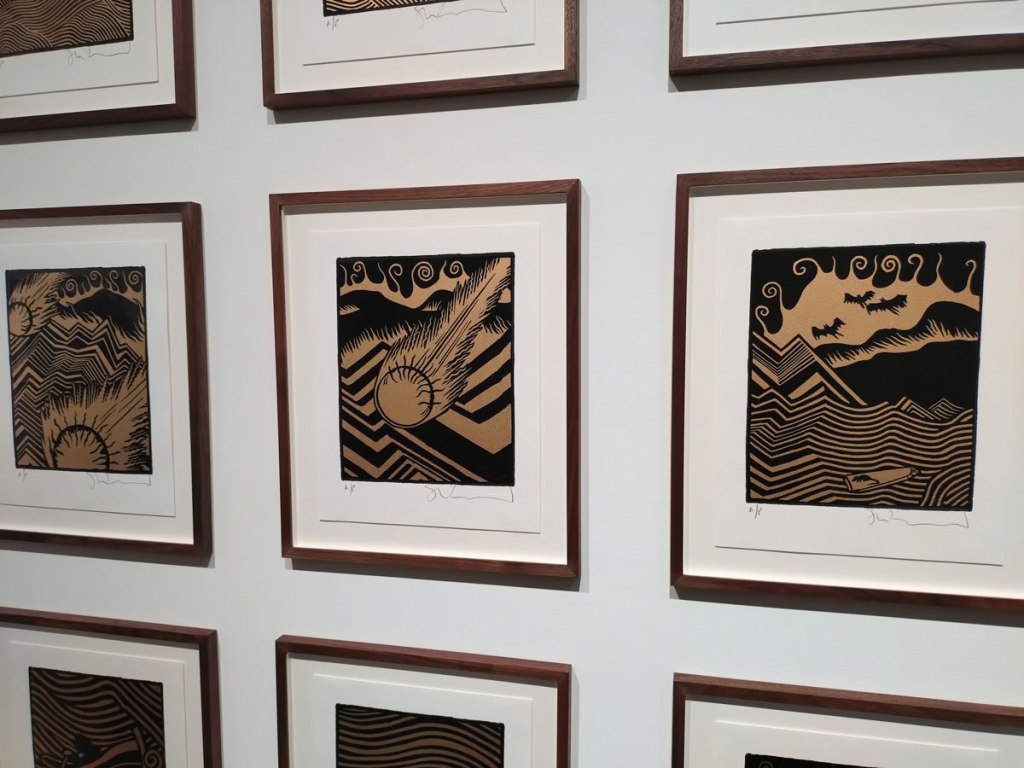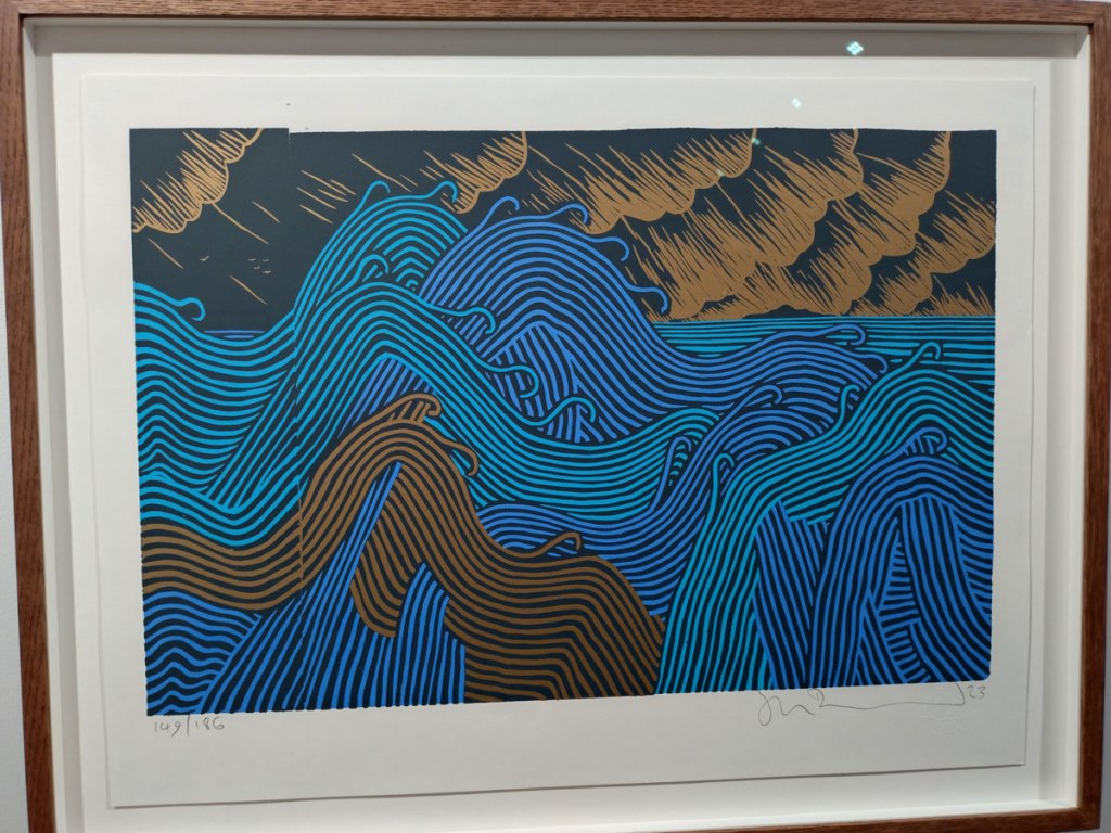 There’s a reasonably large Lithograph hanging over there (76x76cm), certainly a little larger than an album cover, a piece that will be immediately familiar to those who have been exploring the latest album from Tom Yorke’s other rather rewarding band The Smile – indeed this review or whatever it is, is being written in the cold light of the afternoon after the night before back here in my own painting studio while January’s Wall of Eyes album, the first of two excellent albums The Smile put out this year, is being revisited. Actually the exhibition and the less pressurised flow of The Smile do fit well together and it is good to see the collaborative piece on a gallery wall rather than just as the cover of the excellent Cutouts album (an album that I rather expect will be featuring prominently in our end of year lists in about a month’s time). The art in Logical Absurdity isn’t so dark this time, not so stark, it seems to come from a more relaxed place or at least, even if there is a volcano or two, to have come together in a more relaxed way? Are volcanoes relaxing?