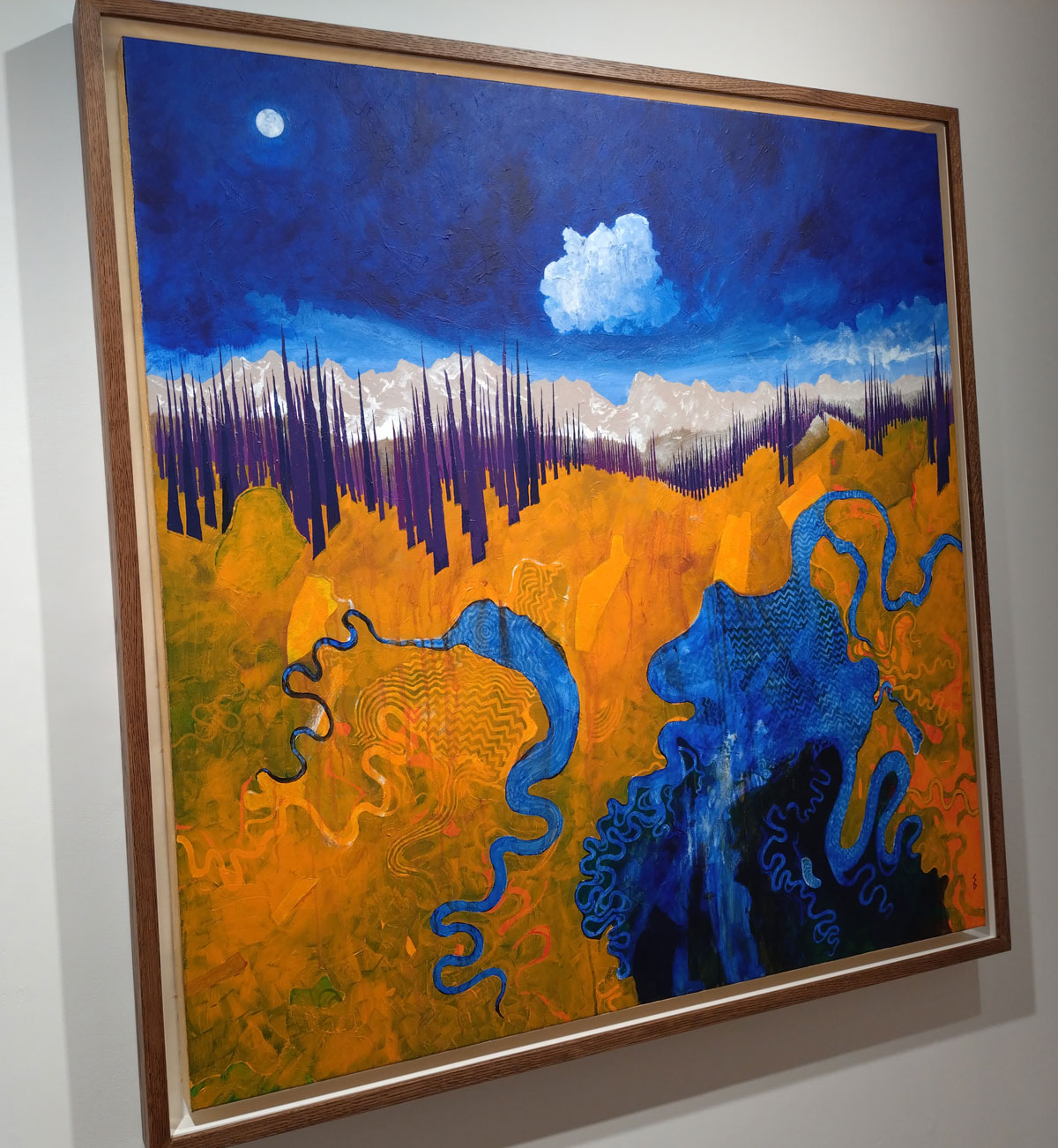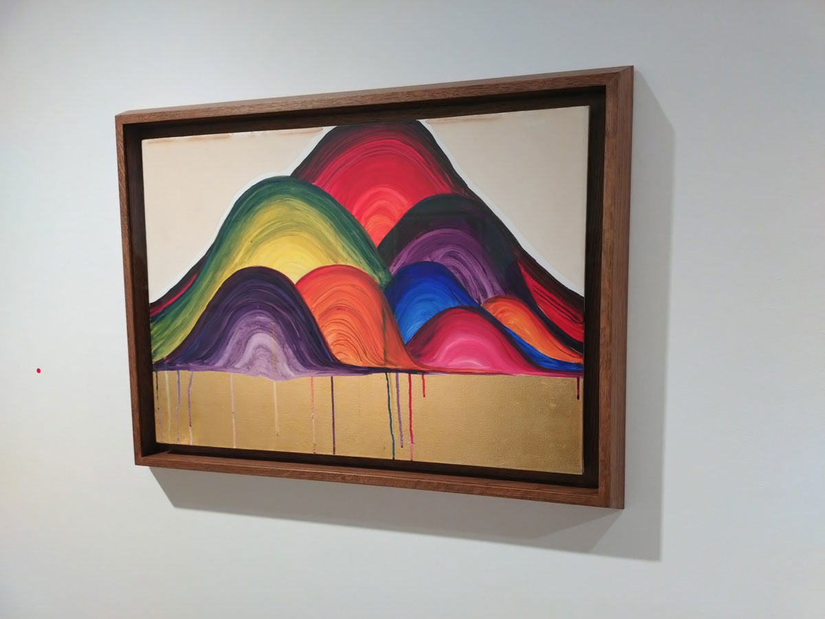 This is a strong exhibition, it hangs together really well as one body of work, an ongoing body of work, it isn’t that easy to see who has done what without referring to a catalogue, they clearly are informing each other in rather positive ways, creative journeys through “analogue mediums in an increasingly digital world”. Those two big Stanley Donwood paintings, A Lesser Evil and Dark Forces, both 120cm square acrylic on canvas pieces, both painted this year, both sharp, both strengthened by the rich contrast of bold colour, both intriguing in a rather different way, an unreal very real way, actually that might just be the overall feel in here, a slightly unreal very real feel. Topographical? Tales from a what?