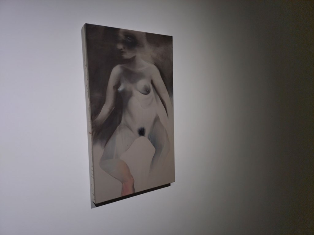 Now when you get over the first initial rush of seeing the big central work and you start to explore the narrative, the uneasiness, the pleasure if it is that? When you start to read it it, you soon realise you are not the only one looking, you may be the only person in the room, but there’s other figures, in the painting, in the painting and just looking and you are maybe not the only one who might be feeling a little a self-conscious here. Some of those figures are ghostly, distorted even? We don’t quite know what is going on, what is the embrace about? Is any of it obvious? Does it want to be? Sexual charged? Self-mutilation? It is a dark piece of work, these are dark pieces of work, dark in terms of the actual way it is painted, dark in terms of subject matter. A cloying atmosphere? Fragmentary? it is a vast piece, a brave piece, a strong piece, a statement piece and yes maybe it does feel a touch like a theatre stage and just as a painter, before you get to what she paints, Elsa Rouy has an interesting way of doing things, an interesting technique, or set of combined techniques that all come together a one whole in a strong strong way. I like her mark making, her brush movement. her painterly energy, her use of colour that isn’t always ‘nice’, her suggestions, expressions. Words like ‘nice’ or ‘like’ are the right ones here, hope you get the drift, some of this is… well no, you go see and decide what you feel it is, these bold paintings feel like things to quietly see for yourself, to engage with, they don’t feel like that want to be described, they don’t feel like they want someone like me telling you what I think although I think I did leave feeling rather positive about it all, about Elsa Rouy as a painter, and yes, as annoying as Guts are, they’ve done well here, they often do, this is a rather recommended exhibition. Watch out for Elsa Rouy. (sw)