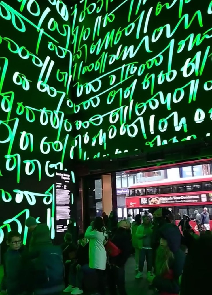 Sasha Stiles – Artist Sasha Stiles at London’s Outernet, her language, her poetic style, her future-shock, her warmth as part Digital Art Week… and Sasha Stiles has her five-minute poem-movie Cursive Binary: Fragments playing throughout the day tomorrow, Thursday April 25, on Outernet’s four-story LED screens, right across from Tottenham Court Road Station, London…