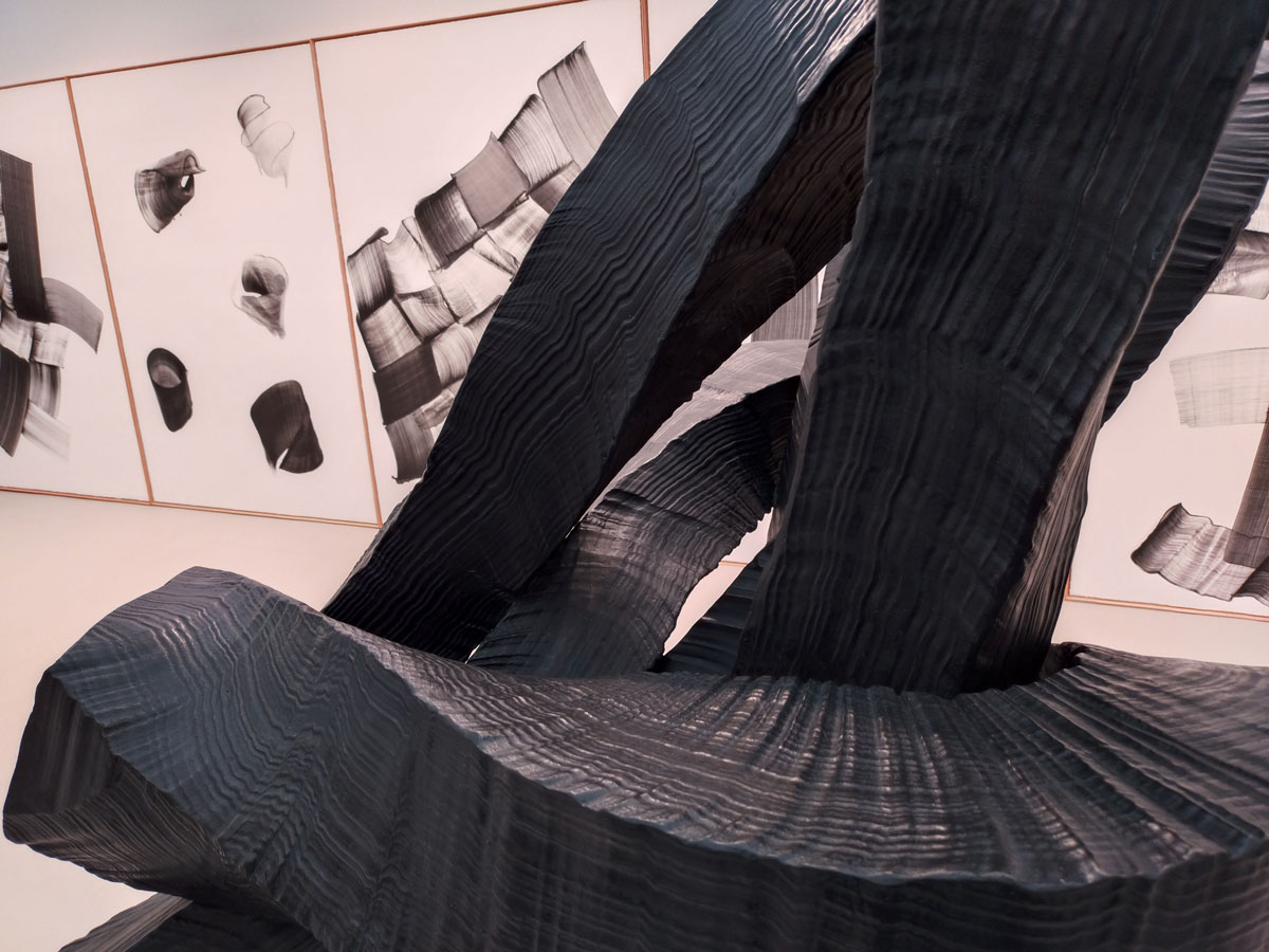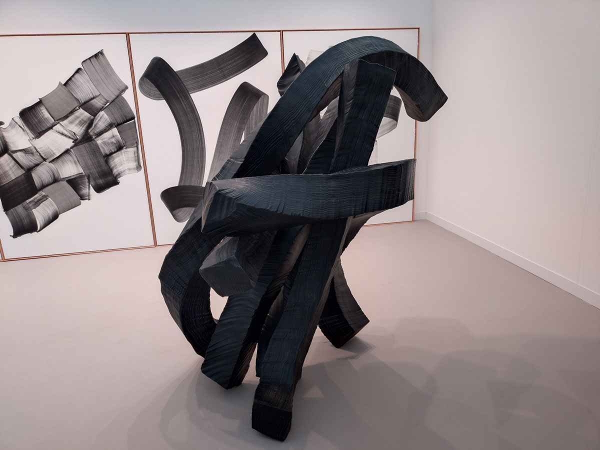 3: Lee Bae and that very (very) black wooden sculpture that you so want to touch, that giant wooden piece that’s actually a bronze and his pulling us into the abysses of that blackness as you walk around it again and again, his different ways of exploring the same subject that Johyun Gallery from Busan, Seoul are showing at Frieze this year. The big big sculpture, big in so many ways, that Brushstroke Sculpture (a bronze edition of three) that you just want to spend the whole day with, his blurred lines somewhere between very big drawings, painting, charcoal, those panels that play some kind of support act to that sculpture and turn the whole booth into what really is a powerfully rewarding installation… “Based in Seoul and Paris, Lee Bae focuses on the expressive potential of charcoal as a medium”, he really has won Frieze, he’s also got some work in Frieze Masters we are later to discover – okay no, no one won, art is not a vote or an award or a competition, Lee Bae’s work excited me most this year though… – Frieze Week, the obligatory top ten, Lee Bae’s blackness, Jo Messer, Collapse back at the very start week, over in Peckham, Stéphanie Saadé and Mafra, Susie Green at Union, that Ken Currie opening at Flowers, Carol Bove and…