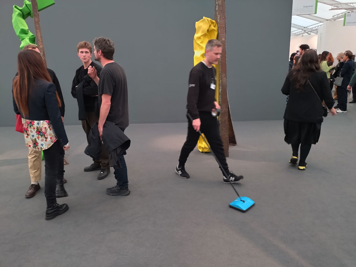The question was, was the man with the blue carpet sweeper sweeping around Carol Bove’s pieces part of it? Part of the performance? The blue was surely no accident?