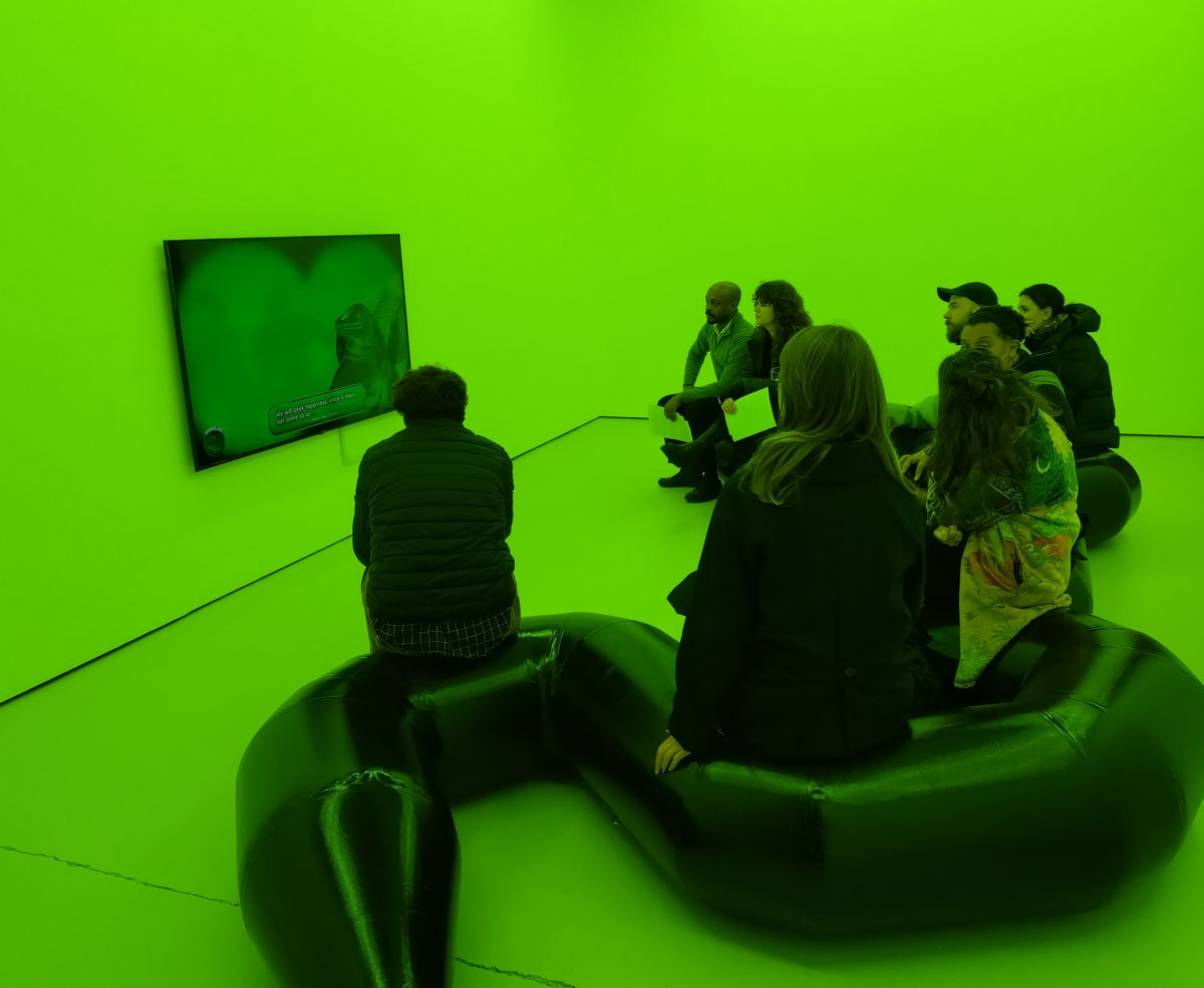 What to make of this one? What is a “single-channel video” anyway? Well we’re in the slight green light (but not as green as those photos have you believe), there’s a big video screen on one of the big gallery walls in the main room, there’s a rather fine looking snake-like communal seat that surely doubles as a piece of art in the middle of the room and we’re all invited to sit and watch. Our ideas of what an art gallery should be are being challenged once again. Or are they? Isn’t this how it is now? Here we are at the start of 2025, video screens are almost the the norm now aren’t they? Isn’t this kind of where we’re at now? (two day on from the Sara Sadik opening we’re going to enounter big screens in numerous on the Condo galleries of East London) Can’t I just watch this on YouTube? I mean, I can watch all this at home can’t I? I can’t look at a big painting on a computer screen, not really, although I am forced to do just that more and more, no room for paintings in these screen-filled galleries (as a painter I am forced to show my work more and more on line and not in a physical gallery), isn’t standing in an art gallery looking at something moving a big flat screen kind of normal now? Is it relaly challenging that much? Yes it does (positively) change the dynamic to be sitting in the reverential belly of an art gallery and behaving in the way convention dictated that we do in a gallery so I’m probably kind of answering my own question but then am I? Isn’t this what shared YouTube appointments to view are for? Those shared live comment feeds at the side and such? And what of the piece of art itself? The piece of video art? The Film? What are we calling it? Are we still calling them videos? What of Sara Sadik’s flat screen painting up on the gallery wall?