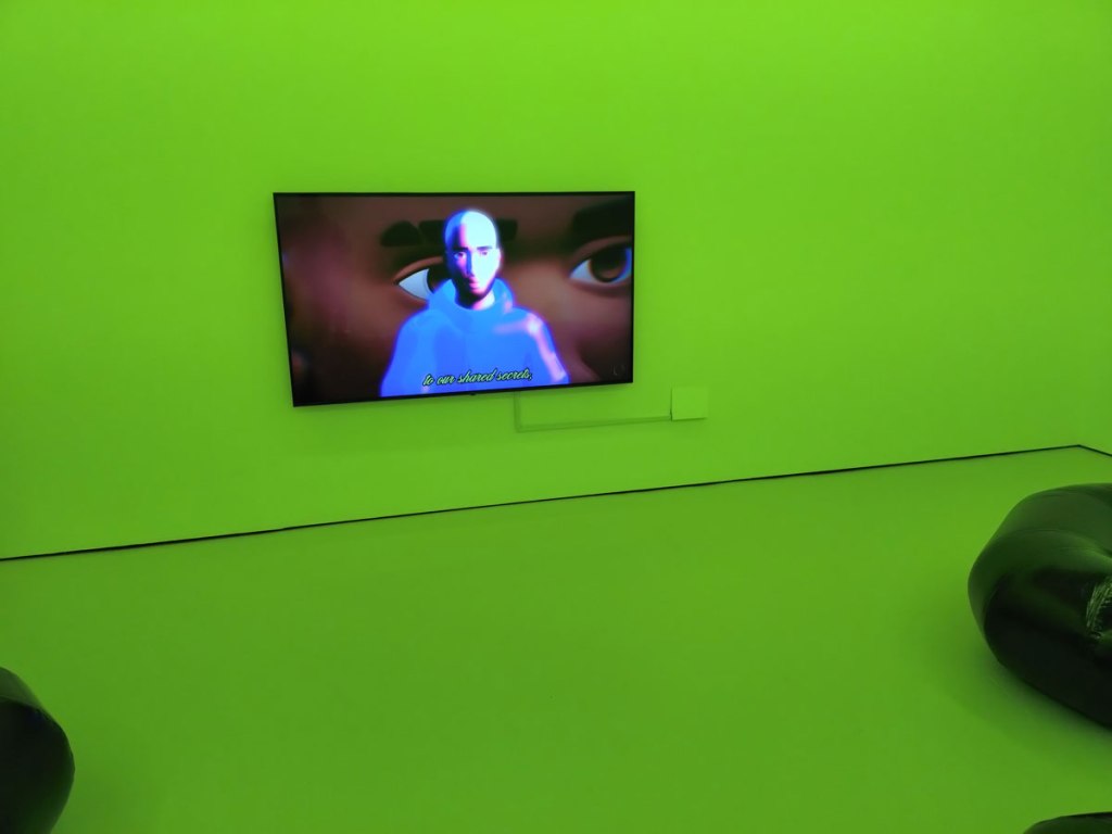 Now I readily admit I don’t talk the language of video games, I don’t play video games, I never have wanted to, I don’t naturally read these things, I have no real authority here, I don’t really want to have any authority here, I am a Luditte, I don’t like stream powered looms. This art does not engage with me, it does not excite me, it doesn’t move me, it doesn’t anger me. The visual language is not my language, this is like some hip-hop fan trying to write about about prog rock when he knows nothing about Emerson, Lake or indeed Palmer. I can talk (or write) for hours about standing in front of this or that painting, the emotion of a Peter Prendergast landscape, the painful depths of that Tracey Emin exhibition from last year that’s still running around my head for way more than just one reason, that Gentle Giant sample that Travis Scott uses in Hyaena, those big big Ken Currie paintings, I really can’t seriously write with any kind of authority about what’s on the wall in the gallery here, I can’t connect with it, engage with it, it isn’t loading for me, I am lost here (in the heart of anxiety), no state of uncontrollable vertigo, no wanting to learn how to transform, it is a beautiful night though, it does feel good in here, in this formal art gallery, in this comfort zone. I’m not sure if the piece does make anyone’s lives more visible? I am looking at the game for the first time like everyone else, it isn’t really making me think this story exists elsewhere, somewhere a little more real than this, it kind of just looks like an old video game, it kind of looks like a piece of slick brightly coloured almost sickly pop art on a screen on a gallery wall but then what do I know about any of this? I’m not a gamer, this really isn’t talking to me, I’m not really feeling a “psychological space of darkness full of anxiety and fear” even though the real face is there on the screen introducing us to his avatar (in French).