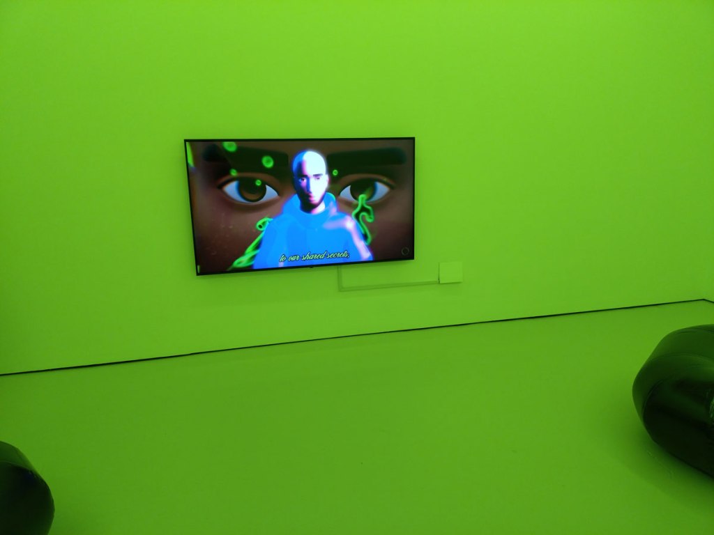 No Cacotopia again this year, not physically in that traditional spot at the turn of the year anyway, did I spy some kind of mention of it happening digitally? Cacotopia has delivered so so much at the gallery at the start of each year over the last seven or eight January’s or so, we do have something physically happening at Annka Kultys Gallery at the start of January though and that is something to celebrate. There a welcoming green and blue glow in the corner of the cold winter darkness of that industrial estate. There’s cold looking dark figures silhouetted in the light of the always challenging art space, people’s breath hanging in the cold air, big coats and hats outside the gallery. I like Annka Kultys Gallery, I’ve never seen a bad show in there, I’ve seen shows I’ve questioned, shows I’ve debate with myself about, I’ve been taken out of my painterly comfort zone on several occasions, there’s been shows I’ve not really liked but I’ve never seen a bad show at Annka Kultys Gallery which is why, even though this whatever it is that Sara Sadik and the gallery are offering really doesn’t look like my thing, I have chosen to come out in the almost unbearable cold tonight. This isn’t a gallery that plays things safe, they don’t do average, no such thing as just another show at Annka Kultys Gallery and tonight, in the green glow of it all the Gallery presents the opening night of an exhibition of a single-channel video by Sara Sadik (b. 1994). This will be the Bordeaux-born, Marseille–based artist’s debut solo presentation with Annka Kultys Gallery and her first solo exhibition in London.