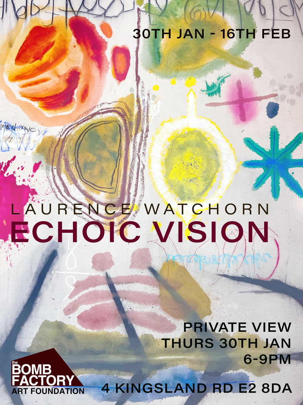 1: Laurence Watchorn, Echoic Vision at The Bomb Factory Shoreditch – “The Bomb Factory Art Foundation is pleased to present Echoic Vision, a solo exhibition by Laurence Watchorn, running from the 30th of January to the 16th of February at our pop-up gallery on Kingsland Road in East London. This body of work explores the relationship between sound and vision, while inviting a reconnection with the natural world. Drawing inspiration from Carl Jung’s concept of “the spirit of the depths,” Echoic Vision reflects on the mystical and numinous aspects of existence”.