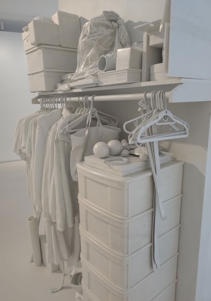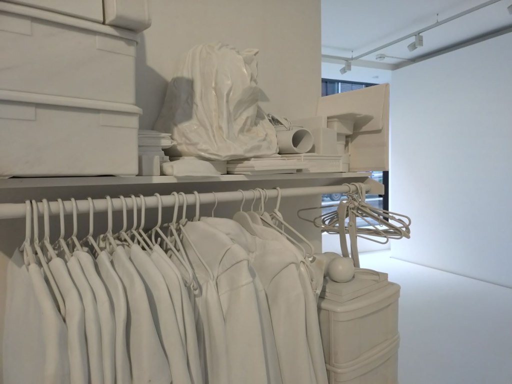 “Through materials, images, forms and gestures, reflecting on intimacy, history, values and causality, Hodges invites an enquiry into our relationship to time, its measures, and meanings. Extending through the gallery, composed of found materials, carved marble and oil painting, in varied ranges of scale and tonality, this new body of work resonates with whimsy, humility, foreboding and mystery to highlight themes of beauty, fragility and impermanence. Rendered in white marble and painted bronze, the familiar, modest gathering of intimate belongings to be discovered in Craig’s closet have been captured in time. Even as they speak of the specific world, and the specific life in which these objects – clothing, keepsakes, closed forever containers – were brought together, they seem to now transcend their temporal materiality….”