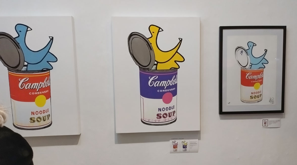 What to make of a Pure Evil solo show and an early February opening on a cold wet East London Thursday night then? I might like his art but hey, the task of forcing myself out the studio door for a walk down the Hackney Road on an evening like this is not an easy one, it must be done though. Get out to that gallery, support the scene, drink his beer! Let’s see what Charlie has on his walls. Snoopy and his mates seem to be a new thing, pop art prints of the other Charlie, Charlie Brown and his mates, Peanuts never meant that much to me, I guess they’re kind of fun and Charlie Pure Evil does like to play with those pop art staples and do we see some new soup cans over there?