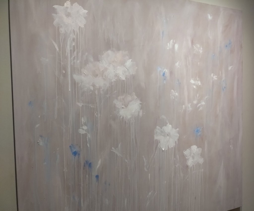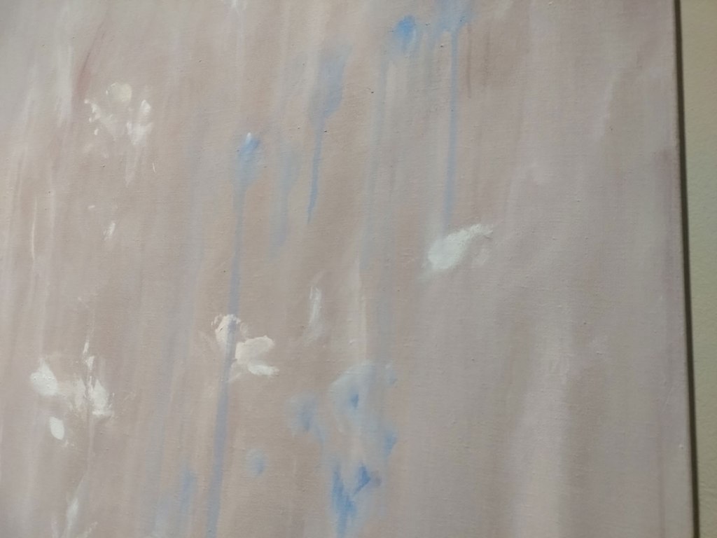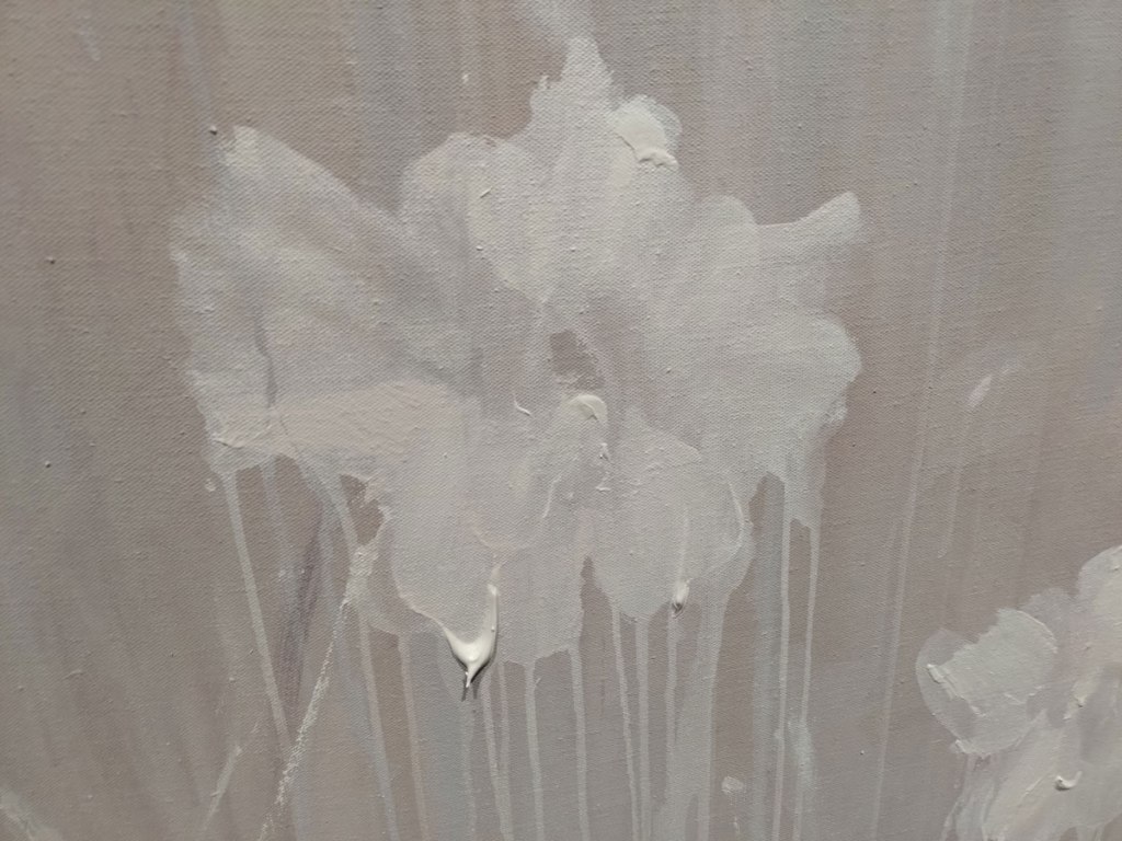 The two of them talk of many things, about how she paints, why she paints, about how wet her canvas is and where those blue flickers within the pieces are from, they are what she sees – those of us who don’t have “perfect” vision see all kind of strange things. They talk of working with Tracey Emin, about Bianca’s time as a fashion student and how that might have been a wrong move (I was a textile student, a weaving loom was impossible and no one had the patience!). Actually Hettie Judah deserves praise, she coaxed a lot out of Bianca without pushing too much. Could have maybe done with less about the accessibility of the arts world(s) to visually impaired artists or to art fans, that felt like it needed to be for another time and place, there are massive debates to be had there and a lot of people not listened to – like Bianca, I’ve never heard of special openings of galleries for visually impaired people. Like I said, Bianca Raffaella is first and foremost an artist, a painter, an exciting painter, I for one am here because she is just that, I was here to see the art and hear her talk about it, she and Hettie Judah talked so brilliantly about her art, about Keats about the why of flowers, the fragile short time that a flower is there before it is but a faded memory.