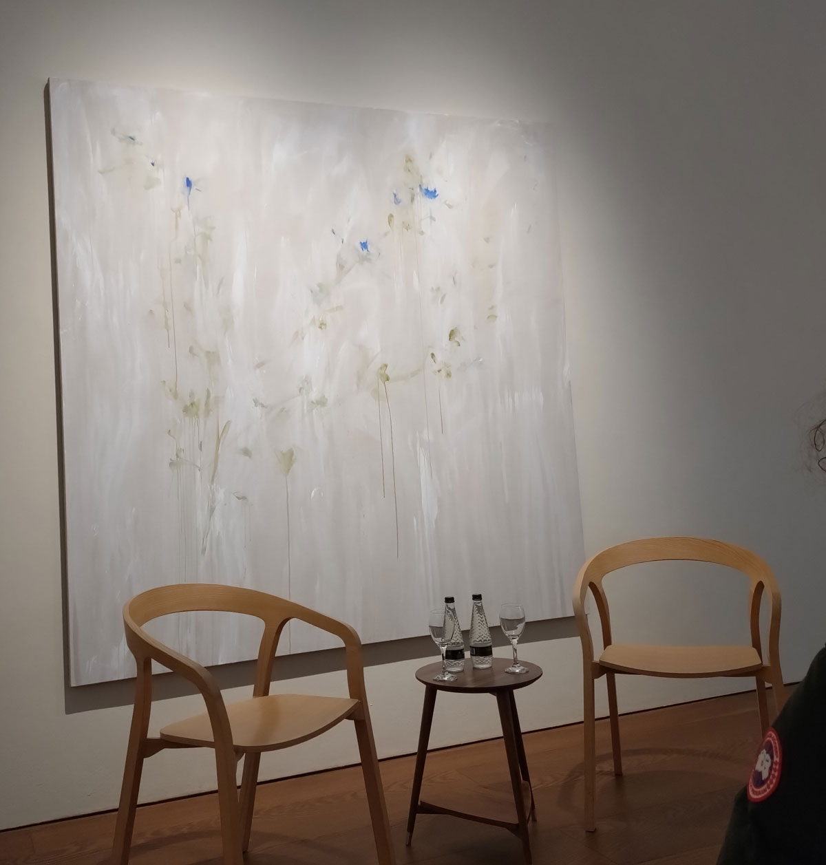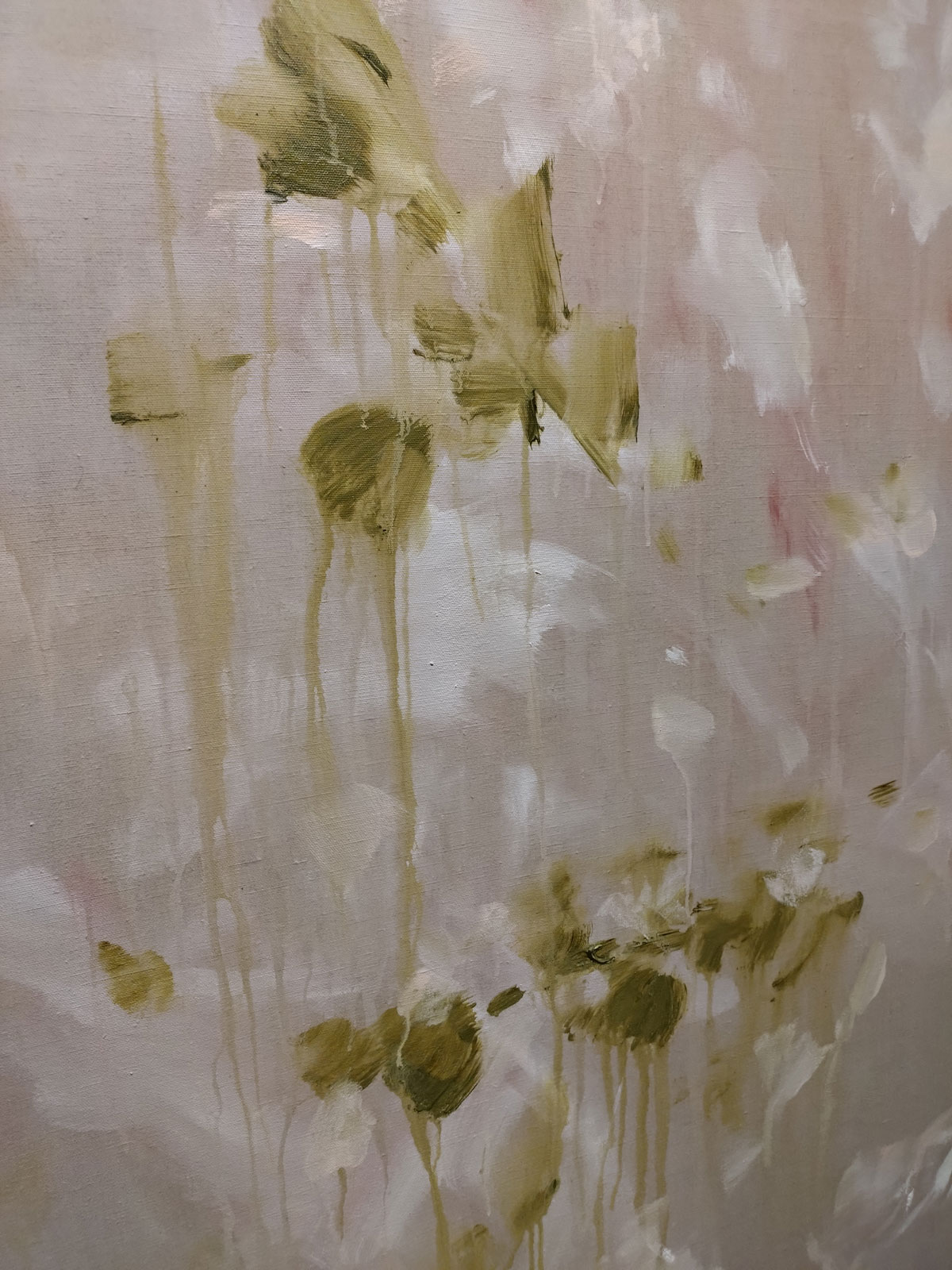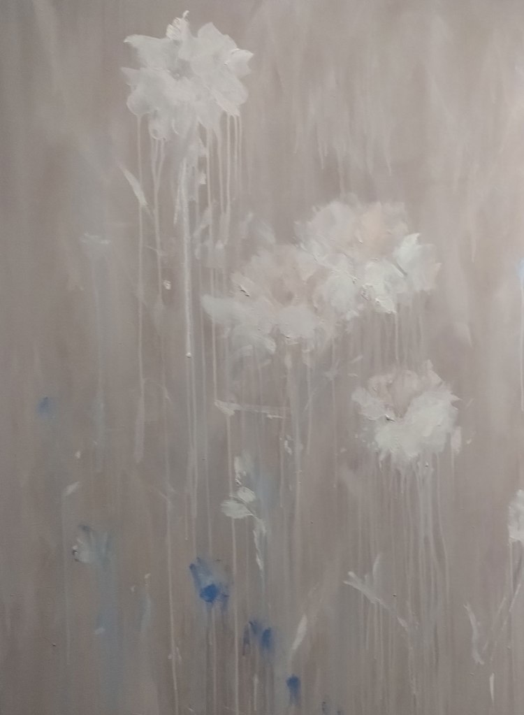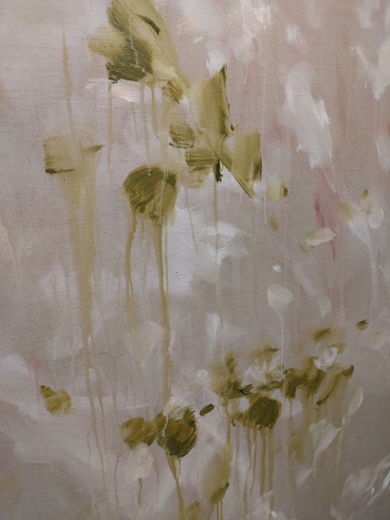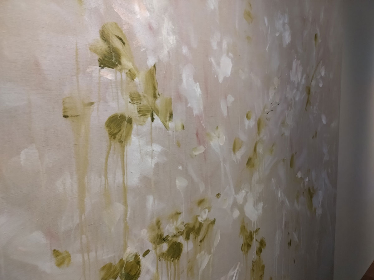 I love these paintings, I love her faded blur of (almost) lines and stems and leaves, her Faint Memories, the delicate strength, the hints of flowers, the emotion in the shapes of leaves or storks, the commitment in the flickers of almost electric blue, the way things float in and out, I love being able to walk right up to them and talk to her via her linen canvases, and these paintings really do talk back, they tell us so so much, they’re intimate, they’re bold, they’re very personal, they’re big in more than just the size. And of course we’re all fascinated in terms of how she actually does it but I almost don’t want to know about the mess she gets into or the practical realities, I just want to see the results, the intensity, the delicateness, the strength of the paint, the flowers she can’t see are at her feet but somehow does…