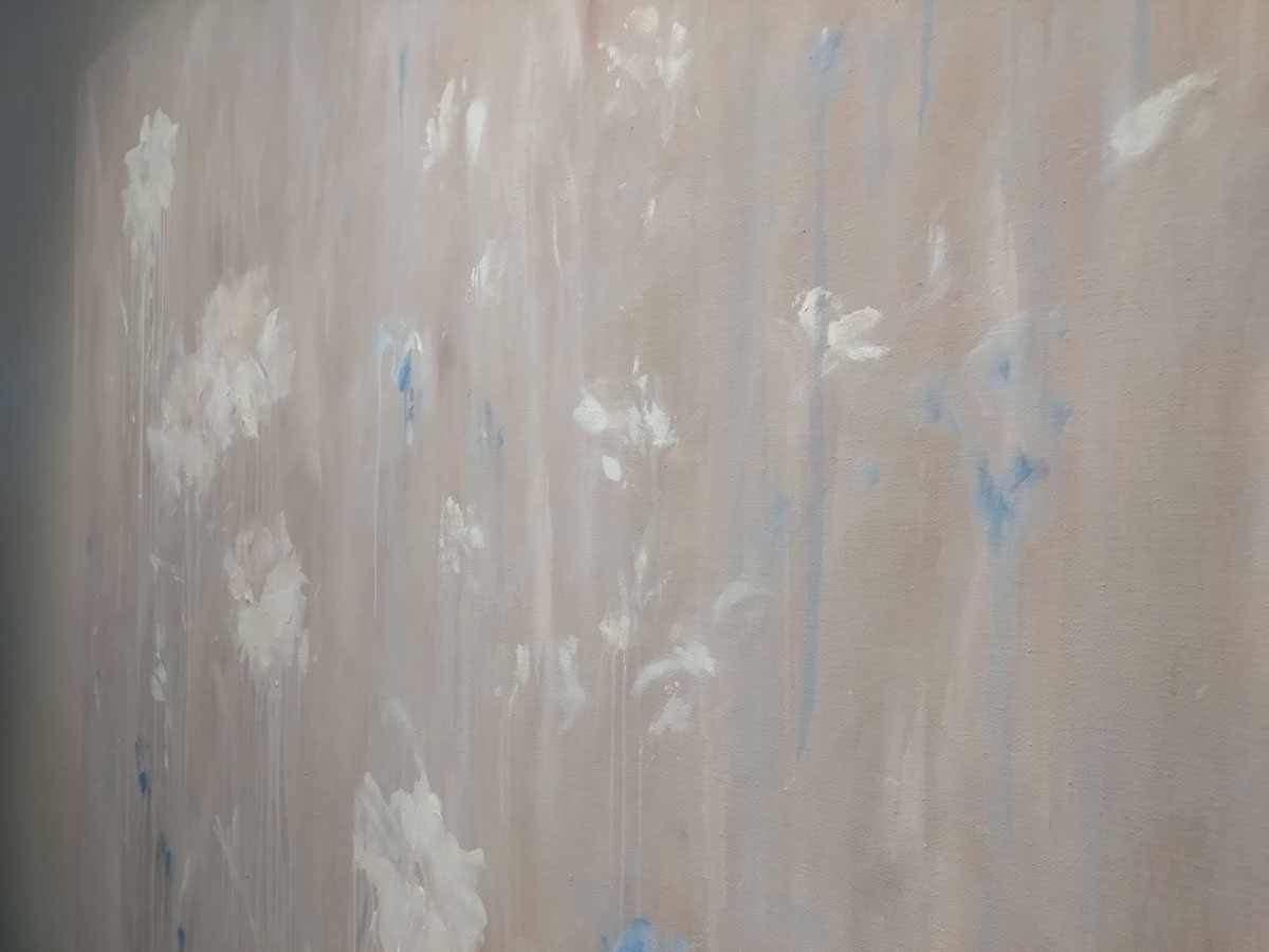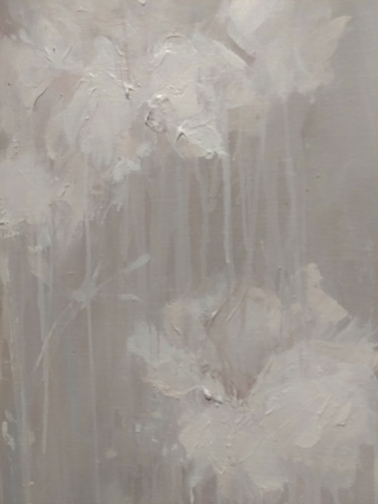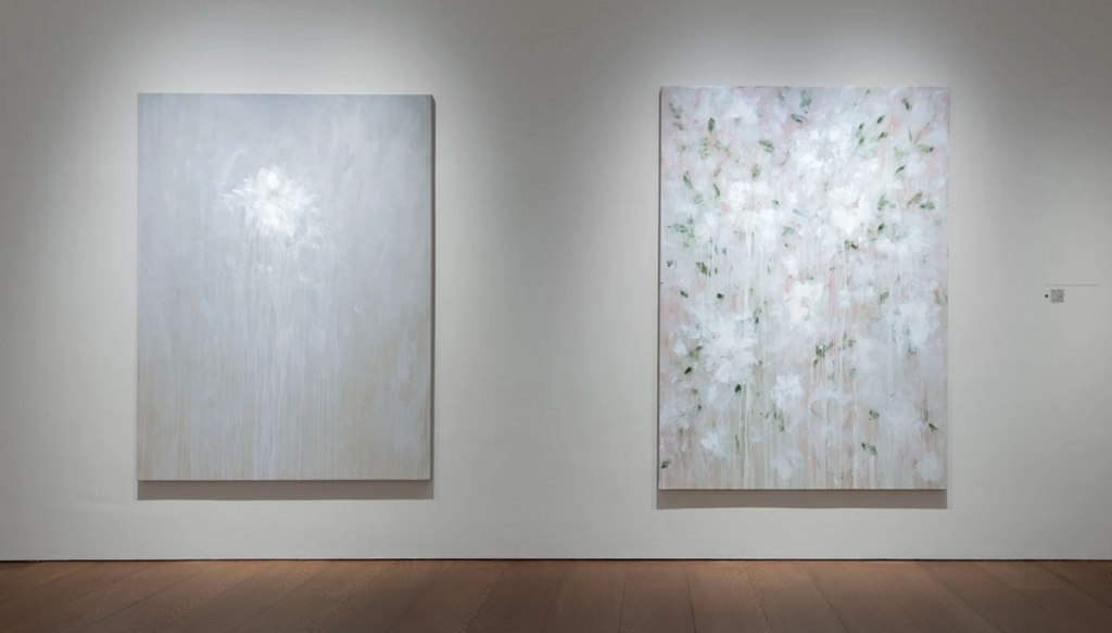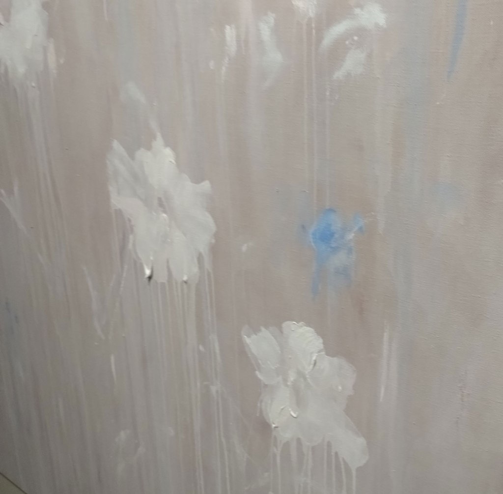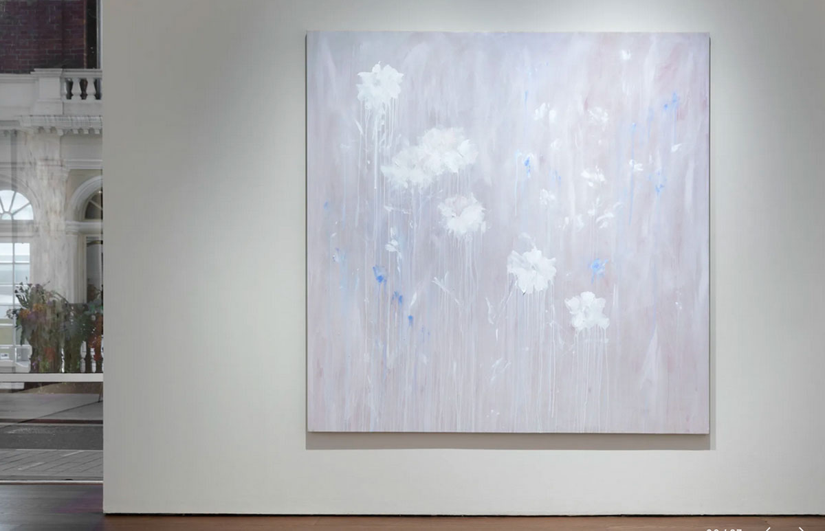 Bianca Raffaella, Faint Memories at Flowers, Cork Street, London, February 2025 – Now I almost opened by saying (or writing) “look” at the start of the sentence in the forthright way people do when a point needs to be made, and yes, it all about looking. As Peter Prendergast shouts from inside my head pretty much every single day of my life, “art is ninety percent looking and ten percent doing”, it is pretty much all about looking. “You’re not looking!” Peter would yell but we’re not really sure what painter Bianca Raffaella is actually looking at or at least what she she can see, although maybe we are? Surely she has it there, right there on these beautifully big canvases that make up her debut major solo show here in Cork Street at Flowers, the faded flowers on these beautifully big canvases, that’s what she sees. It is all about us being here looking at what she (intensely) looks at and sees. We all see things in different ways, all us painters, artists, viewers, I wanted to say look, Bianca Raffaella is essentially just another painter intensely looking and trying to tell everyone what she sees, it is what we’re all trying to do. Bianca Raffaella does it so well.