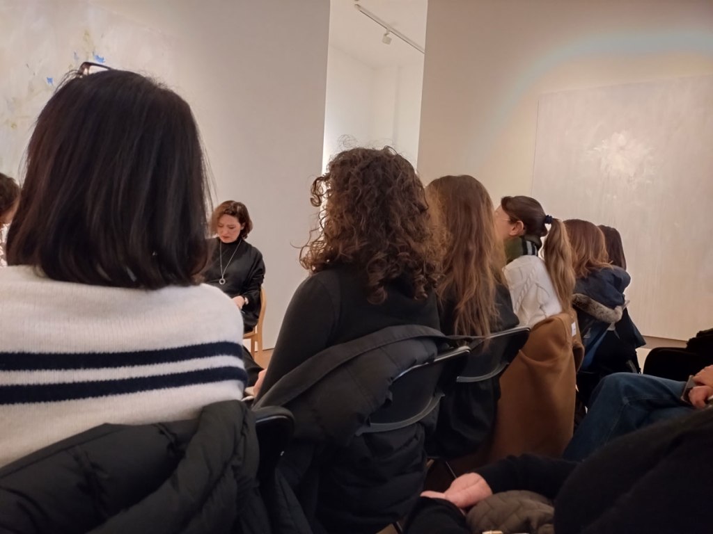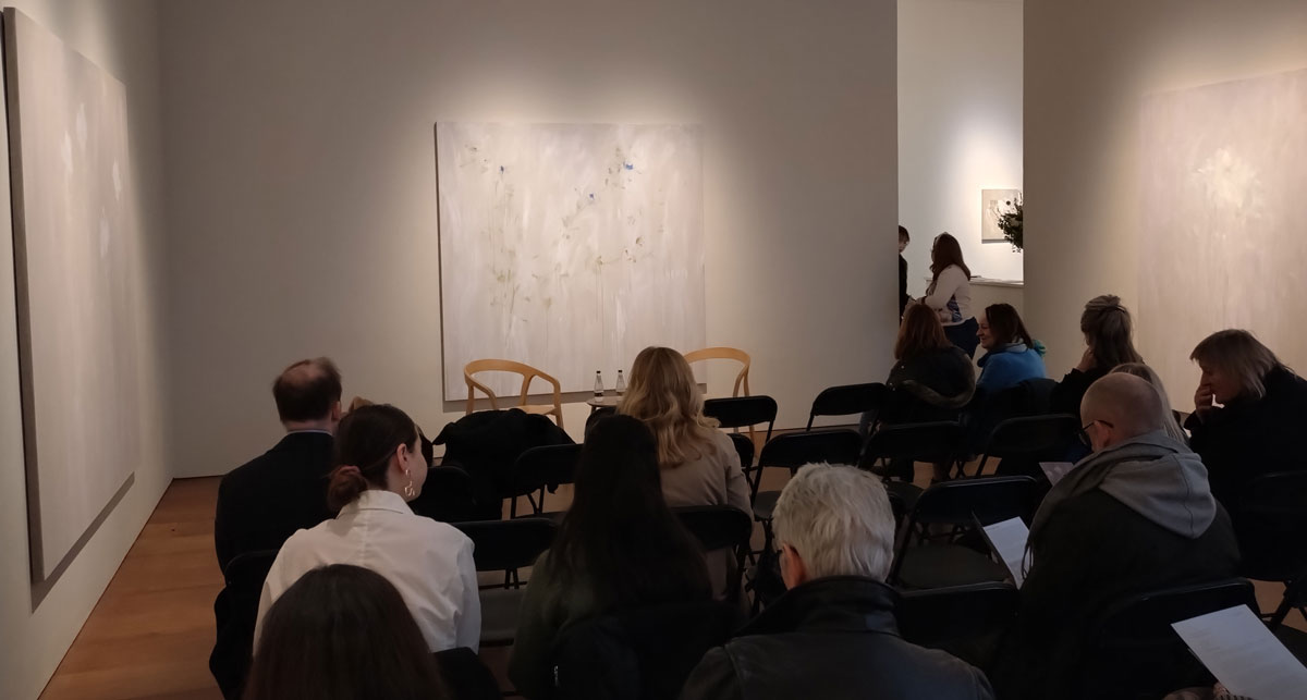 Today, Bianca Raffaella is in conversation with curator, writer and art critic Hettie Judah. Early Saturday afternoon on another cold wet rainy day in February, there’s been so many days like this this year, the gallery is packed though, all seats taken. A quick headcount has it at about only ten percent male, wonder why that is? Just a side observation. The two of them talk for a very rewarding hour – “Join us in the exhibition Faint Memories for a conversation between artist Bianca Raffaella and writer and curator Hettie Judah, reflecting on disability and accessibility in the visual arts and within Raffaella’s practice”. Bianca is a good talker, this is the second time I’ve sat in this gallery listening to her, last time was with Tracey Emin during the aforementioned Artist of The Day thing and both times she has patiently beautifully carefully explained so so much that she could easily just bottle up. There are some artists you can listen to again and again as they talk about themselves and their art, there are others you just don’t want to hear anything from because it detracts so much from their art you love, Bianca talks about art and about her own art so so well. And today she and Hettie talk of John Keats’s Ode to a Nightingale and how that poem has apparently almost been an obsession while she was painting these pieces, how she listened to Benedict Cumberbatch Reciting it (via YouTube) again and again…