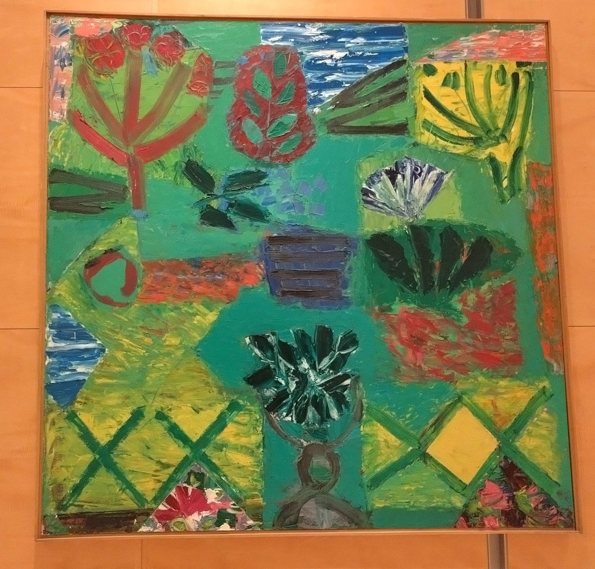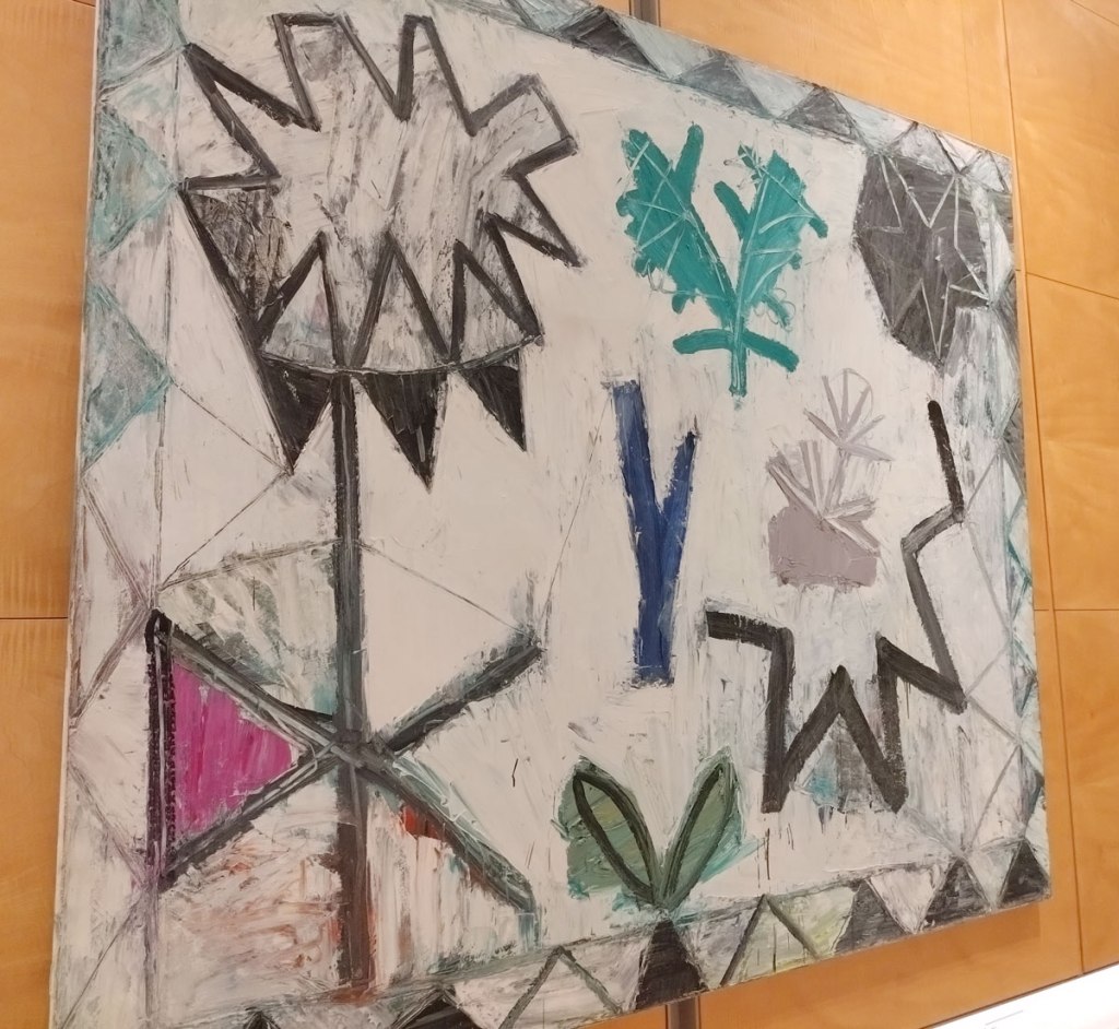 This line of six paintings are exciting all together and spaced out like this, yes, the colour of the wall behind them isn’t great, but hey that’s churlish of me. There’s something very natural about the way Tricia Gillman’s paintings work (both there and her more recent pieces), some thing natural about her placing of things, the placing of her objects, thing there to maybe be read but never very obviously. There a dynamic, not a noise, Tricia Gillman never seems to need to make a big noise. They are formal but not too formal, actually they’re just right, and there they are, right there, big paintings on a big wall in a big line. The paint itself is a big part of it, the way the marks are made or remade, worked or reworked. There are references to things, hints of still life, gardens, to the urban wasteland that was apparently around her studio back there, this is mostly the ways of abstraction and these paintings from back then are working so so well right here and now.