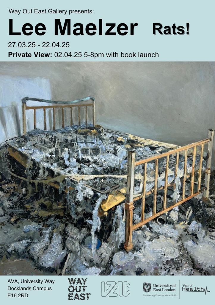 1: Lee Maelzer, Rats! at Way Out East (University of East London) – On now and until 22nd April 2025 with an opening/talk on Wednesday 2nd April 5pm until 8pm – Lee’s paintings are always worth seeing, “Rats! Lee Maelzer’s 13th solo show features haunting paintings exploring memory, dream states, and forgotten spaces”.