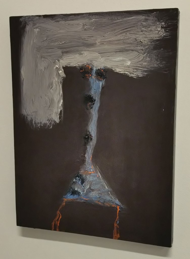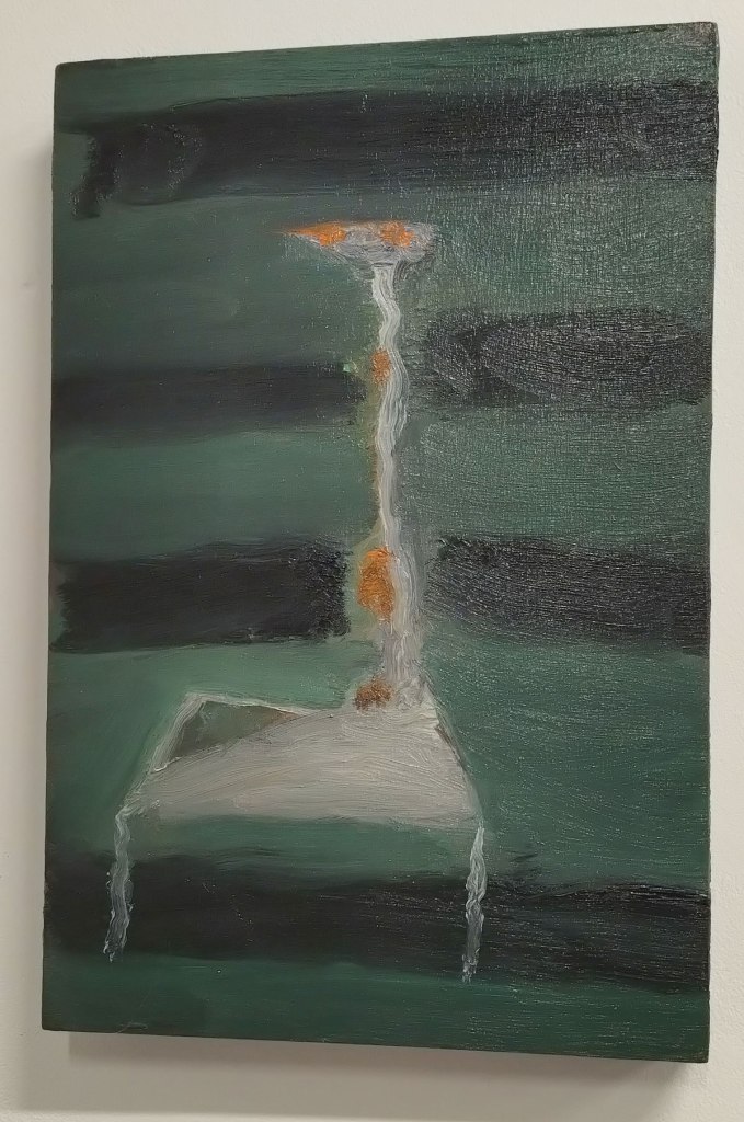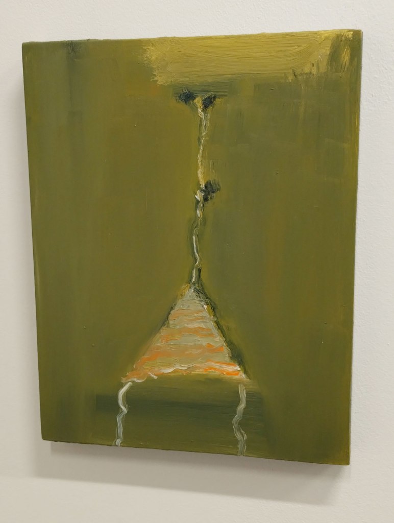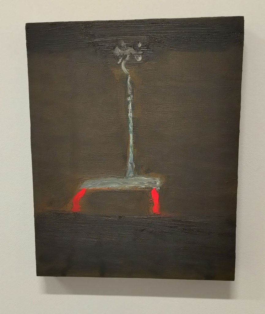 These paintings on the wall at Benjamin Rhodes Gallery are darkly coloured yet alive with rich colour, with life, they’re small, they’re big, they’re exciting all together in exact lines on the white walls of the small space and once again you really need to go see then, photos do these paintings very little justice. They’re powerful all together in the space, their detail demands you focus, not detail in terms of intricate painting, details in term painting decisions, in terms of marks made, marks placed..