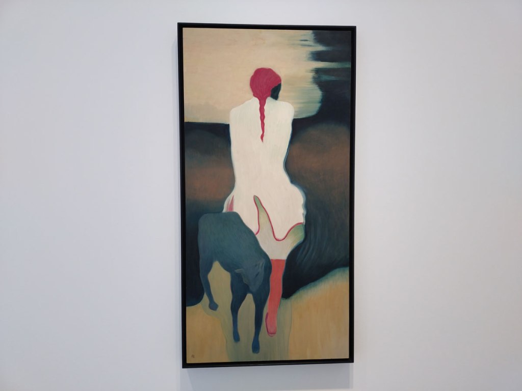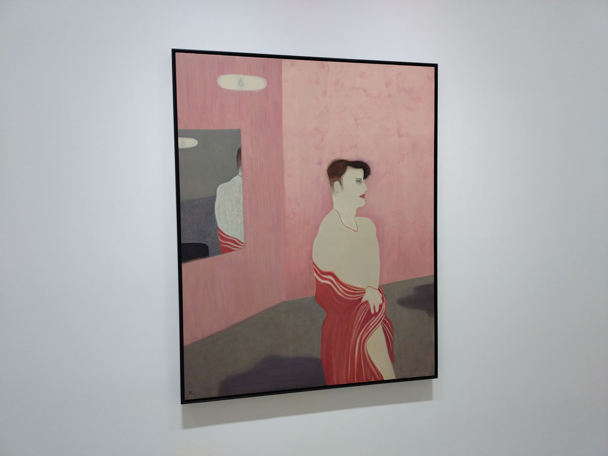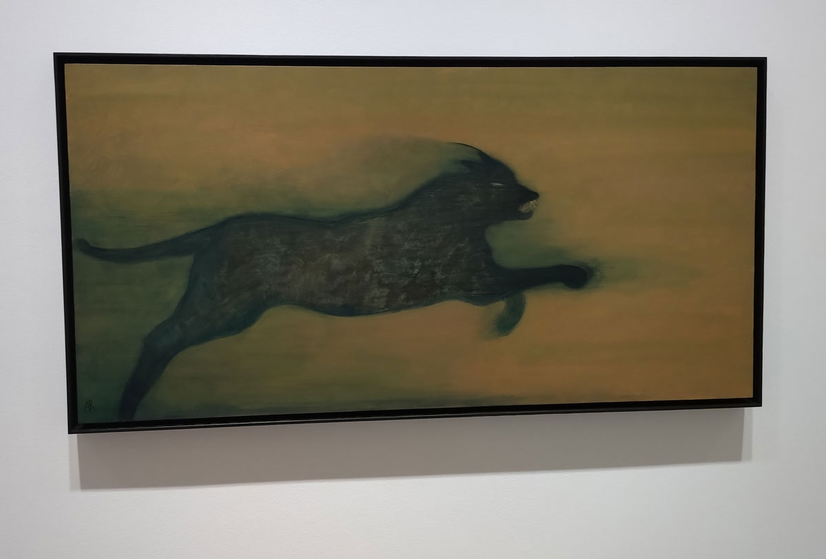 There is a rhythm, I’m not sure how deep anything is here, particularly so with this latest collection of paintings, I’m not sure how deep I want them to be, they’re certainly a lot more than just decoration or nice things to look at, we’re not talking biscuit tins and jigsaw puzzles here. She says she’s telling herself a story much of the time, that and asking questions. Who is this, where is this place, what is going on? You are kind of wondering, who are these people, these stylish people with their impeccable tastes, where is this place, where is that big cat-line beast running to?