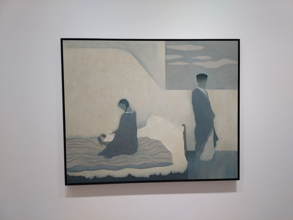 Anne Rothenstein is a calming soothing stylish painter, she is seemingly in a world of her own, well in terms of the art she makes and where it fits, you kind of get the idea she has no interest in where it might fit, I could be wrong, I’ve not heard her say so, I just conclude. There is something captivating, distinctive, it is just a pleasure to be in a quiet peaceful gallery with her paintings, to wonder about them, to not have to wonder too much about them. I have no idea where Anne Rothenstein stands in terms of the great art debate or where contemporary painting is at, she certainly doesn’t challenge me is the way say Madeleine Strindberg, Sean Scully or Sterling Ruby does, her paintings aren’t about a challenge, they are some kind of shade of enigmatic, they are extremely pleasing, they are kind of mysterious. Mysterious figures in her stylised landscapes or interiors, her subtle use of colour just hits some kind of spot…