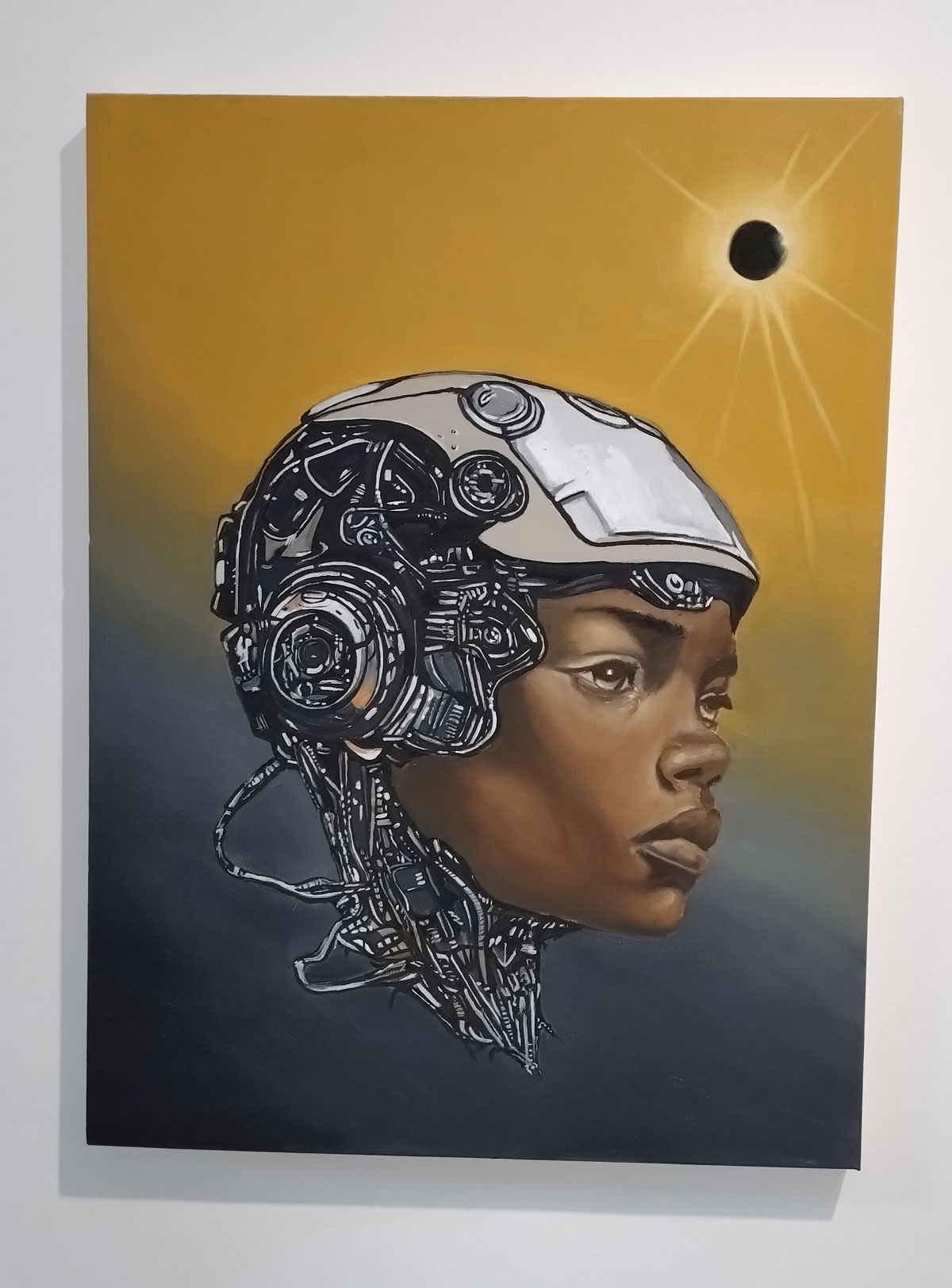 Kearsey and Gold are the new kids on the Cork Street block, if you’re not one of the beautiful people you’re very nearly almost treated like you’re invisible or at times dangerously close to feeling like you’re in the way, it does mean you can quietly overhear things though and reactions to this show are as positively strong as you’d expect them to be. Maybe not quite feeling the Pop Art but the Science Fiction is turned up to the maximum and the use of colour powerful, strong in more than just the obvious way, stylishly painted in oils, more illustration than graphic novel, I guess you call call it Pop Art in a futurist kind of way, clever plays on Science Fiction flavoured imagery, the repeated eclipse motif, beautifully painted, the pieces really speak for themselves, or maybe question for themselves? There’s a lot to consider here, a lot that could be read, a lot that maybe remains unsaid? Really is going to be interesting to see where Leonard “Soldier” Iheagwam goes next. Hey, he’s only in his mid twenties, he’s got a whole world of possibilities ahead. This is a strong show, a bold show, a rewarding show, a challenging show. I might not be cool enough for them but Kearsey and Gold are delivering in Cork Street, if this show had a soundtrack it might well involve Sun Ra, it feels like then, it feels like now, it feels like a healthy slice of a future, maybe even hope… (sw)