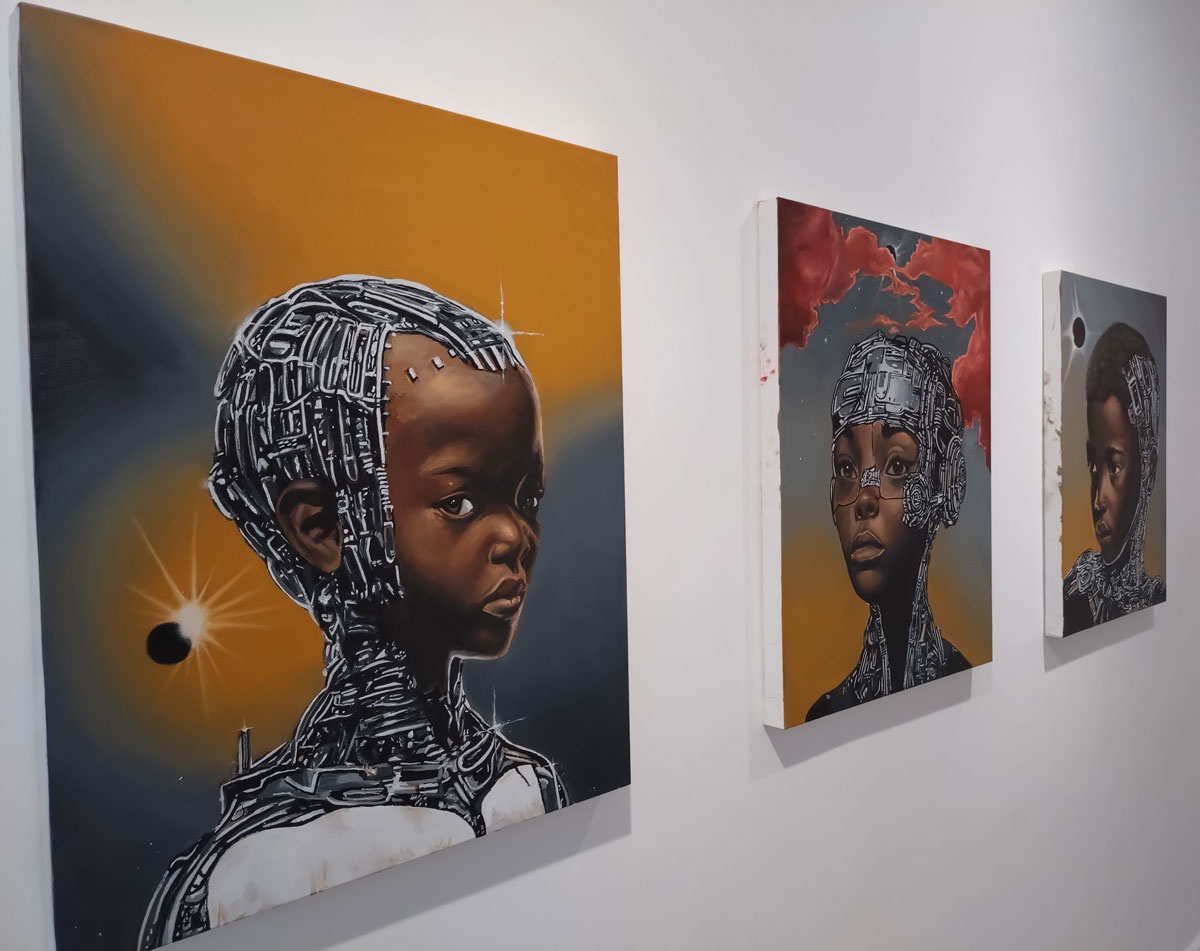 “Leonard “Soldier” Iheagwam (b.1999, Lagos, Nigeria) is a London based multidisciplinary artist whose work blends Pop Art influences with reflections on his upbringing in Lagos. Black Star is the artist’s second solo exhibition in London. The exhibition is a continuation of Soldier’s investigation into what African Pop Art could be. ‘Nigeria is a dumping ground for consumer culture. The West literally dumps products’ Soldier points out. It is this state of affairs that influences the concerns in the body of work for Black Star. The landscapes and protagonists of the exhibition have their genesis in an imagined manifesto titled “Afro-Futurism”.