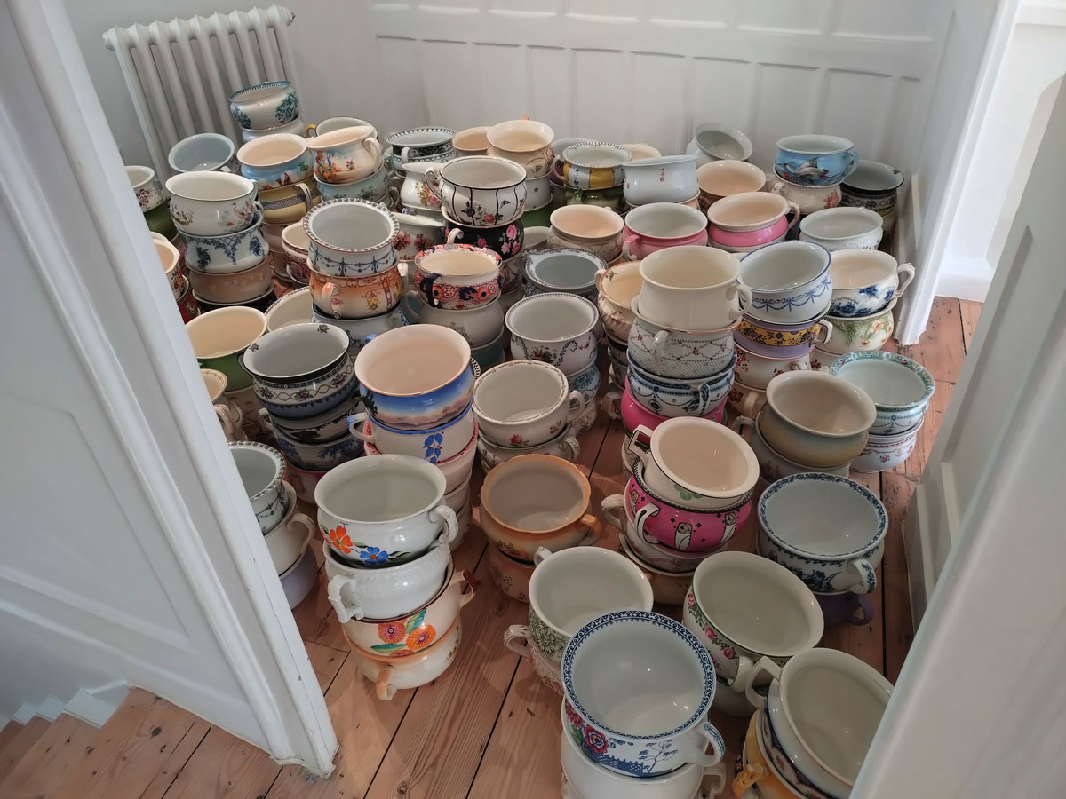 Meanwhile over on the other side of the busy road junction at Emalin‘s, 118½ Shoreditch High Street space there a group show, it is dare I say, a typical Emalin show, Contour Fatigue, a group exhibition featuring Sophia Al-Maria & Lydia Ourahmane, Adriano Costa, Namio Harukawa, Jasper Marsalis, Jonathan Okoronkwo, Margaret Raspé, Michael E. Smith and Alessandra Spranzi, there is a wordy exhibition statement that’s not always through spectacle. We’re told Contour Fatigue brings together nine artists whose work turns toward these sites where containment falters. Through sculpture, installation, painting and video, alongside historic drawings by Japanese fetish artist Namio Harukawa, the exhibition explores how life can exceed the forms devised to hold it. Rather than rupture, we experience oversaturation: a surface too full to reflect, say, or a rhythm too worn to signify. Drift, deformation—where matter slides away from its form and begins to pool elsewhere”. Not sure if we do experience any of that really, there’s something in the sound of the installation upstairs, the room full of chamber pots raises a smile, the broken drum symbols probably say something, not sure if anything devised to hold anything much, the various acts of containment are not really holding me here…