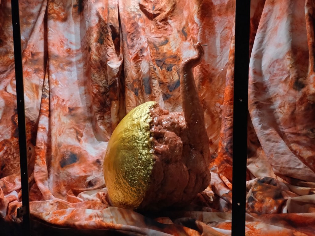 Clutched between the fingers of the male hand is a half-smoked cigarette, evoking the intimate yet fleeting nature of a post- coital moment. The sculpture itself has “landed” in the centre of a surrounding floor-to-ceiling landscape of intestine-like forms, immersing the viewer in a space that is at once bodily and surreal, intimate yet far away. This environment heightens the tension between the grotesque and the desirable, as the gold-covered protrusion – reminiscent of a pregnant belly, a swollen stomach, or the moon – becomes both an object of allure and unease.