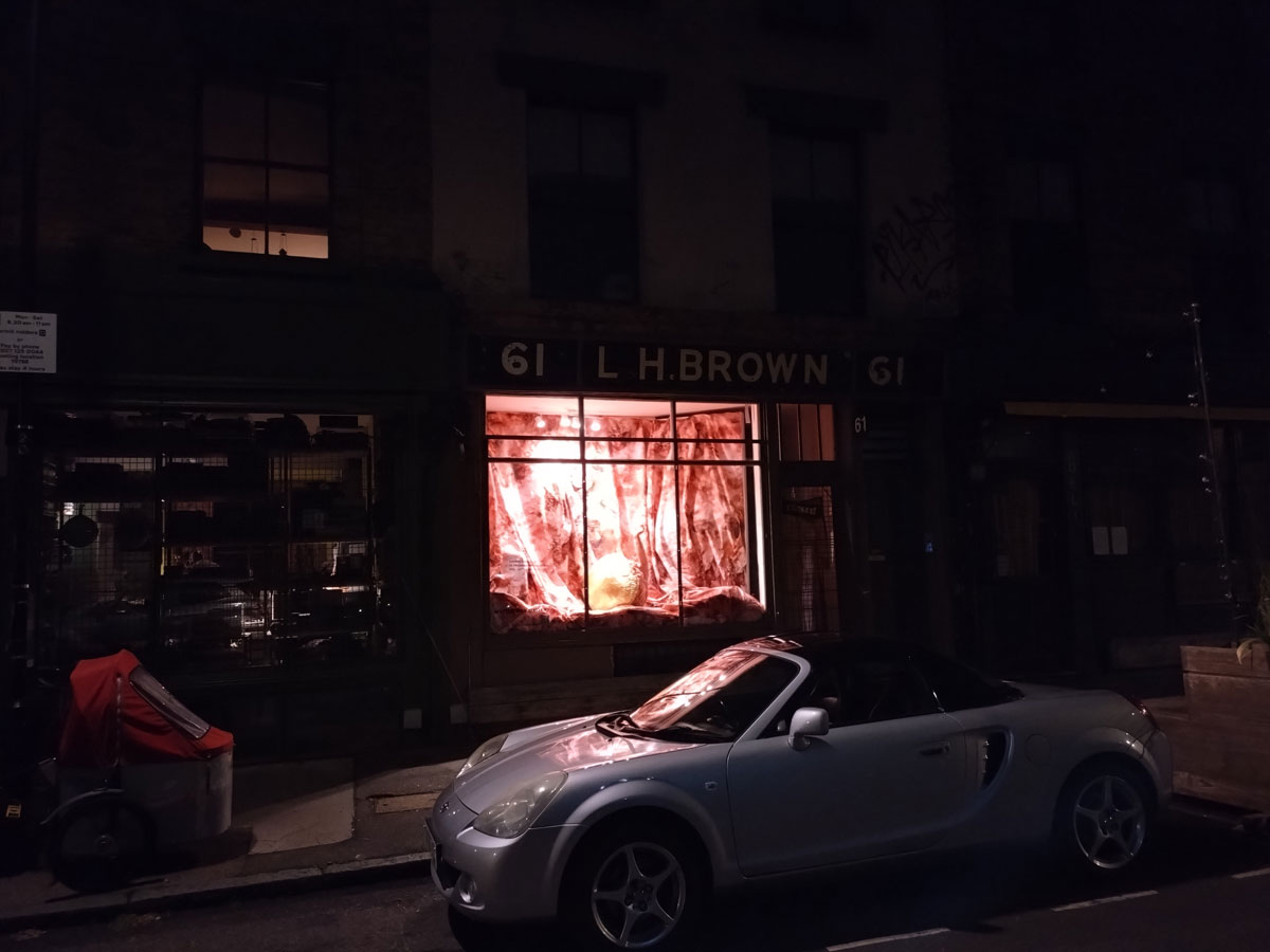 The latest thing to happen in the Wilton Way space was Andrea Hasler’s latest installation in the big window. I was only there for a week, “on view until 27th April, day and night”, I caught it late last week, late at night, on the way home from a gig – that excellent Test Plan show at the Shacklewell Arms if you really must know – Andrea Hasler’s installation looked dramatic around the midnight hour in a street empty save for a passing urban fox that also seemed to be having a look and well, here it is in passing, the installation not the fox, here’s the gallery’s statement (with the American spellings corrected, damn this Grammarly pollution and the smoking)