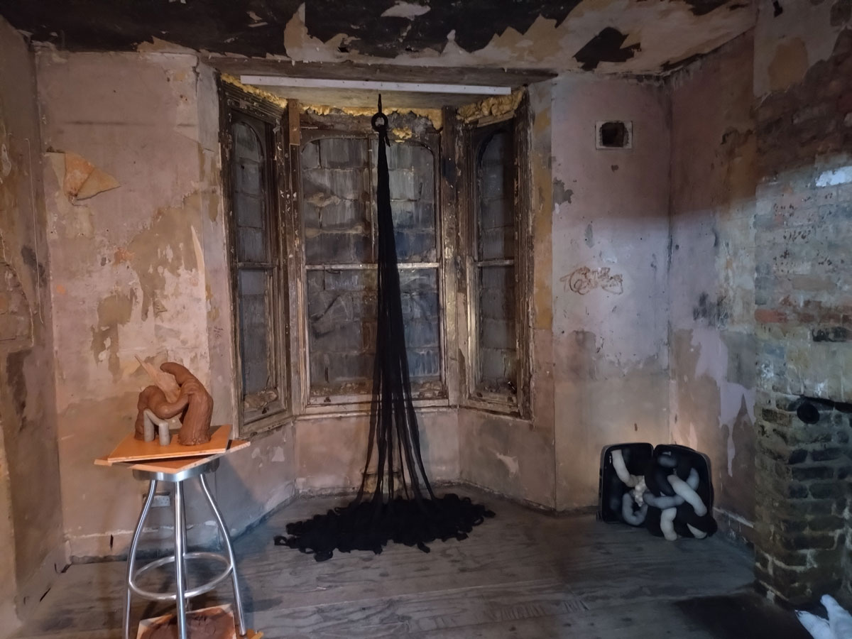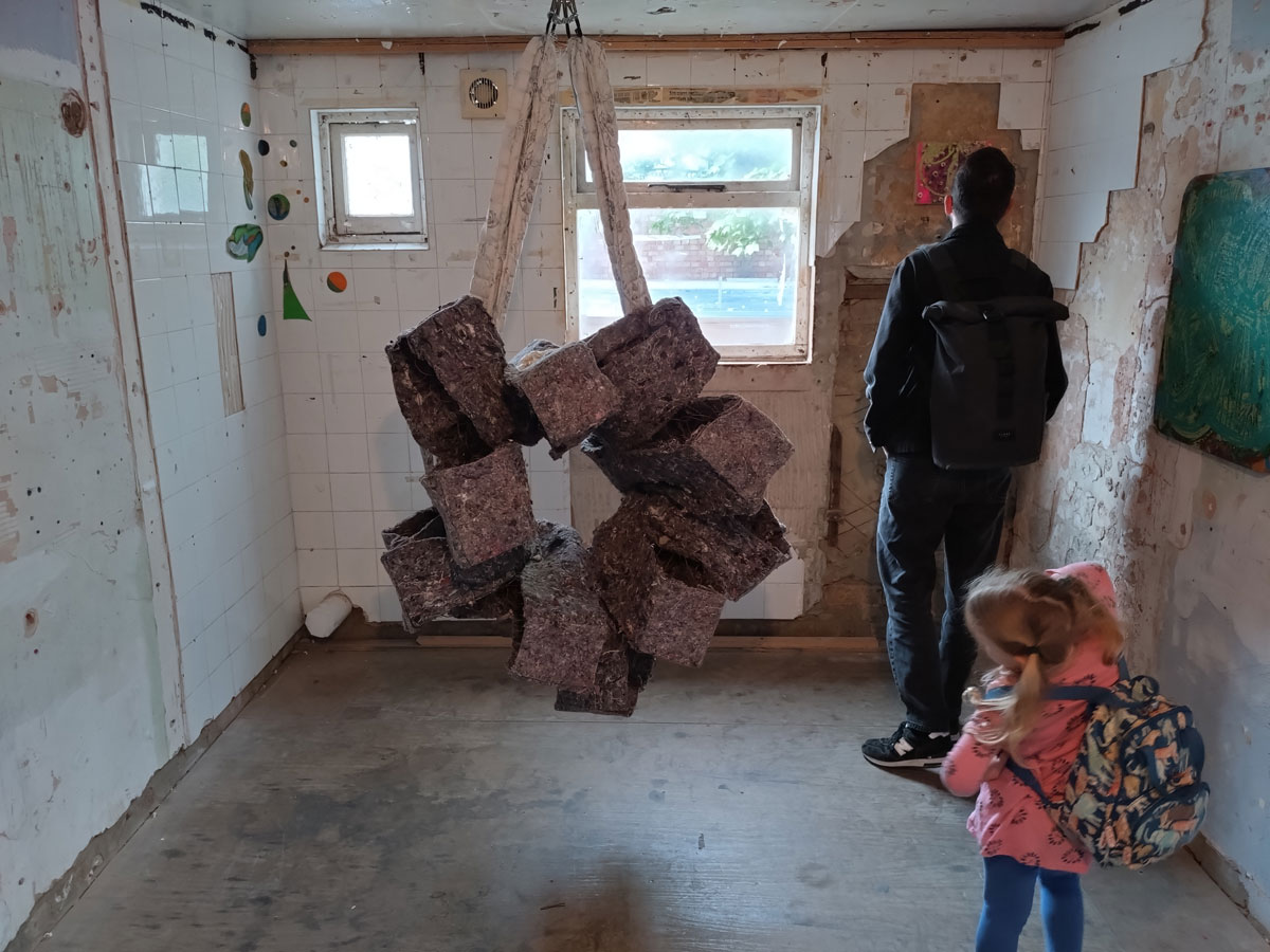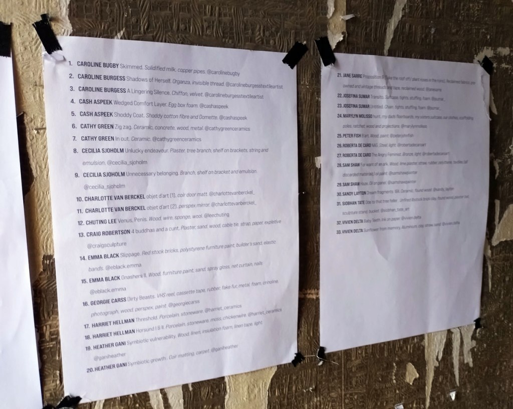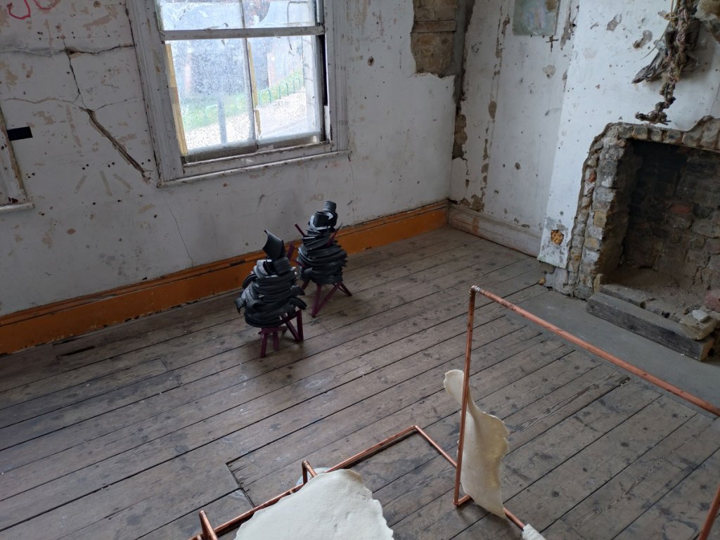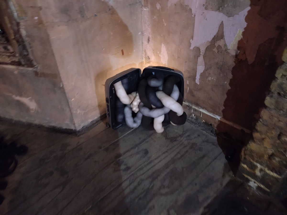 So Blink was in Safehouse Two, meanwhile next door in Safehouse One in the other half of the semi-detached falling down house the Message in a Bottle welcome map is out and Snag is happening. Snag is a Sculpture show, another group show with another long list of participating artists pinned up in the darkness over there. Didn’t see any advance publicity or indeed any listings anywhere in the art media for this one so we have no advance warning in terms of names. Was rather hoping this half of the space would be open as well, pleased to see it was. Once again, we have a group show, once again a big list of participating artists, this time there’s a list up on the wall downstairs (rather than bloody QR codes) but those lists really aren’t corresponding with anything and once again I have no idea who has done what or what the price of fish might be or where the building ends and the shows begins. Once again there’s some good art in here, there’s one or two really great pieces of sculpture or installation or whatever you want to call it in here, once again there’s some maybe not so good bits but once again enough of it is good enough to make this a rewarding show. I can’t tell you who did what, here’s another #43SecondFilm, there’s a bag load of photos down there, if we had some names we’d maybe pick out some highlights, maybe say a whole lot more but we don’t so we won’t and no, no moaning, just shut up and enjoy it.