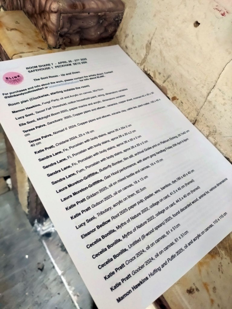 Safehouse One and Two, for those who may not know, are a couple of semi detached houses in Peckham that are pretty much little more than shells of former homes. I guess at some point soon they’re going to be demolished, for now they make for great art galleries and especially in terms of artist-led shows with all the stripped out floors, missing doors and (very) distressed walls. If we have it right then this is the seventh Blink? The shows only last for one weekend (hiring this space or indeed any art space isn’t cheap these days, these people are paying almost as much for a weekend in this dump as we were paying for a month in a prime spot in the middle of Vyner Street just ten years ago, space for artists to do it themselves is a major major problem in this city now, more than it has ever been!). With Blink and their Room Share once again a different artist is acting as curator taking one room each, one of the five or six rooms in one of the two houses and filling that room with the art of their invited artists (there mates?). So you end up with forty or so artists in the Room Shares and if you’re lucky you get to put a name to that piece or indeed those pieces that really grab you. Labelling issues and the slightly aloof too cool for you art school attitudes aside these Blink shows tend to be really (really) good, they’re well worth your time, indeed the last one featured in our best art things of the year round up at the end of 2024.