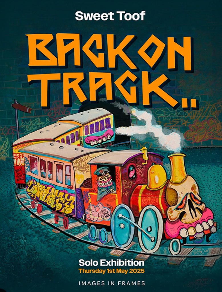 “Sweet Toof’s style is instantly recognisable – skeletal figures, fleshy gums, and gold teeth appearing in the most unlikely places. His work moves fluidly between the street and the gallery, always retaining its raw, rebellious edge. Back on Track reflects a return to familiar ground, capturing the energy and irreverence that have made Sweet Toof a defining voice in contemporary street art…”