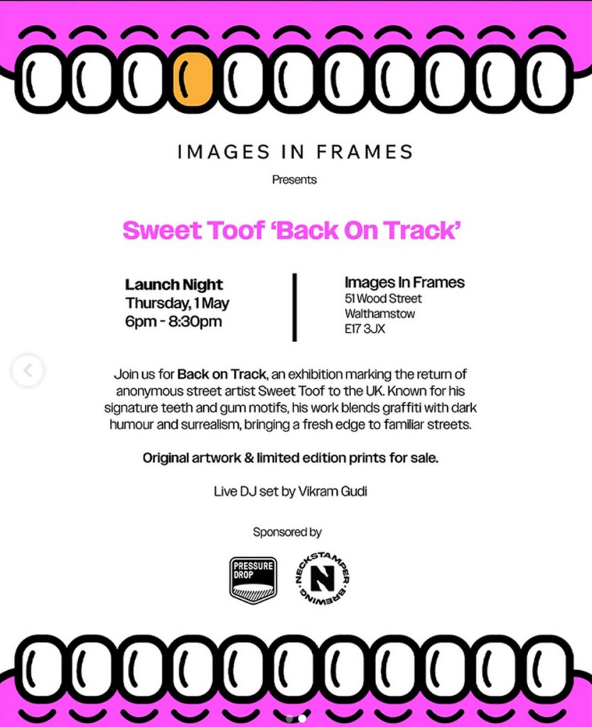 3: Sweet Toof – Back On Track at Images In Frames – The show opens on Thursday 1st May 2025 at 6:00pm until 8:30pm and then A solo show from @thesweettoof at Images In Frames, As is often the case with these things, the publicity is all about the opening night and “An exhibition marking the return of anonymous street artist Sweet Toof. Original art and limited edition prints for sale, drinks & live DJ”. Who knows how long the show is on for? No one seems to want to say and hey, there’s Red issues this Thursday evening so watch this space see if the gallery gets back and tell us how long the show is on for, I good few days if not weeks I should think… Anyway, always good to see a bit of Sweet Toof whatever he might think of the things that go on around here. There is of course years of Sweet Toof documentation here via our various platforms…