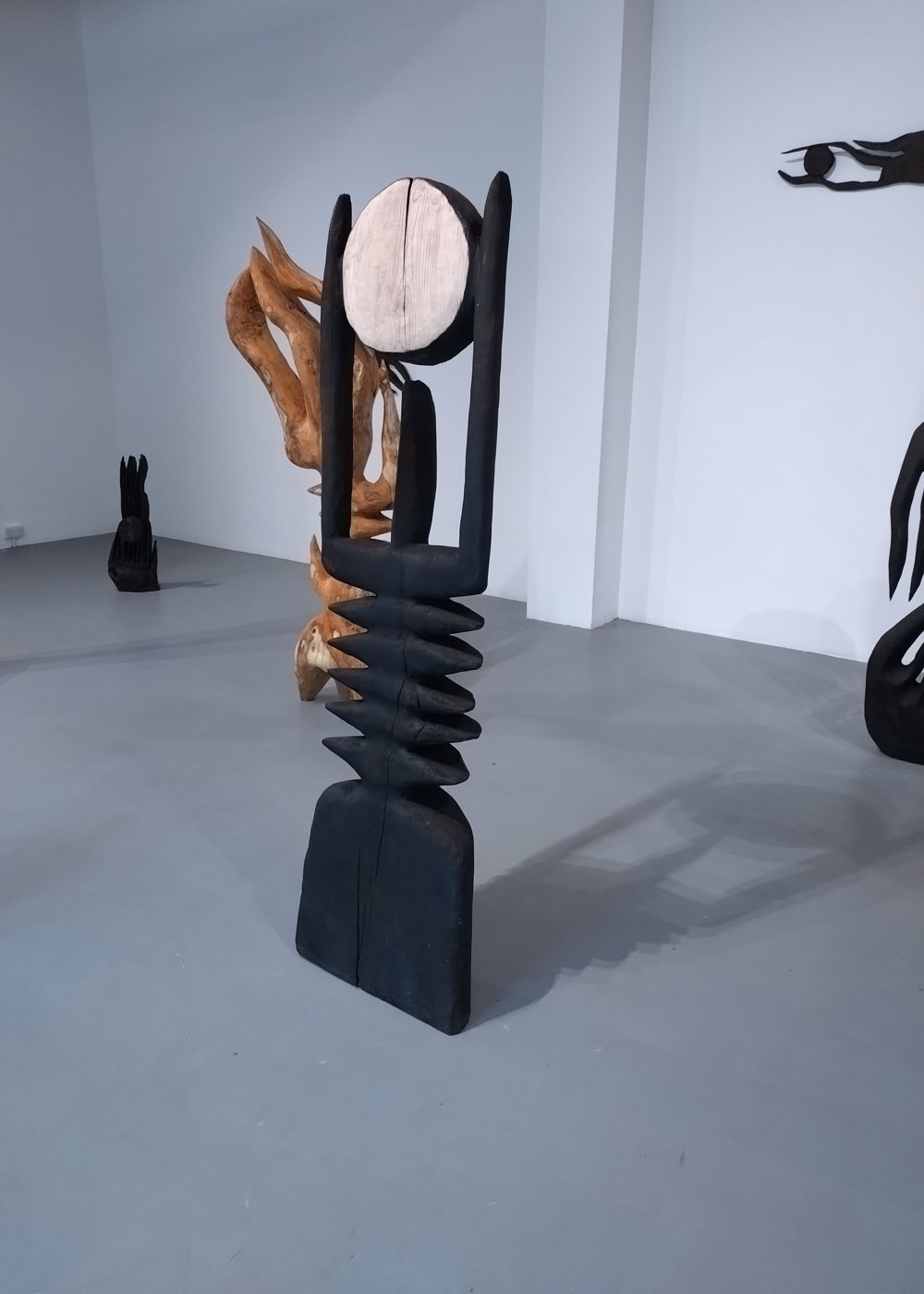 Sol Bailey Barker (b. 1987, England) is a sculptor “who bridges ancient and modern worlds. Blending traditional craftsmanship with contemporary techniques, he creates sculptures that transcend their material origins, forging a dialogue between mythology and technology” and here in the grit of East London’s Bethnal Green it all looks rather monumental, it looks challenging, it looks so wrong and feels so right, I’d love to know who else is looking in late at night, have the gallery got CCTV on us curious late night viewers? Do they know how much interaction there is? Is it about reaction? Does the artist particularly like being here or would he or indeed it all feel the same in some West End space or for that matter somewhere like Hauser and Wirth’s rather inflated Somerset space for instance? Does this feel different in a gallery on a gritty no that fashionable East London street that it would in for example a former farmstead in Bruton?
