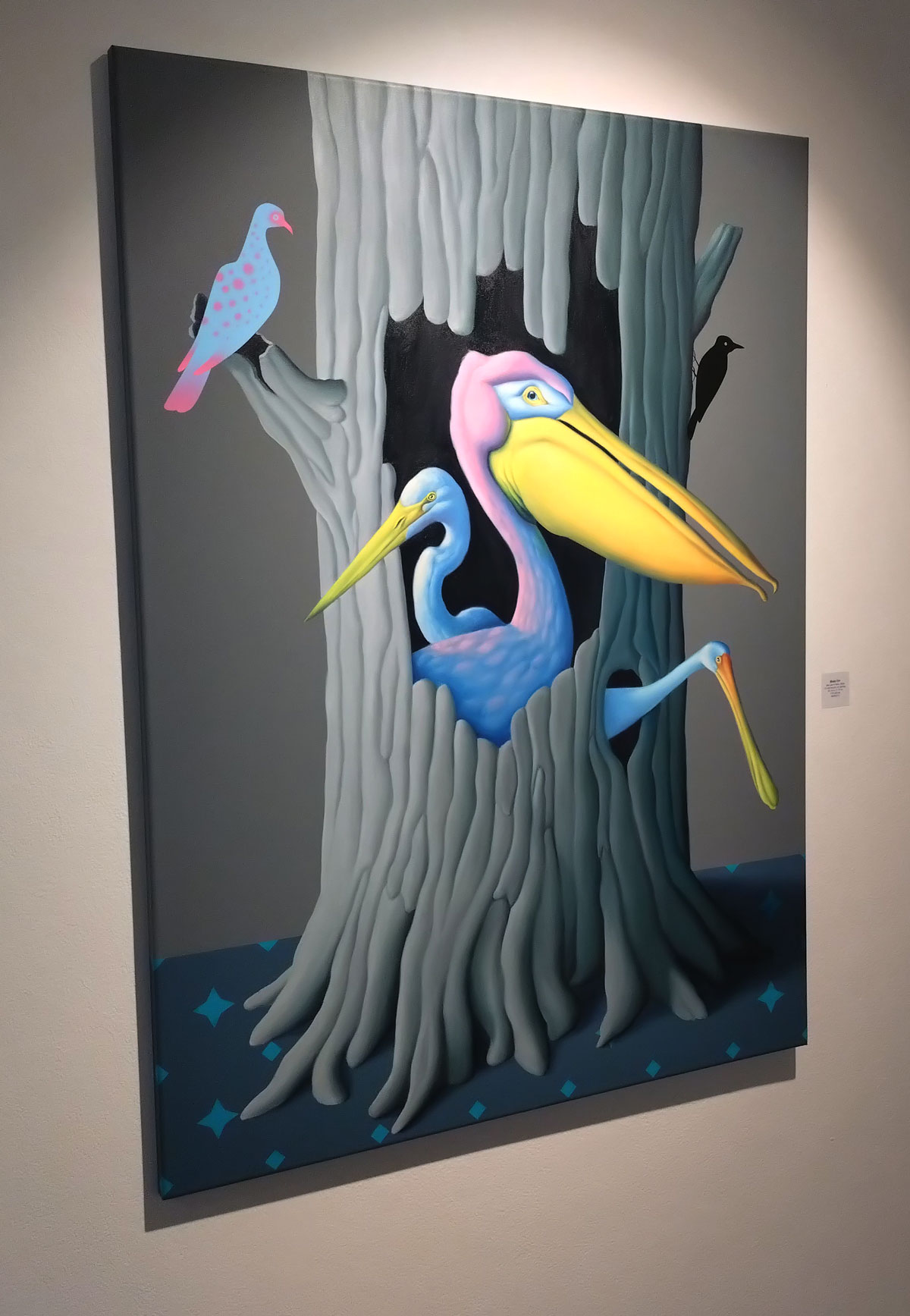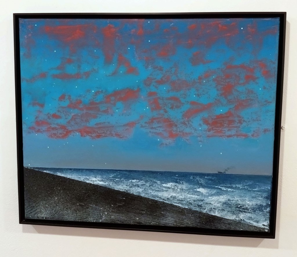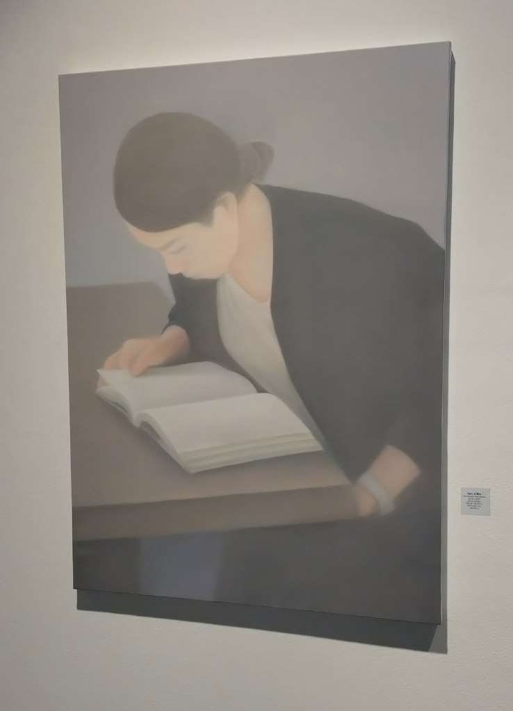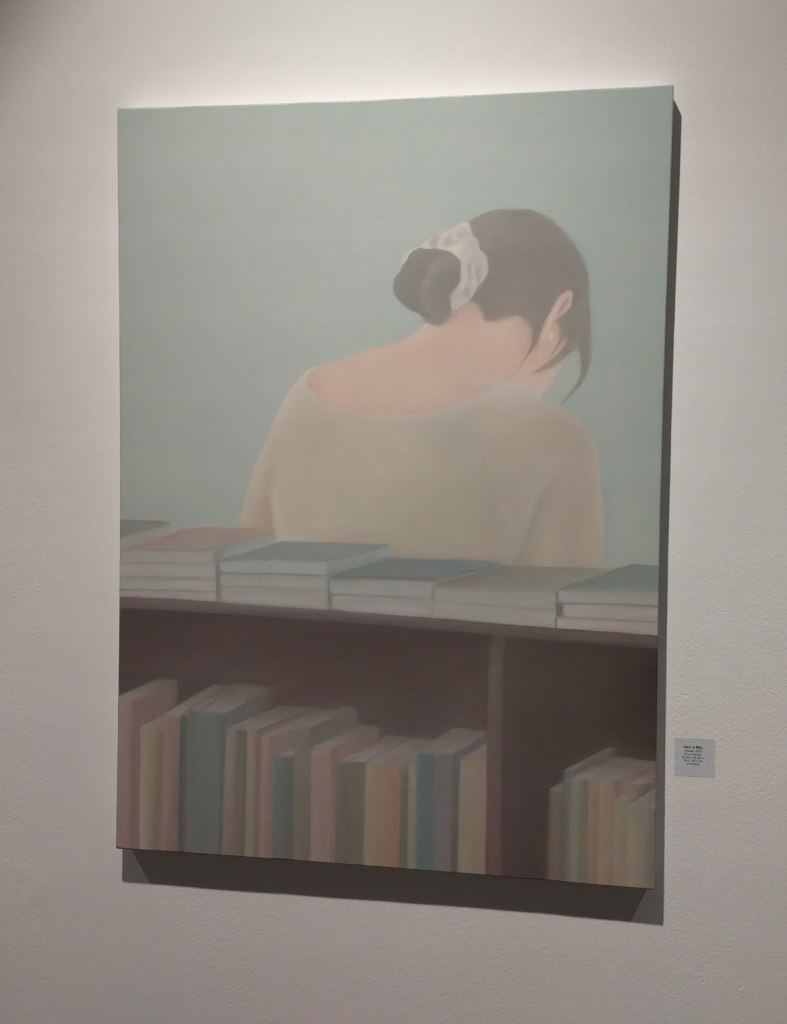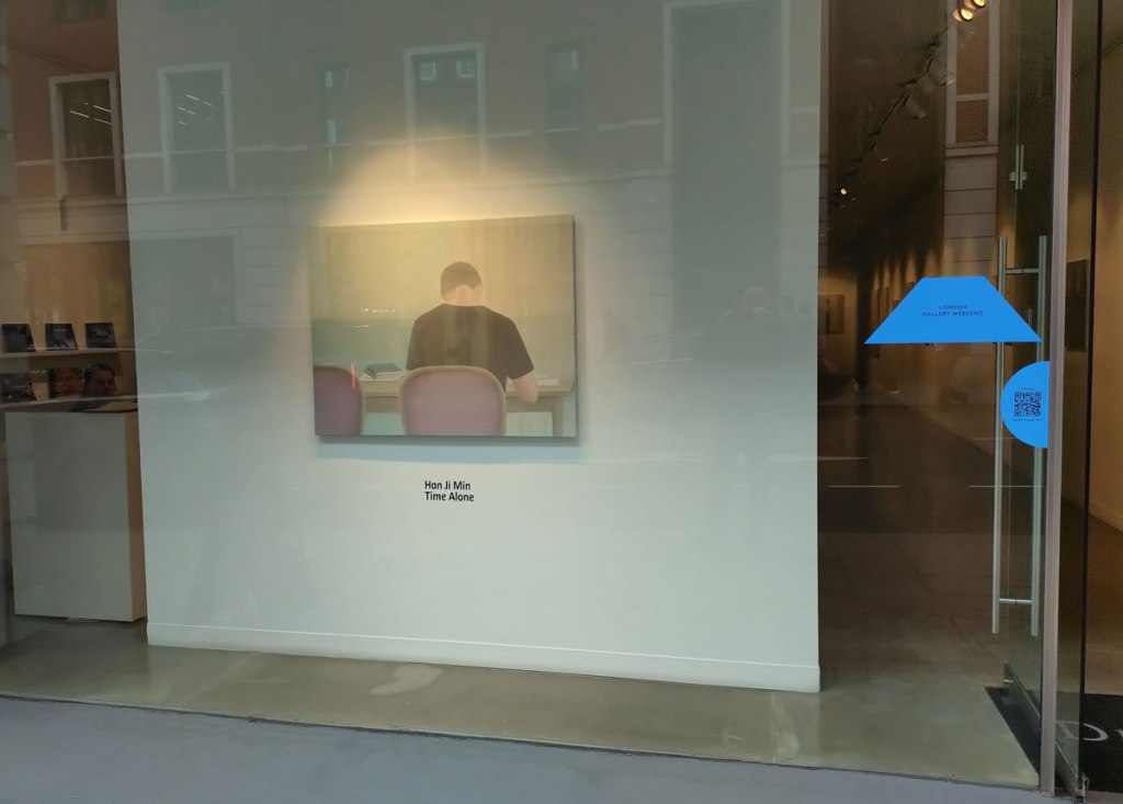 Off out into the Friday afternoon sunlight and out of Cork Street after a quick look at the Keith Grant exhibition of what you might wish to call rather monumental paintings, a show of rather dramatic paintings currently on show at the rather oldschool space that is Redfern Gallery. Grant’s “deeply considered, impassioned homage to the North”, those almost fantasy-like studies of the world of the Poles that are much appreciated by so so many that we’ll respectfully leave with you. And off we go past the second Pilar Corrias Gallery, this one is actually open, a quick second look at Ragna Bley’s rather fine exhibition that I was sure we had covered on these pages after a visit to the rather busy opening night, let me dig all that out and post it rather than throw some words in as part of this piece, it deserves more than a few words in this piece and I rather think we’ve exhausted art for this first day of this London Art Gallery weekend. A walk back to Bond Street Station via a couple of shows at JD Malat Gallery where they say they are delighted to be showing The Hills Are Not as Close as They Seem, the first solo exhibition in London by “emerging international artist” Máté Orr (b. 1985, Budapest). I can’t say Orr’s “distinctive practice” that “merges digital precision with traditional oil painting, resulting in dreamlike compositions where human and animal forms inhabit complex, psychologically charged landscapes” did that much for me, we’re told that “through intricate scenes of quiet confrontation and poetic unease, Orr invites viewers into a world where adversity becomes adventure and vulnerability is met with calm introspection” which I guess is fine if brightly painted three headed almost graphic novel comic book swans are what you want, I don’t really. There a show called Time Alone, the debut London solo exhibition by South Korean artist Han Ji Min (b. 1978, Jeollabuk-do). Featuring 17 oil paintings also on in the same gallery, a show that we’re told “offers a deeply introspective portrait of solitude, routine, and emotional interiority” and mostly looks like polite enough book illustrations with that very restrained pallet, all muted greys, blues and pinks and well, neither show in the highly polished rather slick space that is the London home of JD Malat Gallery do that much and maybe we have reached saturation point now on this first official day of this year’s London Gallery Weekend now? it is our third full on day of gallery exploring and there is still a whole Saturday afternoon of avoiding the East London hen parties and the rest of it to come yet…