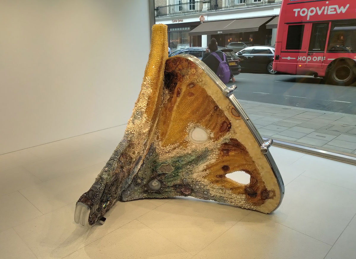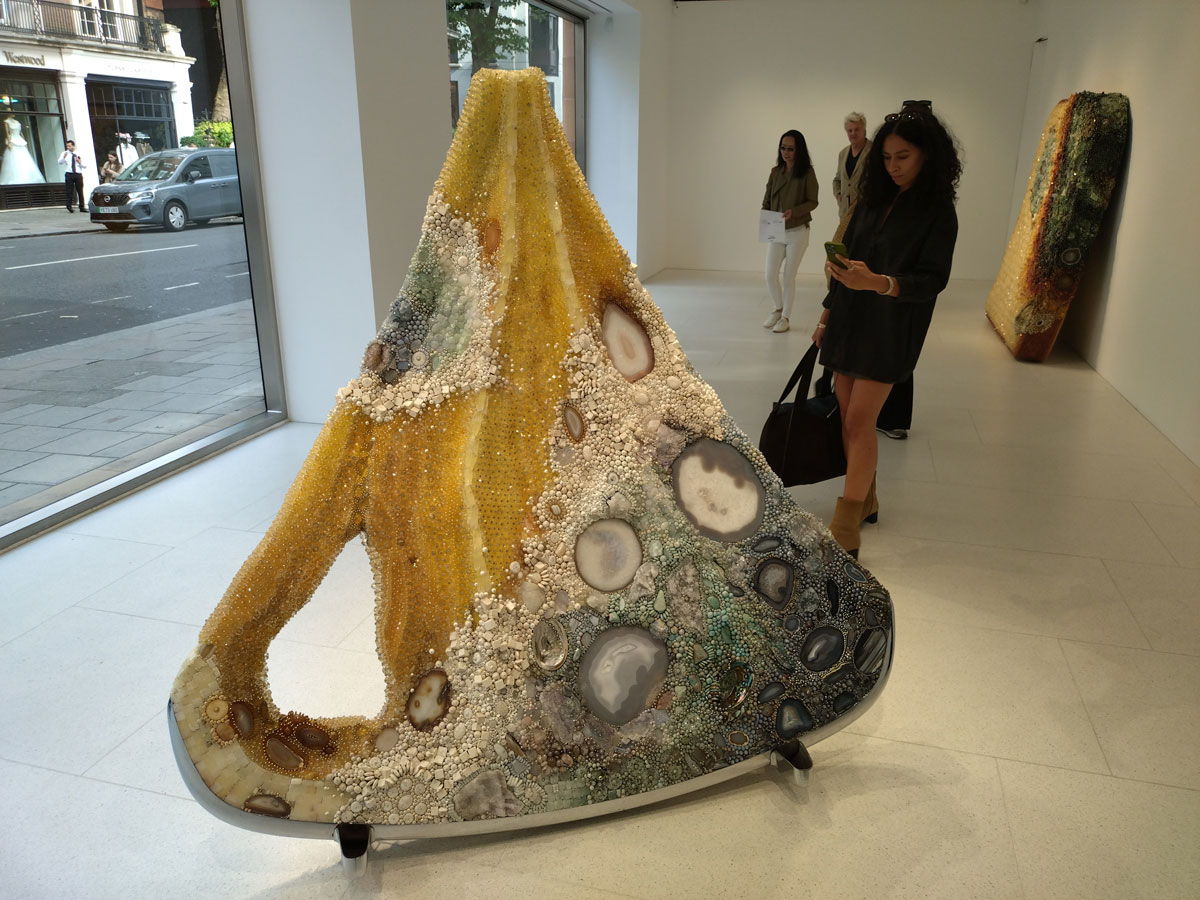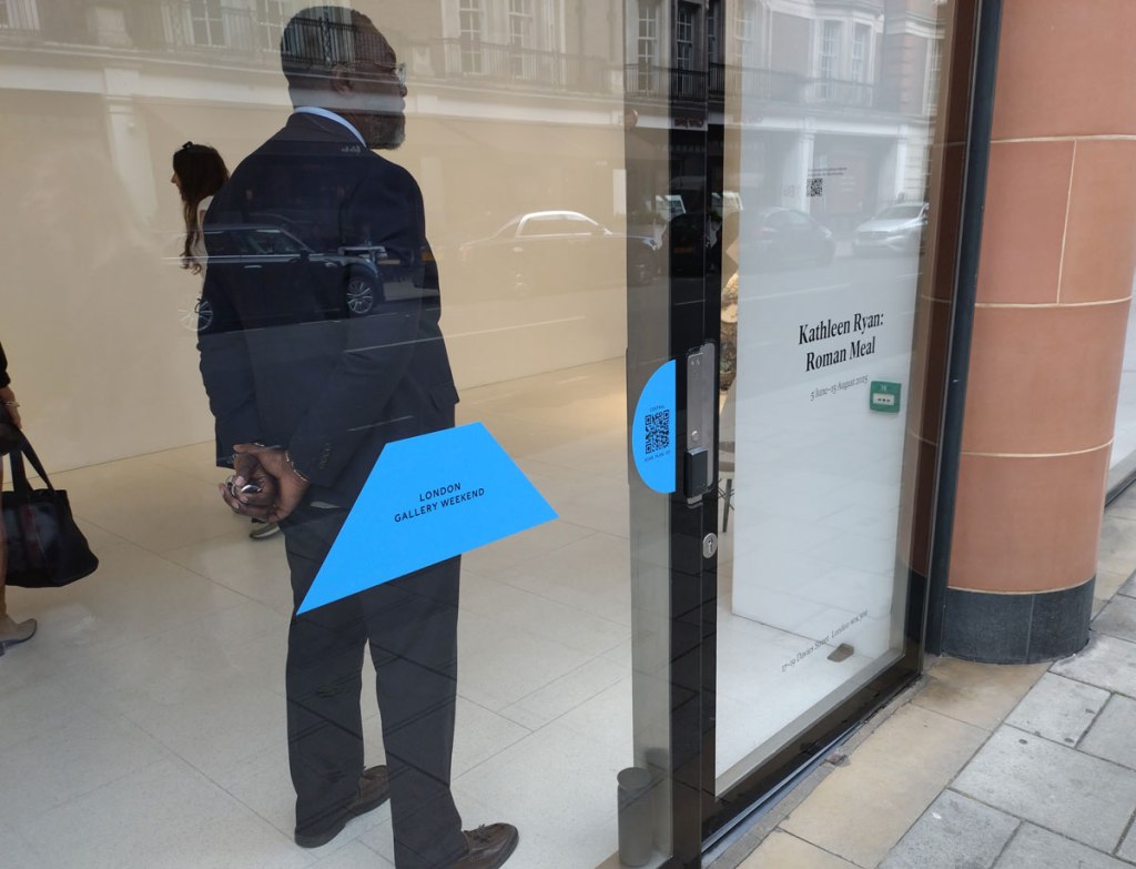There is that giant piece of toast at Gagosian‘s Davies Street space before we do actually call it a day; “Gagosian is pleased to announce Roman Meal, an exhibition of two new sculptures by Kathleen Ryan at 17–19 Davies Street, London. In this, her solo debut at the gallery, Ryan mines ideas of utility and excess, luxury and repulsion, pondering culture’s inherent state of perpetual transformation while maintaining an appealing sense of the absurd” – and here we are in a street full of expensive car shows and Vivienne Westward shops, we’ve just passed something horrendous, by far the worst piece of art seen today, a Damien Hurst piece that’s luridly shouting at the selfie-takers posing in front of it in the big brash auction house window that it currently resides in and I guess this is the perfect spot of the two Kathleen Ryan pieces to be saying whatever they need to say? Whatever they are saying they are attracting a rather overdressed audience, selfies are very much the thing here in the relatively intimate Gagosian space.
