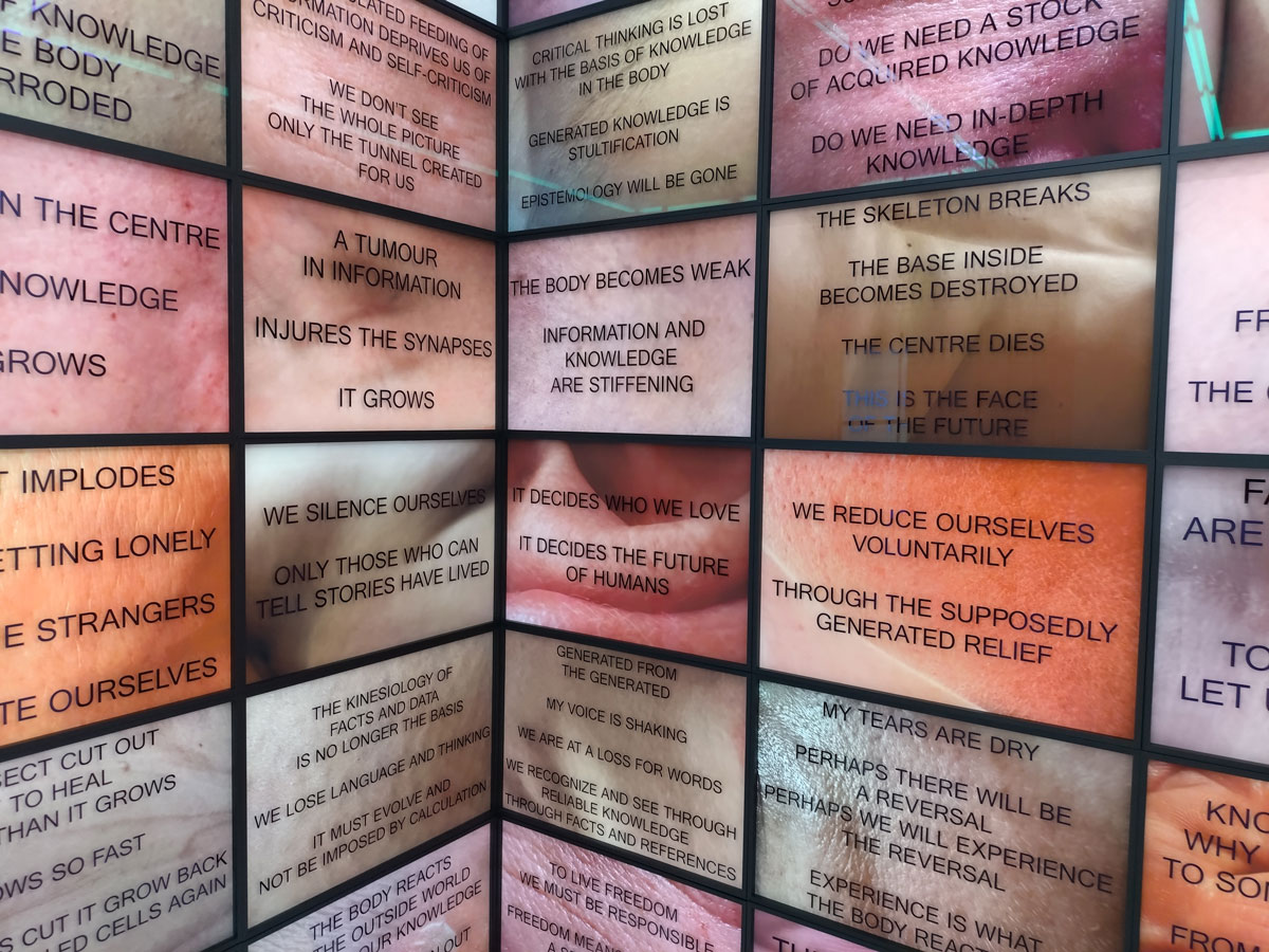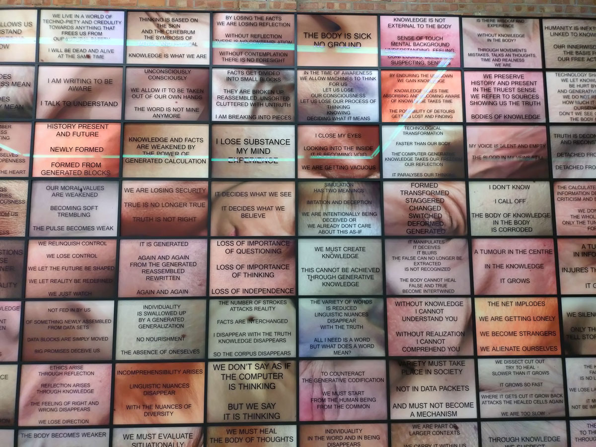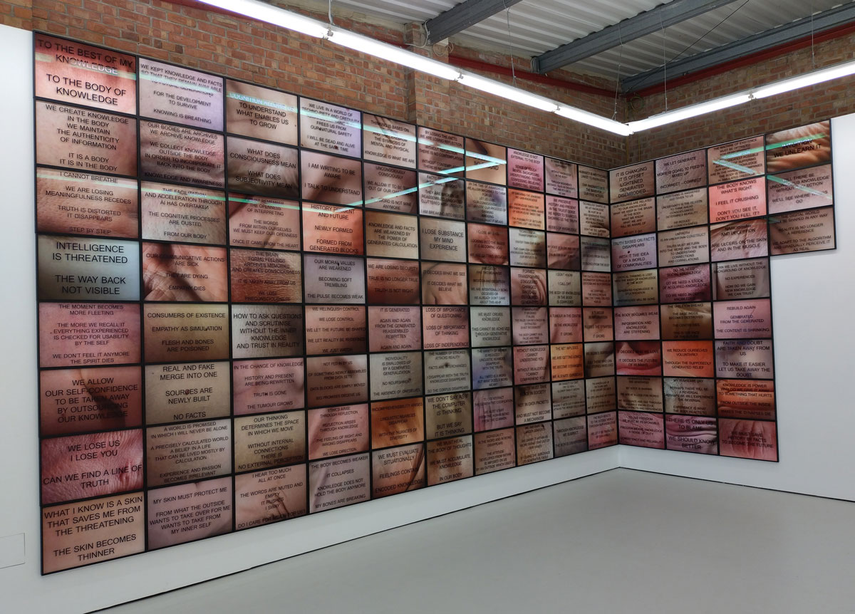 “The text is written between hurt, warning, worry, disappointment and physical reaction. I believe that this loss of knowledge in the body is a central theme of our time and a catastrophe that is only just beginning but threatens our humanity enormously (in addition to the climate and wars and the current world situation), so I consider the work to be quite important in my discourse and also a question of where we are developing as human beings, also away from each other. The importance and urgency of the topic is also clear from the number of framings, I think we are heading towards a problem that unfortunately the majority of people are underestimating, but will soon no longer be reversible, if at all possible now, so we have to speak up now and address this problem”