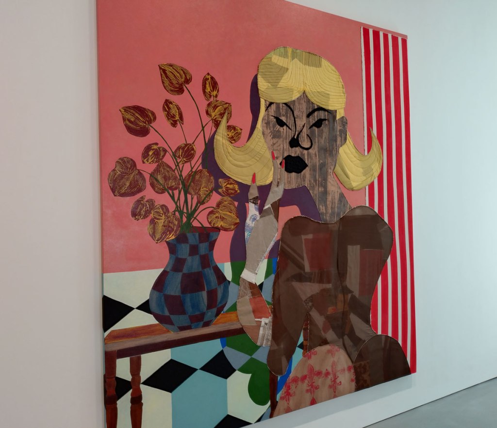 Mickalene Thomas brings a vibrant and layered approach to all-over composition, using collage, photography and sculptural surfaces to infuse her paintings with a palpable sense of motion. In her Tete de Femme series (translated as ‘head of a woman’), Thomas merges 20th-century Cubism and contemporary pop references, playing with the formal qualities of portraiture whilst simultaneously reclaiming and reimagining representations of Black femininity and beauty. Thomas’s geometric collaged cut-outs shimmer with energy as materials reflect layers of movement across the picture plane. Rather than focusing on a single subject or element, her paintings invite viewers to engage with every part of the surface, absorbing a complex interplay of patterns, textures and forms”.