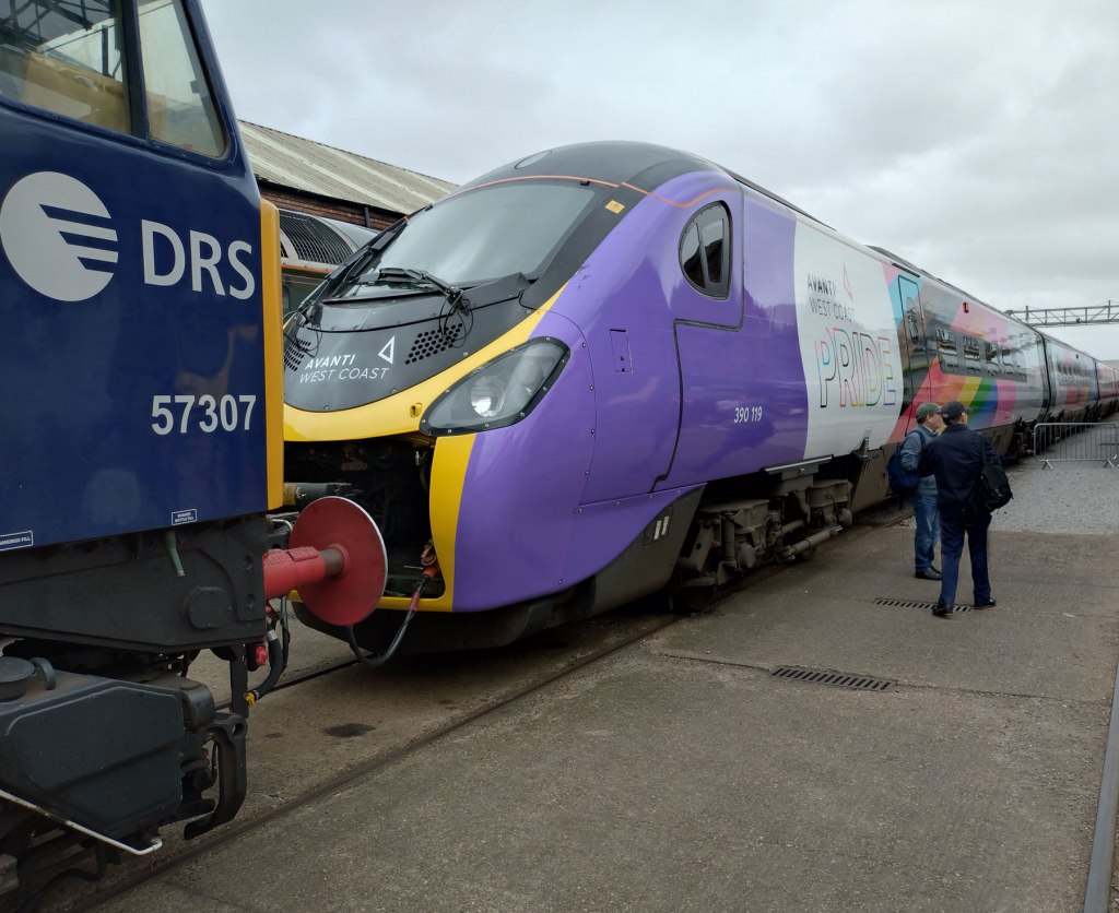 Art? Music? Underculture? Of course it is! Listen to that gloriously filthy sound of that Tractor firing up (that’s a Class 37 to you and me, a still serving, still working diesel locomotive from the 1960s). We’re here to admire an almost reborn Baby Deltic, to take in the smell of the smoke of Clan Line and while we’re at it, to make some sound art and record some of it. A proposal to make some art resulted in an invitation from Alstom for us to come to the event and to grab some field recordings, to point microphones, to spend a day at the Greatest Gathering enjoying railway engines and making art (as well as leaving a piece or two, well we couldn’t go all the way to Derby without leaving leaves. Watch this space, the sound from the day comes soon). Hey, I could write a massive piece on this great gathering, trains are cool, everyone knows that, a could go on for way too long about how good those Peaks looked all lined up on that curve, about those 40s and that (hidden) Hymek, about design and logos and typefaces and shed plates, about the art of noise and where were the 20s? Those 20s sound so so good, a bit like the 40s, alas the 40s were silent as well, there no better sounding locomotive than an idling 40 waiting to just do what they were built to do. Yes, I could write a massive piece about how upliftingly good that Avanti West Coast Pride Pendolino looks in that full train rainbow wrap – a full car, look at that Duster! How things have changed – the 390 Pendolino is Alstom built I do believe? I could write a massive piece on all the traction action and how damn cool it all was, the culture of it all, the art of that beautiful blue 1937 Gresley designed A4 stood over there in the open air, of that British Rail “Double Arrow” logo designed by Gerry Barney in 1964 (although really not sure about that new Great British Railways Union Jack version of it that’s on the way any day now?). I could write a massive piece about The Greatest Gathering, besides the six hours a day opening time not really being enough to see it all and an engine or two being rather strangely parked out of view (what was that Hymek almost lost behind the fence all about?), beside a couple of relatively minor things, this was a brilliant event, a glorious celebration, a wonderful gathering of railway traction, of people, art, sound, design and lots more.
