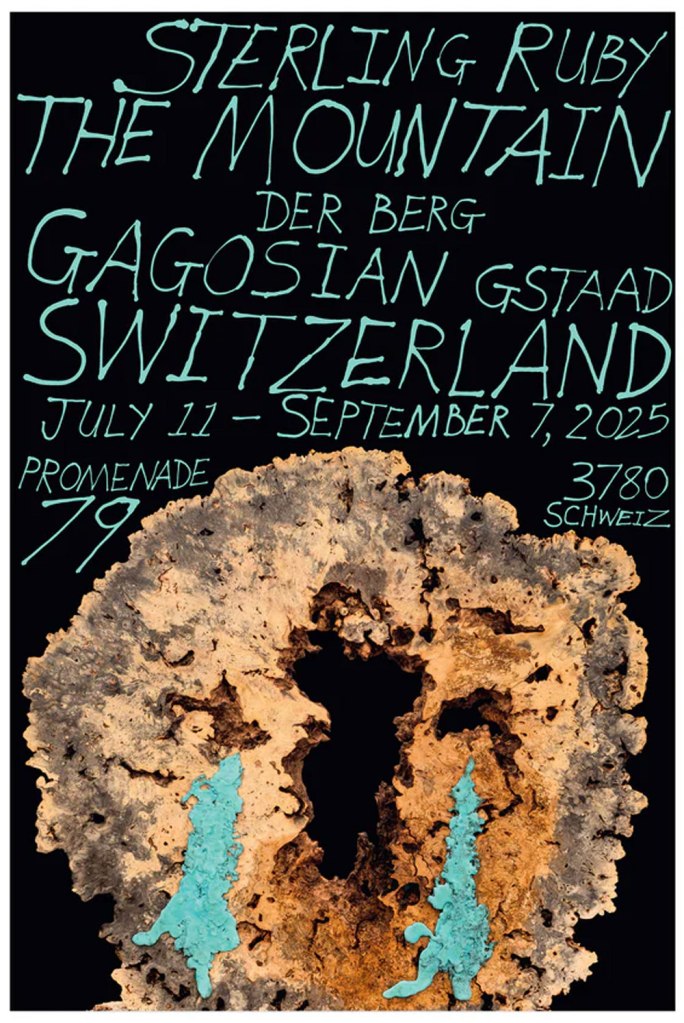 5: Sterling Ruby – This poster featuring Crying Slab (2025) was produced in 2025, in conjunction with artist Sterling Ruby, a poster for Sterling Ruby: The Mountain at Gagosian, Gstaad. The exhibition – the details of which are inscribed on the poster by the artist – included new sculptures and paintings conceived by Ruby “in dialogue with the Romantic tradition of the sublime. Rooted in the artist’s time in California’s Eastern Sierra, the works explore themes of germination, birth, growth, and decay. Crying Slab is a monolithic wood burl sculpture adorned with puddled bronze tears. Its intricate, altar-like form is evidence of the tree’s long struggle to cope with infection, thus embodying themes of trauma, resilience, fragility, and endurance. Crying Slab also borrows from Surrealist animism to reflect Ruby’s interest in myth and mutation” and I just really like Sterling Ruby’s work. Over here we rather like this just as a poster, just as a piece of work in itself (you can find a copy here)