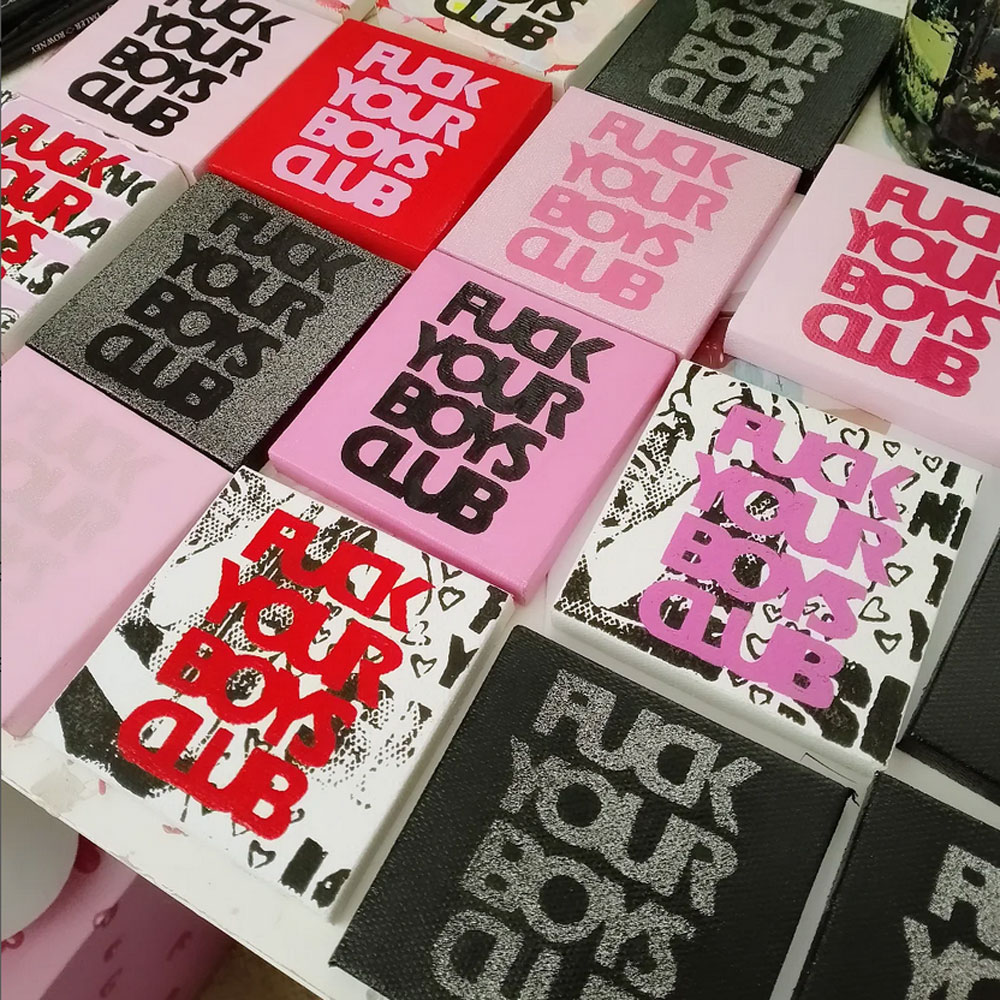 Emma Harvey has produced these small in size but big in sentiment 7.5cm acrylic on canvas series especially for the Art Car Boot Fair September event(s). “Some feature my linocuts printed as backgrounds, others I’ve used glitter spray paint, and all of them are hand painted so each one is different and unique”. I do believe there are 43 of them. Emma Harvey’s Linktree