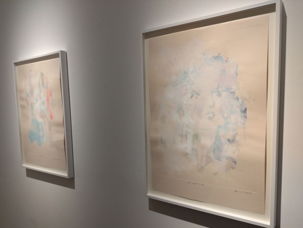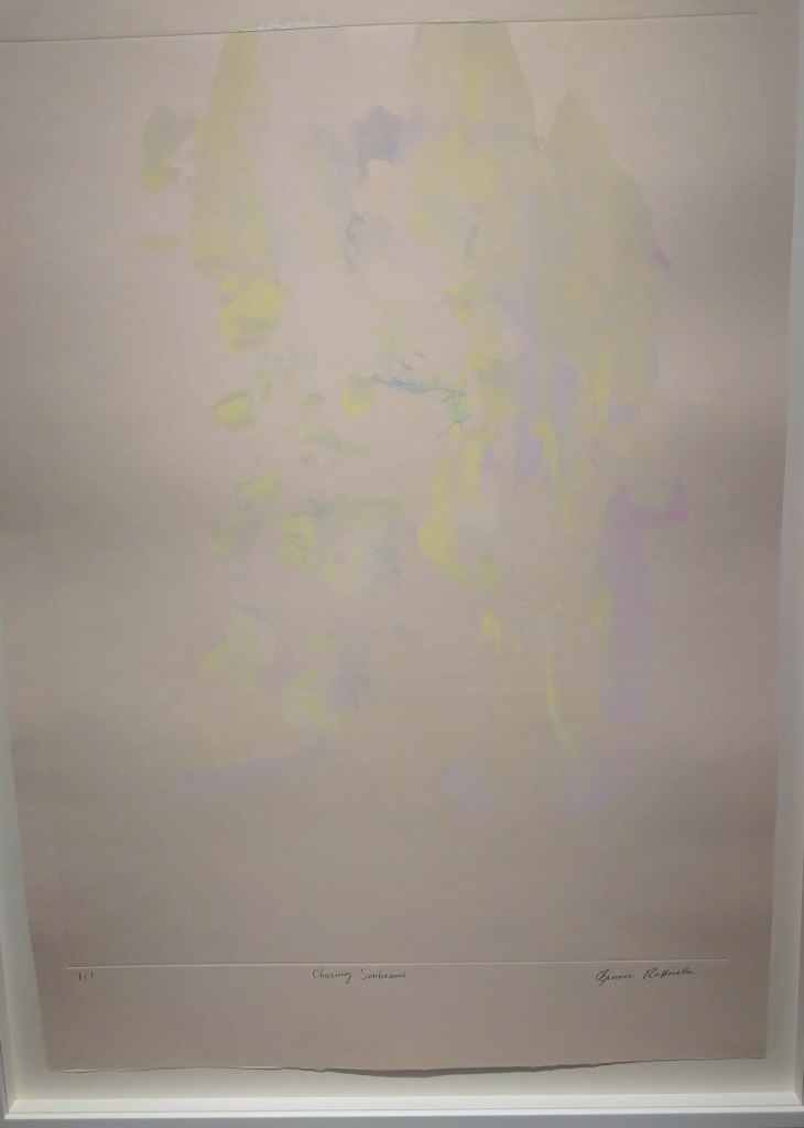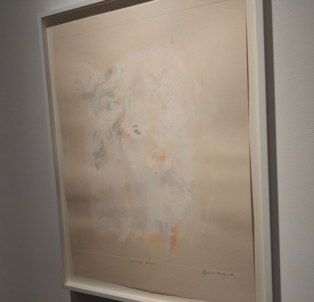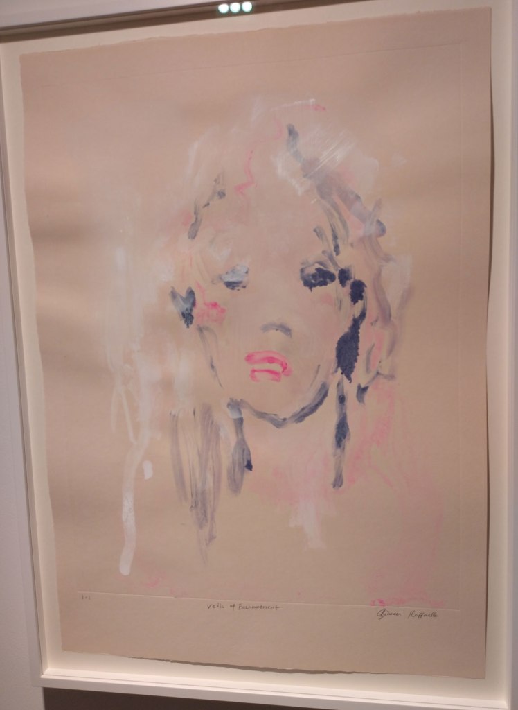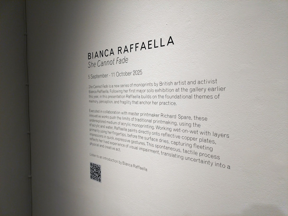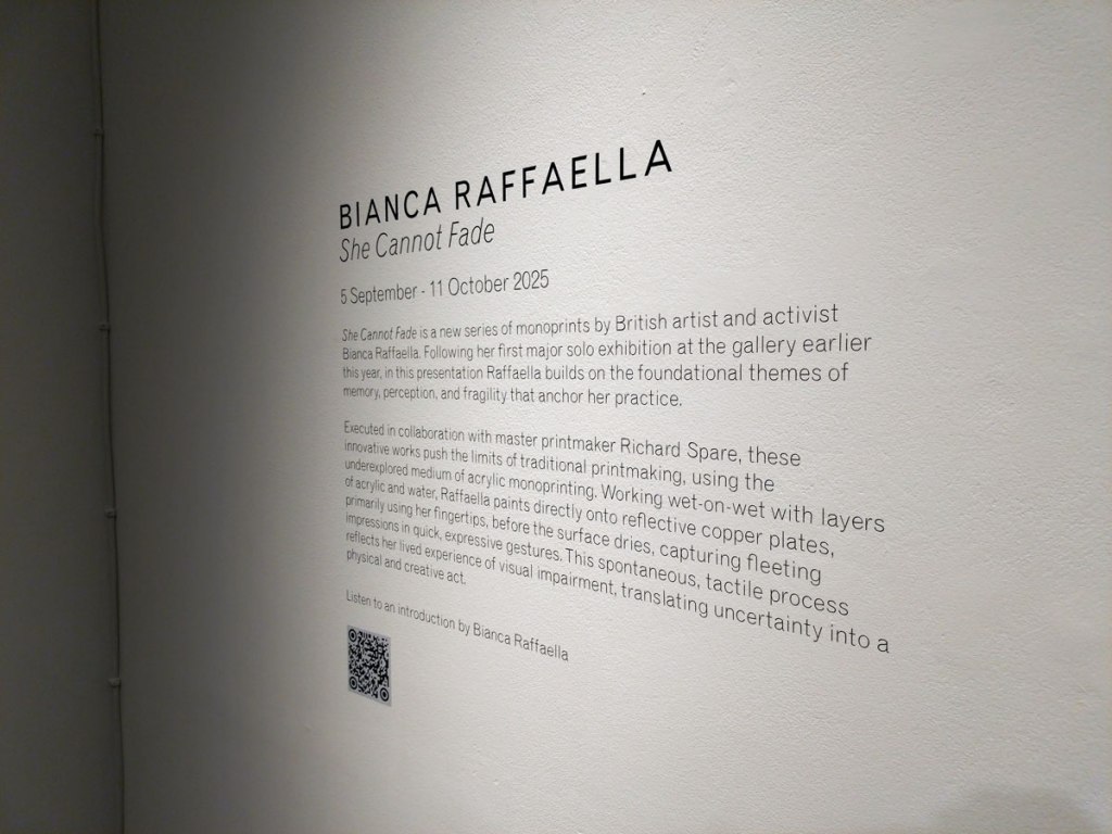 Her previous show was all about her big paintings, about seeing what Bianca Raffaella sees, about an experience that is almost impossible to share, an experience beautifully shared. This time she’s experimenting with monoprints, collaborating, well it looks more like a helping hand than a collaboration; “Following her first major solo exhibition at the gallery earlier this year, the latest presentation will see Raffaella build on the foundational themes of memory, perception, and fragility that anchor her practice. Executed in collaboration with master printmaker Richard Spare, these innovative works push the limits of traditional printmaking, using the under-explored medium of acrylic monoprinting. Working wet-on-wet with layers of acrylic and water, Raffaella paints directly onto reflective copper plates, primarily using her fingertips, before the surface dries, capturing fleeting impressions in quick, expressive gestures. This spontaneous, tactile process reflects her lived experience of visual impairment, translating uncertainty into a physical and creative act”