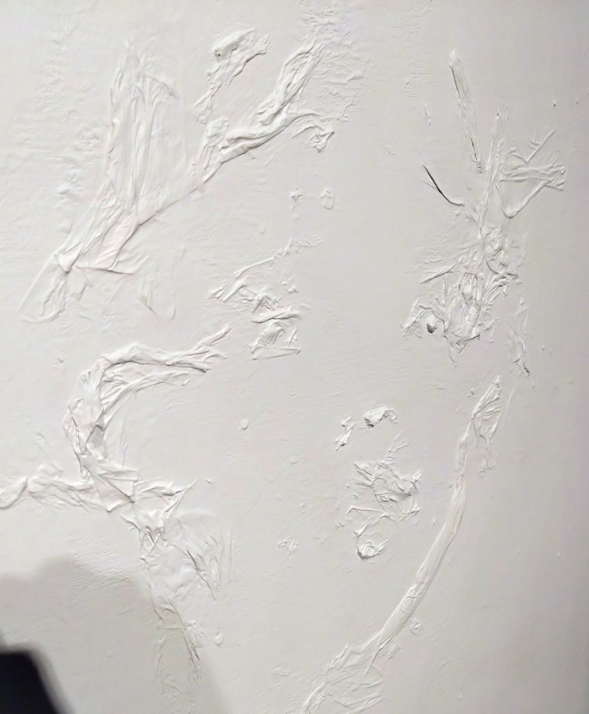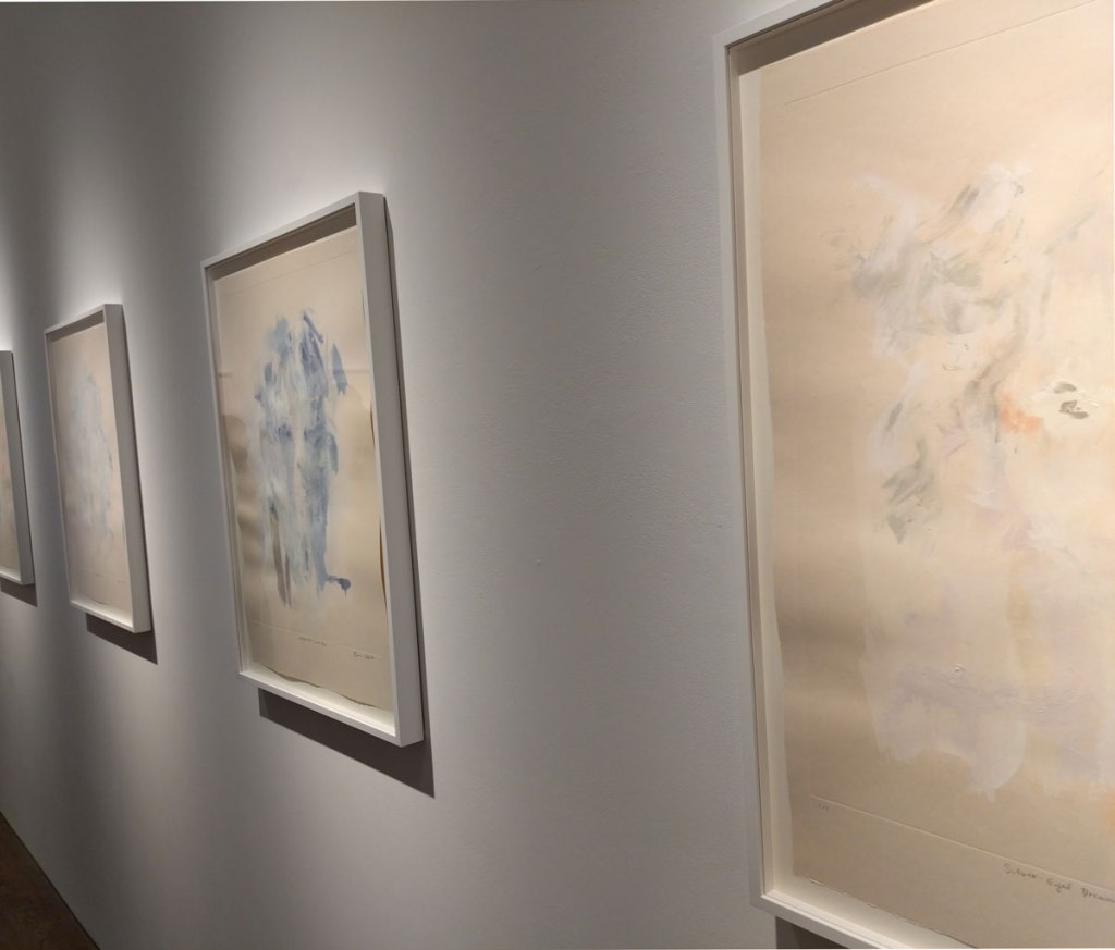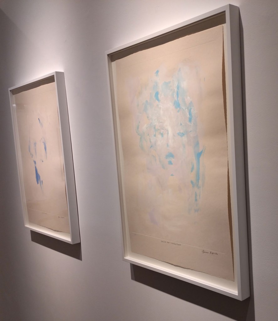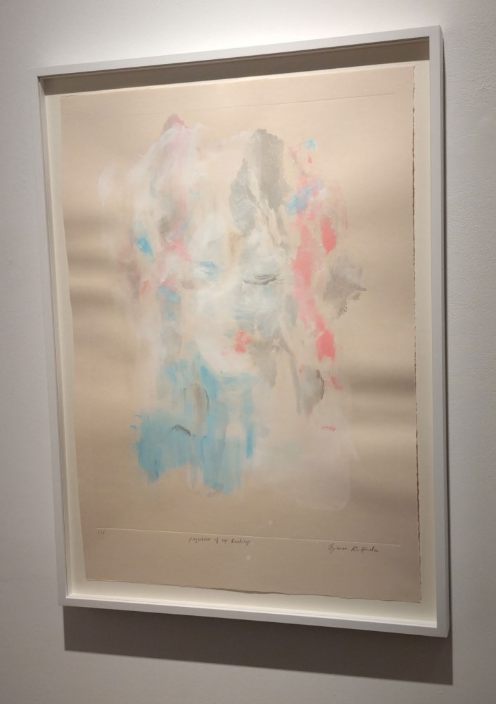 – I do rather like that she’s now experimenting with her (already) found painterly language, that she’s already needing to push on, to push further, to see as it were, to see what she can do as an artist. Not sure how well this show works if this is your first real life encounter with her work, if you don’t know Bianca Raffaella’s background, but then maybe it does? I’ve been to her talks, I’ve listened to Tracey Emin talking about her, I’ve stood silently almost nose touching her big paintings, maybe if this is your first encounter it really works? Not sure how much the printing technique takes away from the way she directly uses paint so beautifully? I do like these pieces, i do like this show, it feels like an interesting side step. I do like that the wetness is still there, it is still very very much Bianca Raffaella and her subtle palette, her calmness, I most definitely like this show, I need to think about it, I like having to thing about it, I need to go back again now I’ve had time to digest it, she is one of my favourite painters of the last couple of years. I’m not sure if her work is fragile? it feels rather strong to me.